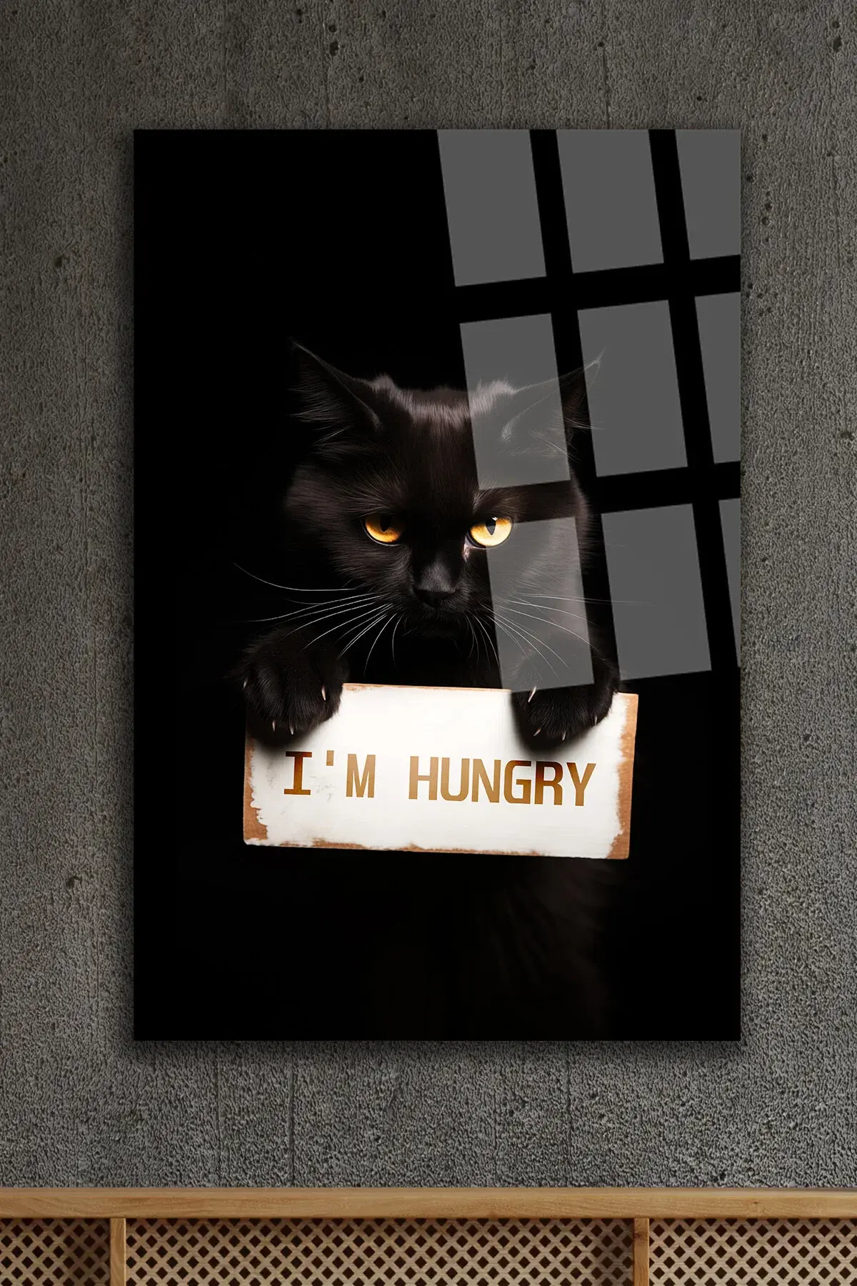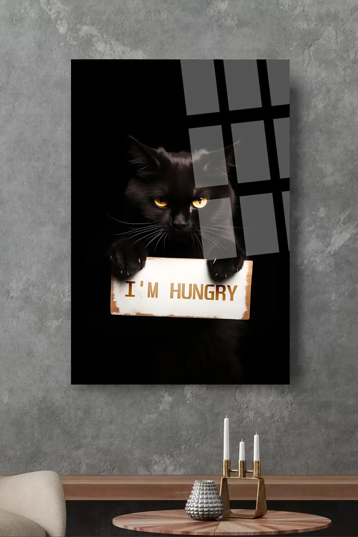 I AM HUNGRY AÇIM AÇ KEDİ ULRTA CANLI RENKİ CAM TABLO EV HEDİYESİ KIRILMAZ CAM Siyah