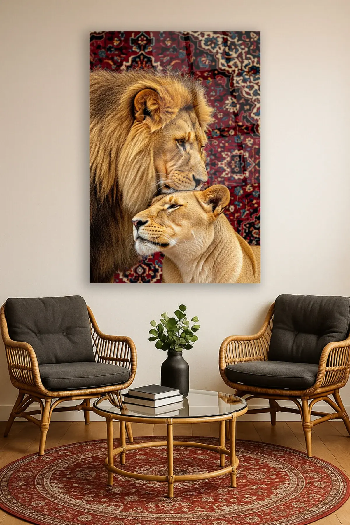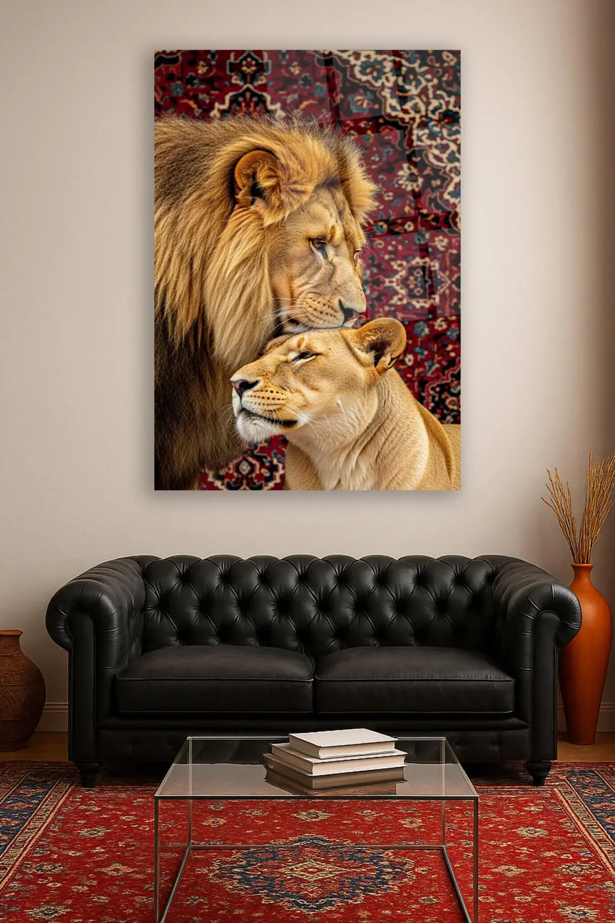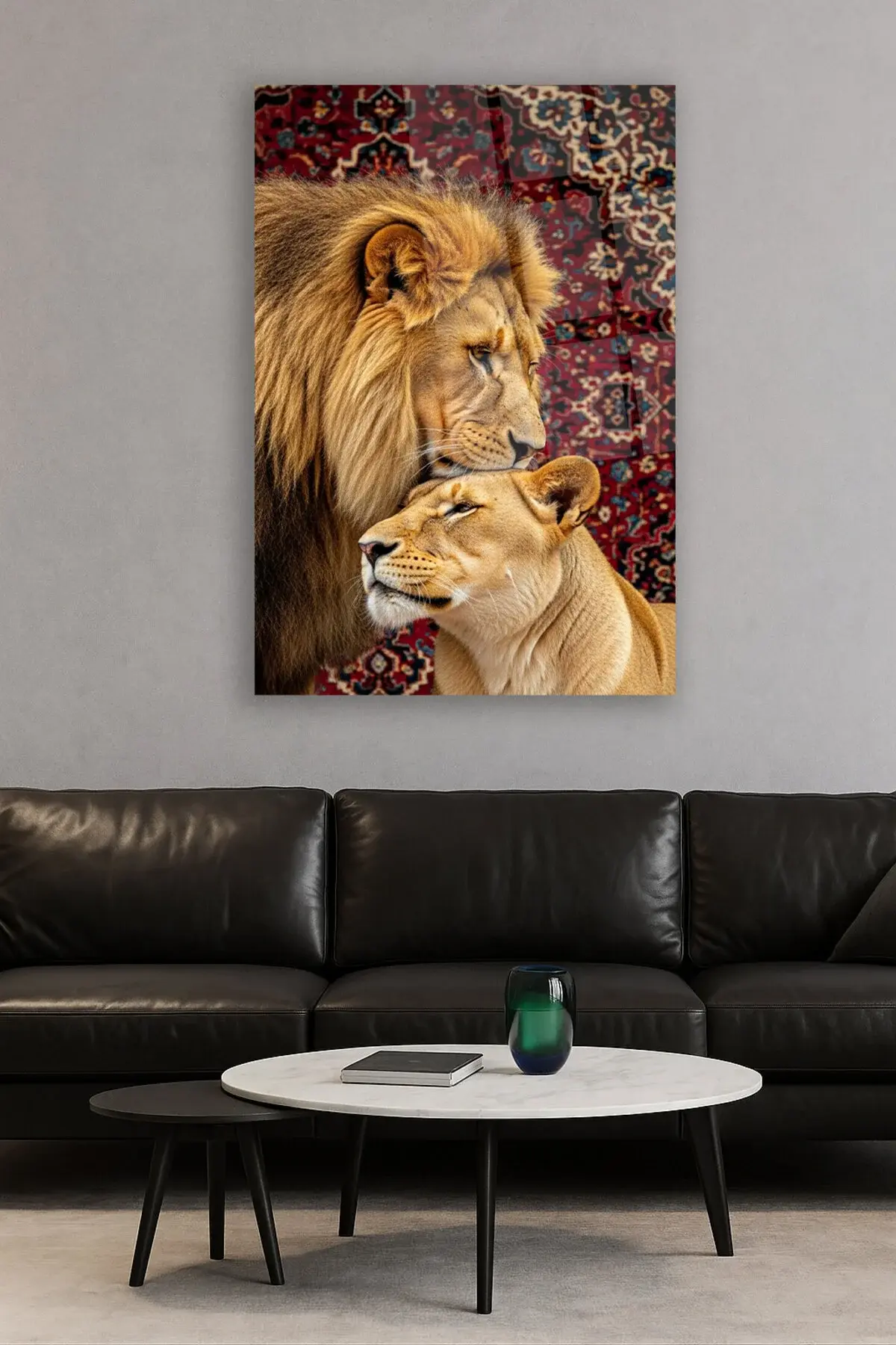 İRAN HALISI ÖNÜNDE SEVGİLİ ASLANLAR ASLAN AİLESİ CAM TABLO KIRILMAZ LÜKS CAM TABLO EV HEDİYESİ Kırmızı