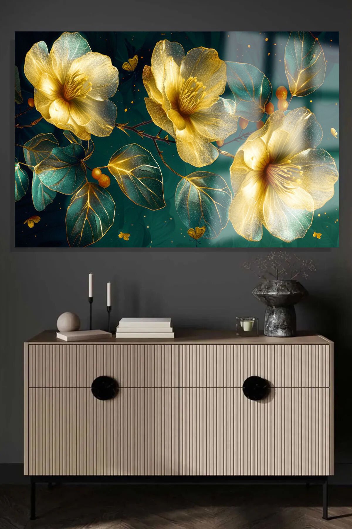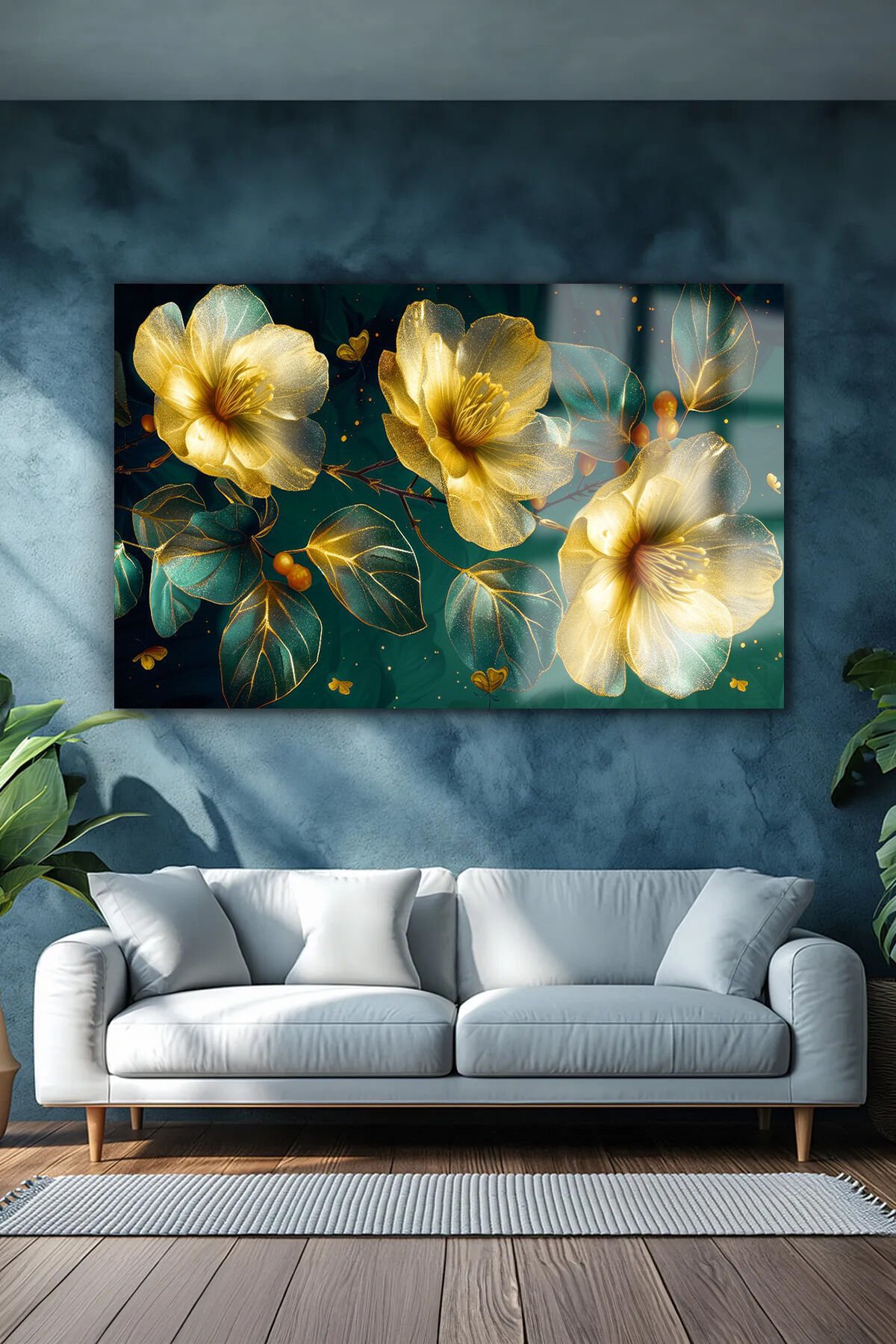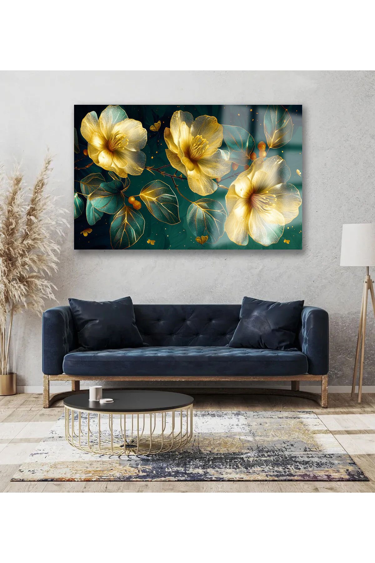 IŞIKLAR İÇİNDE GOLD YAPRAKLI YATAY CAM TABLO KIRILMAZ LÜKS CAM TABLO EV HEDİYESİ