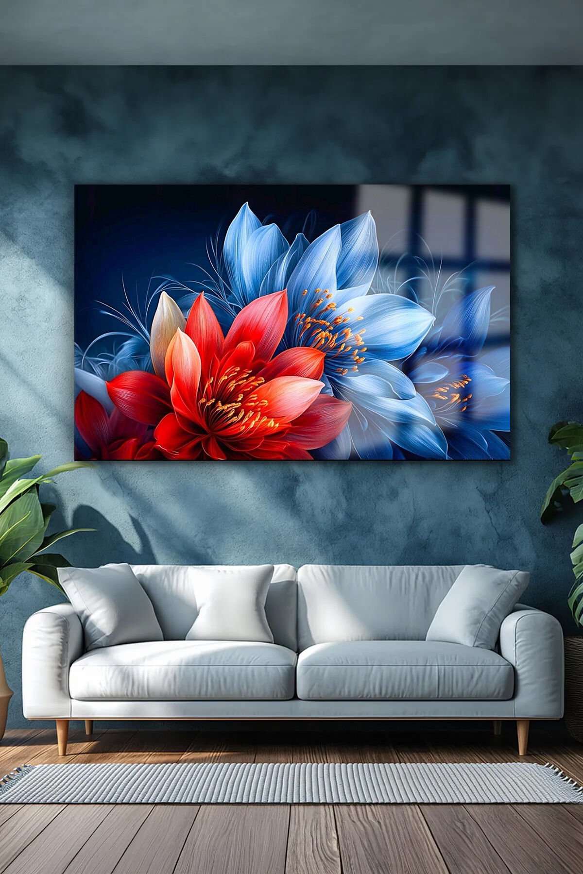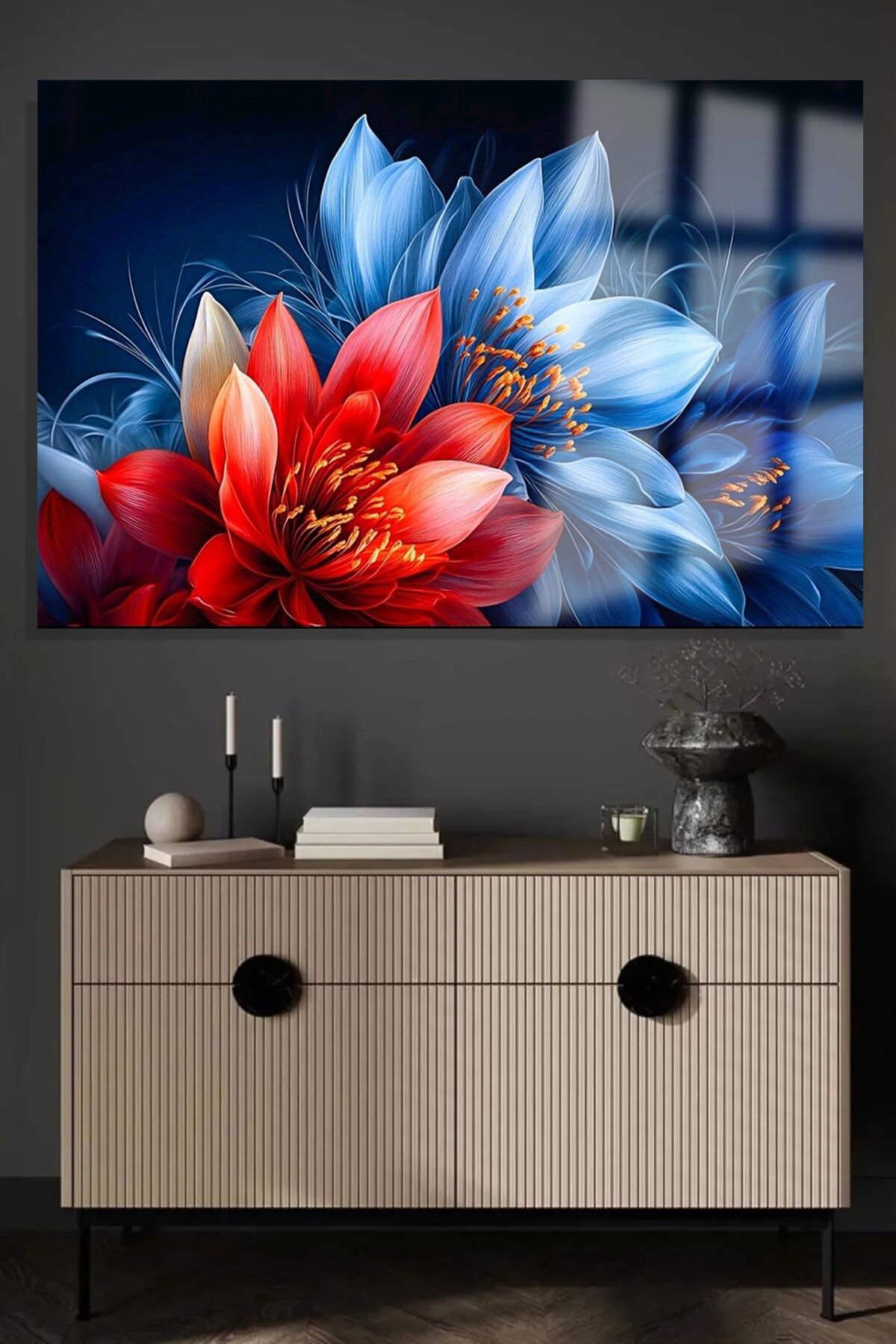 IŞIKLI KIRMIZI VE LACİVERT ÇİÇEK KIRILMAZ LÜKS CAM TABLO OF İŞ YERİ HEDİYESİ CAM TABLO