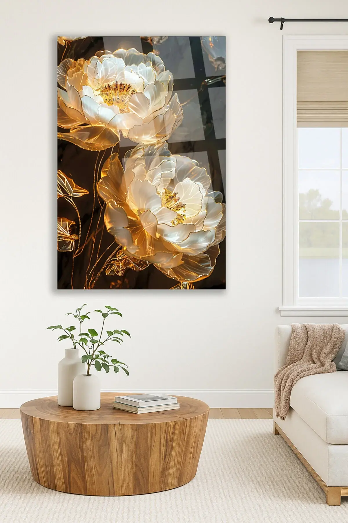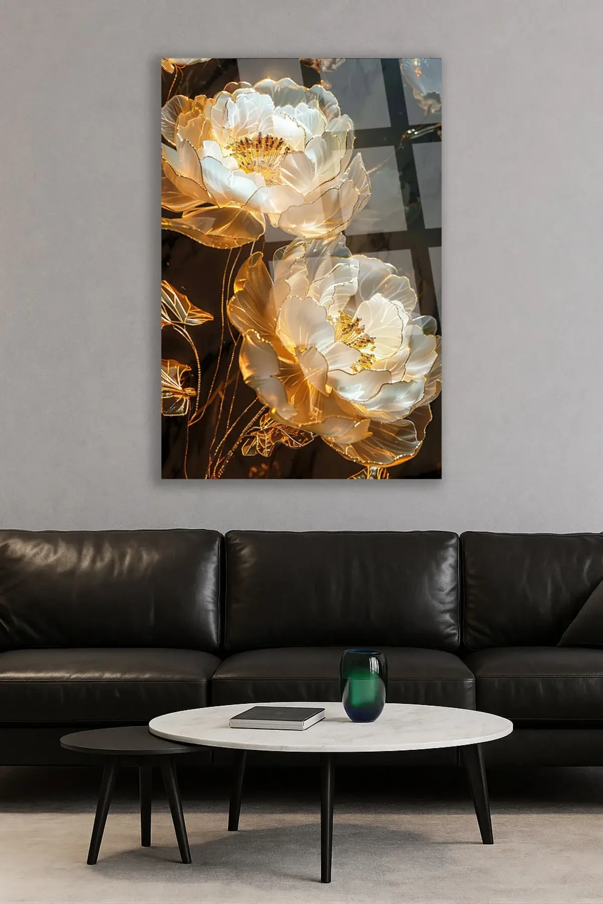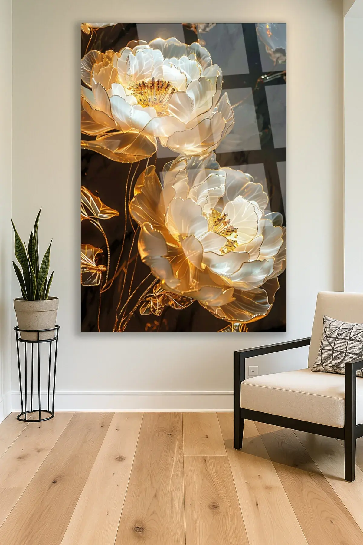 Işıltılı Altın Çiçek Desenli Kırılmaz Lüks Cam Tablo – Lüks ve Modern Duvar Dekoru Dikey Tablo Siyah