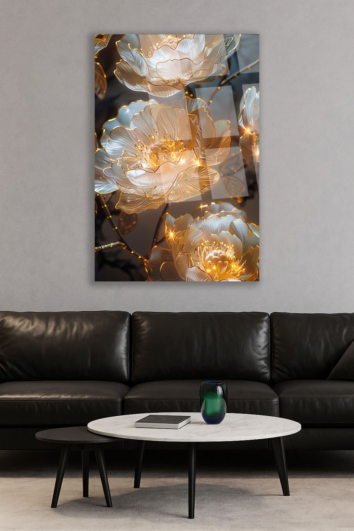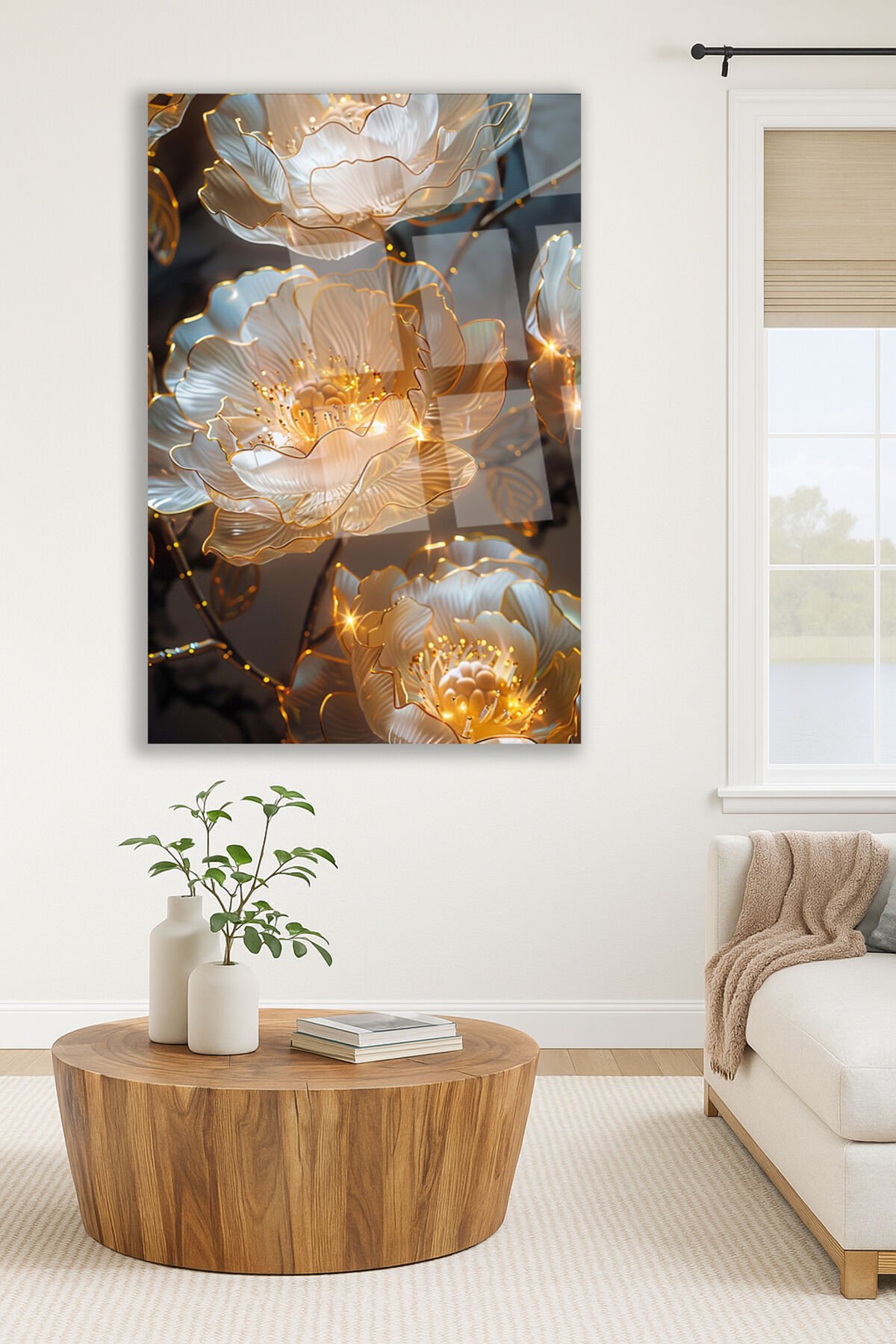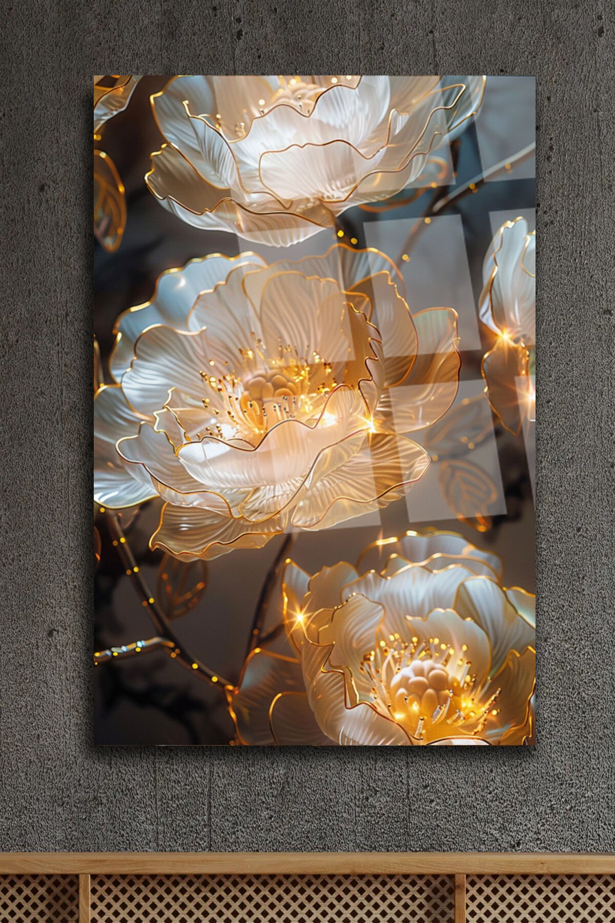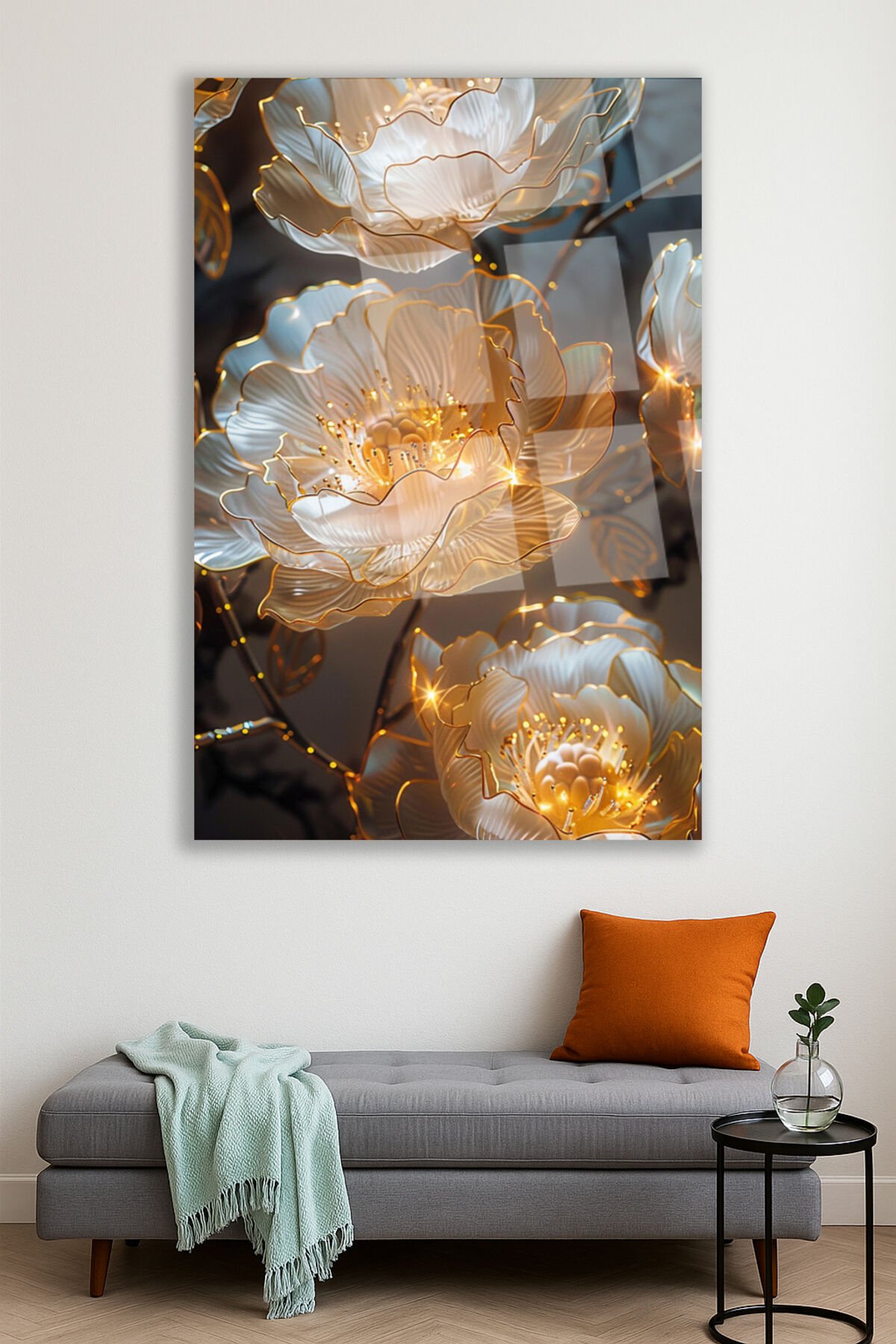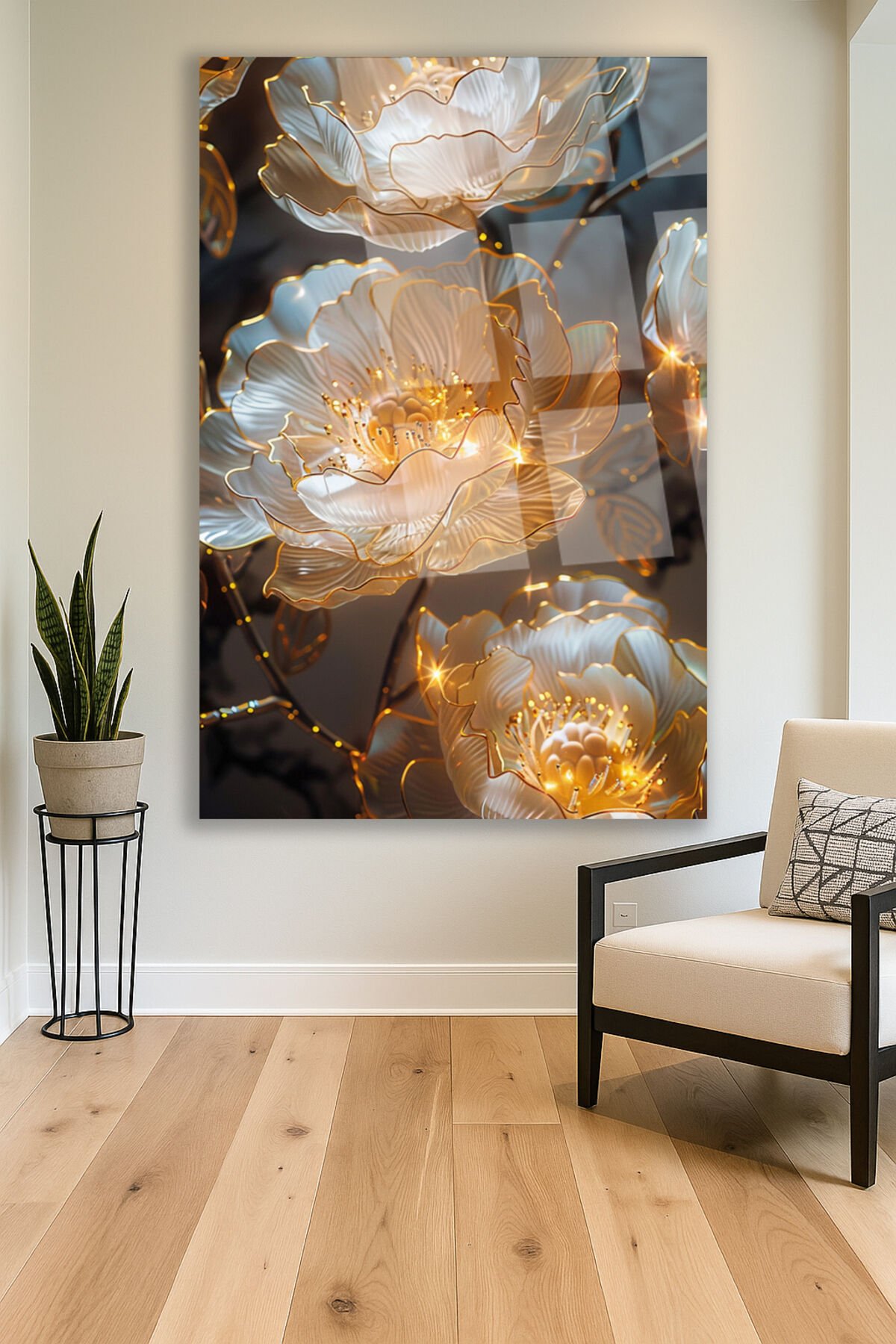Işıltılı Altın Çiçek Desenli Kırılmaz Lüks Cam Tablo – Lüks ve Modern Duvar Dekoru Dikey Tablo Krem