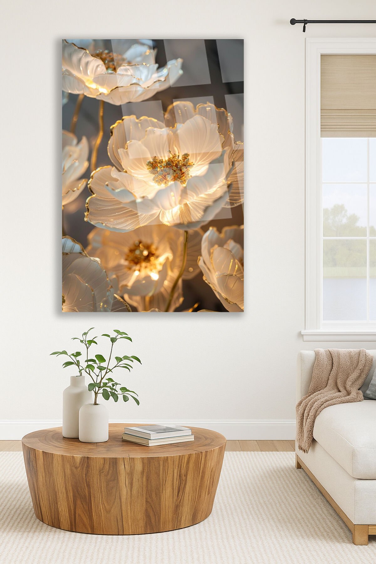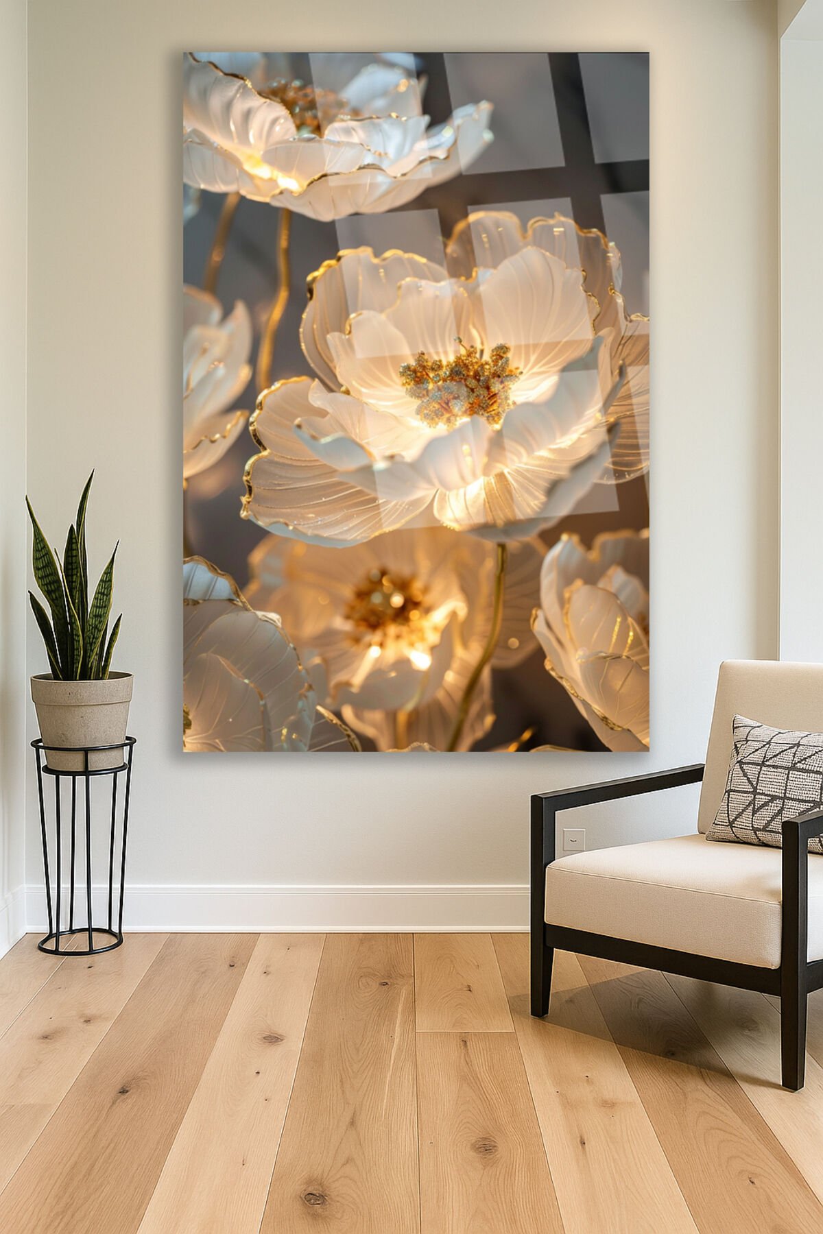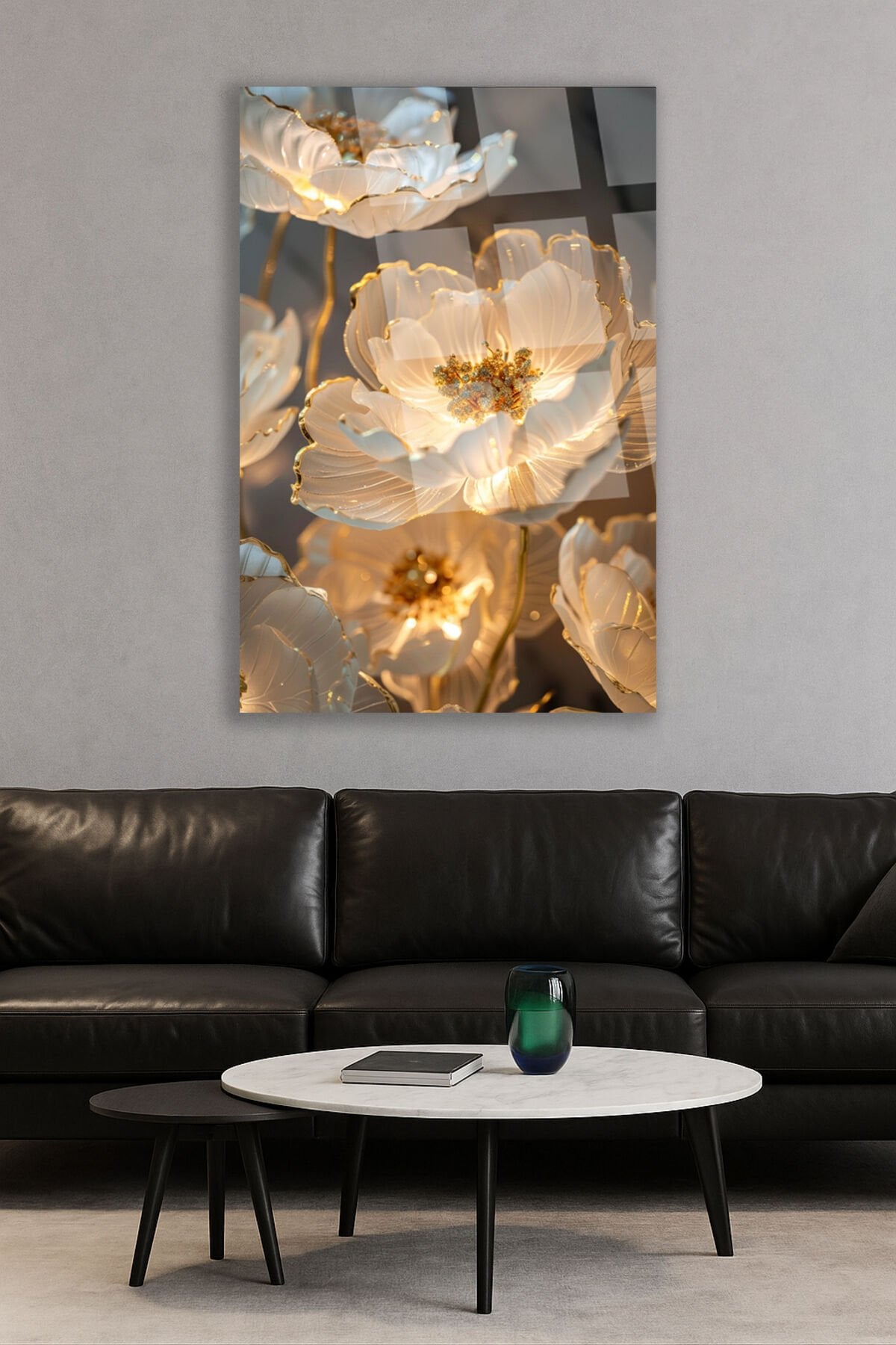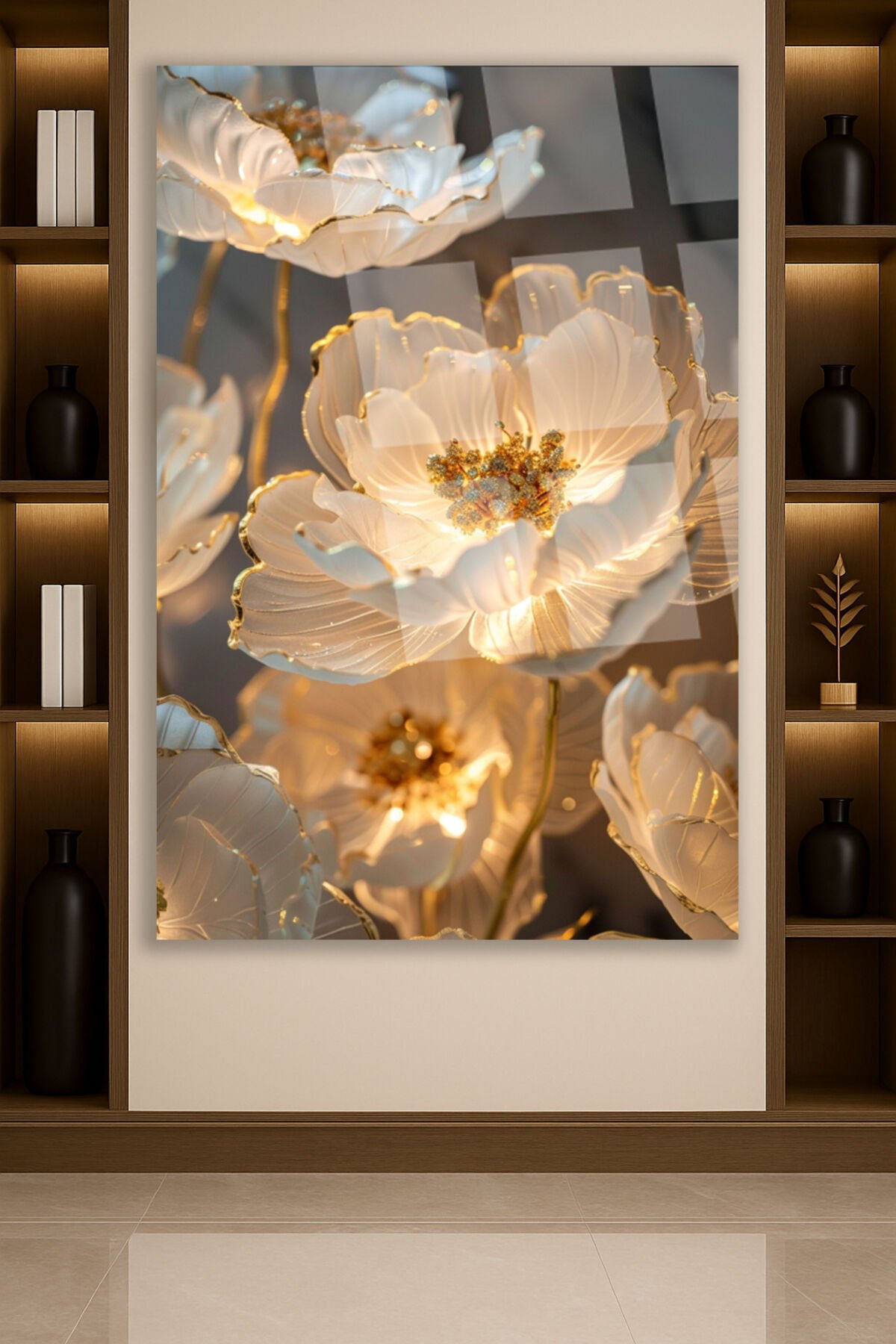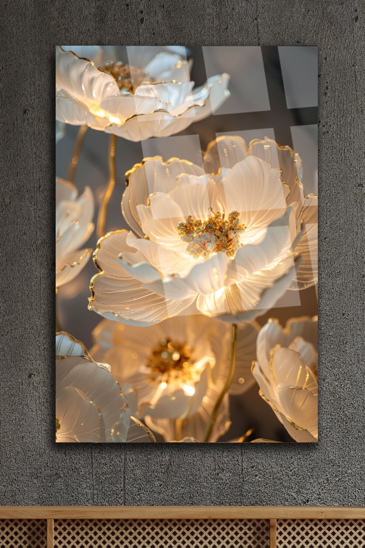Işıltılı Altın Çiçek Desenli Kırılmaz Lüks Cam Tablo – Lüks ve Modern Duvar Dekoru Dikey Tablo Krem