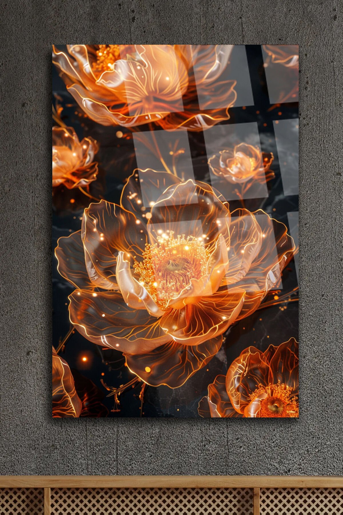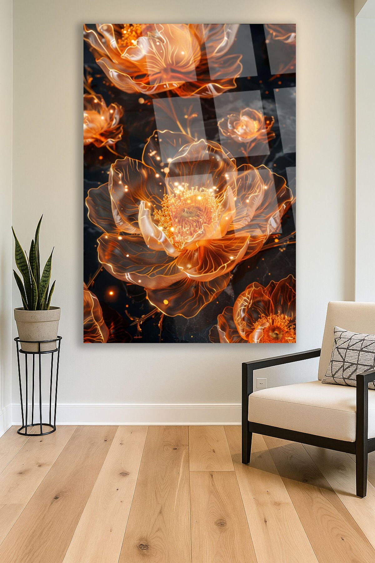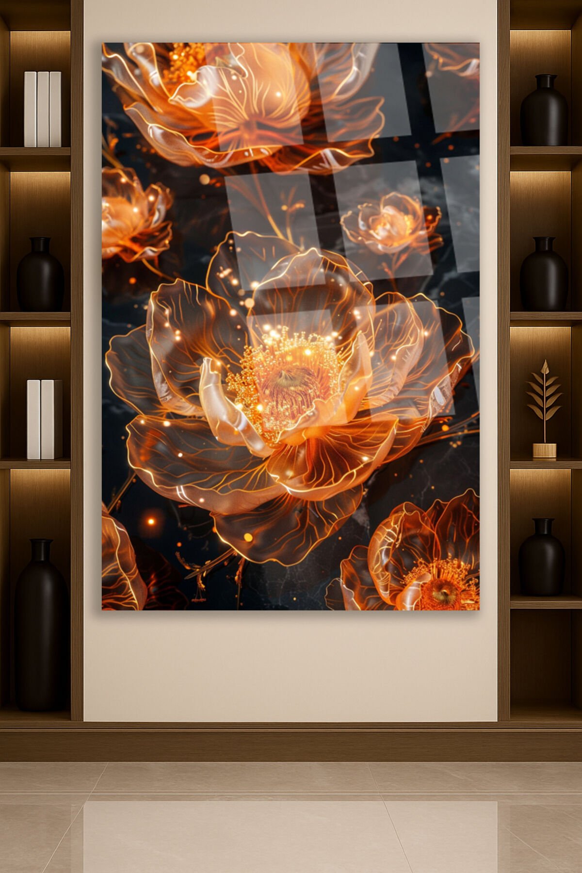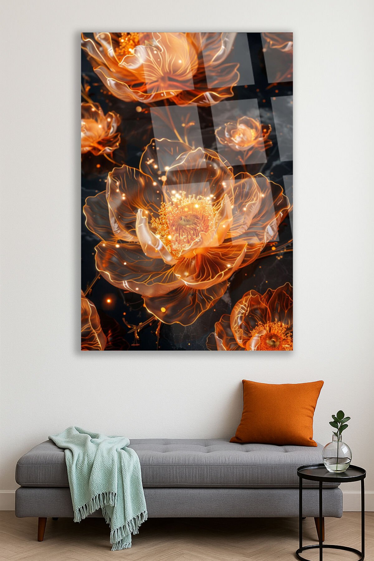 Işıltılı Altın Çiçek Desenli Kırılmaz Lüks Cam Tablo – Lüks ve Modern Duvar Dekoru Dikey Tablo Turuncu