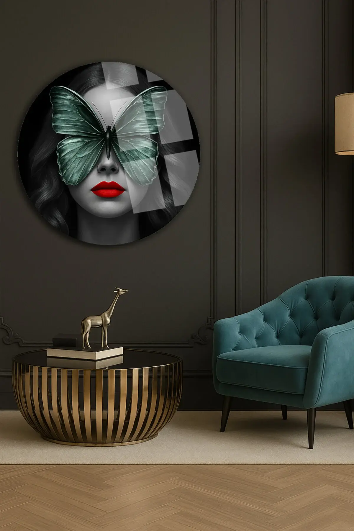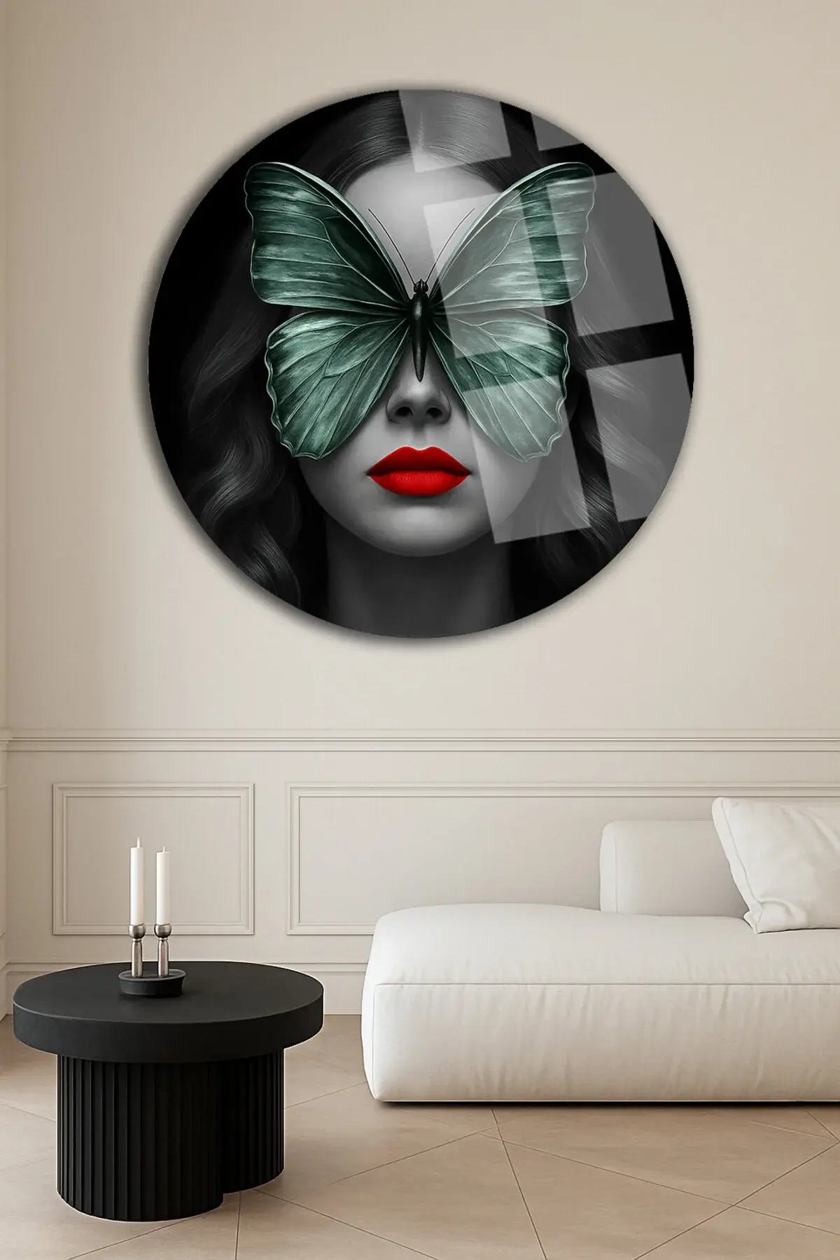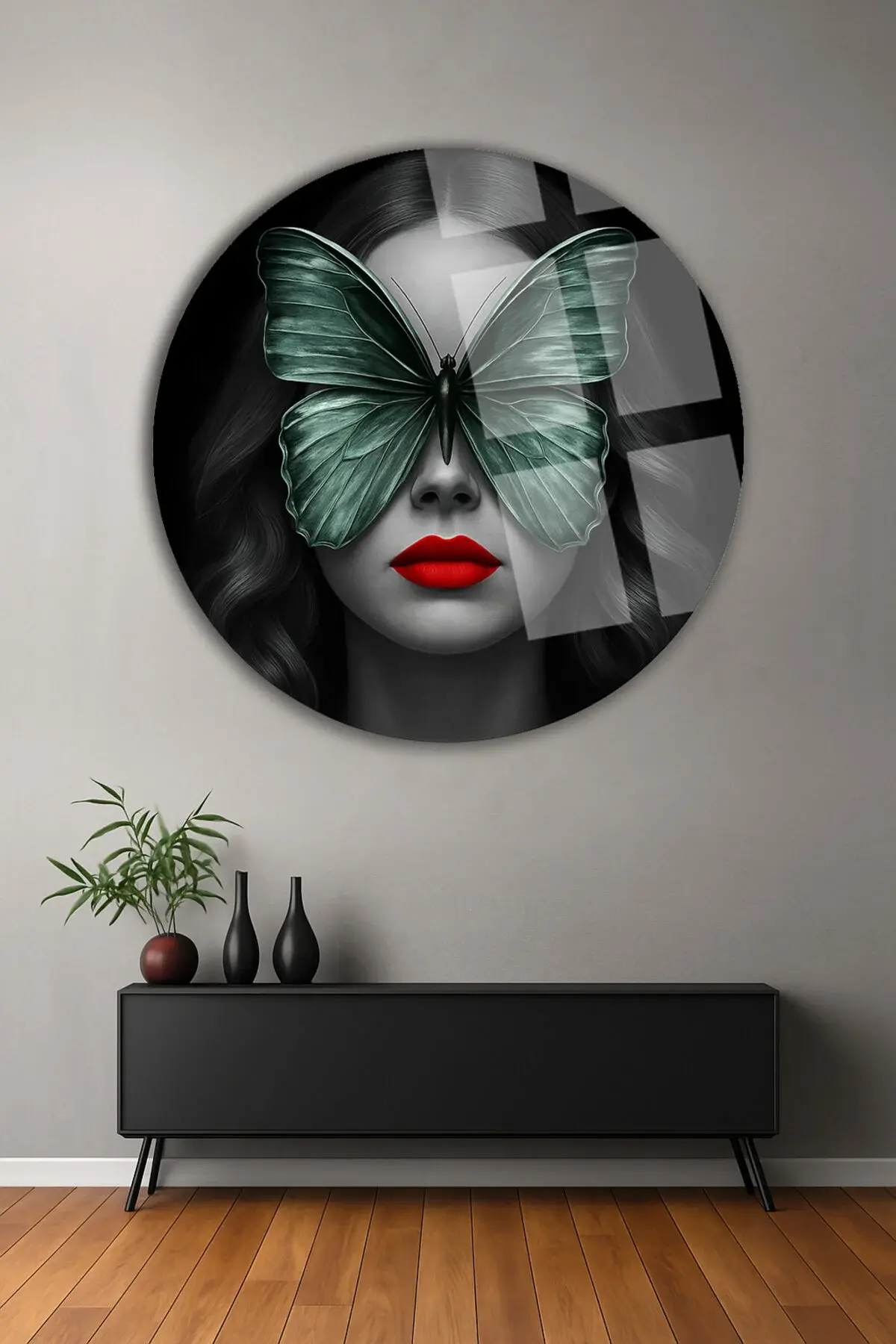 KADIN VE KELEBEK MODERN TABLO KIRILMAZ LÜKS CAM TABLO YUVARLAK CAM TABLO EV HEDİYESİ Turkuaz