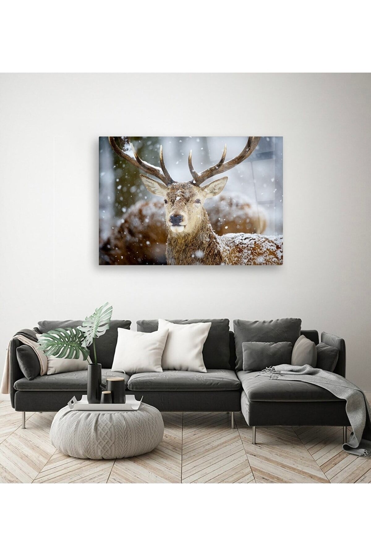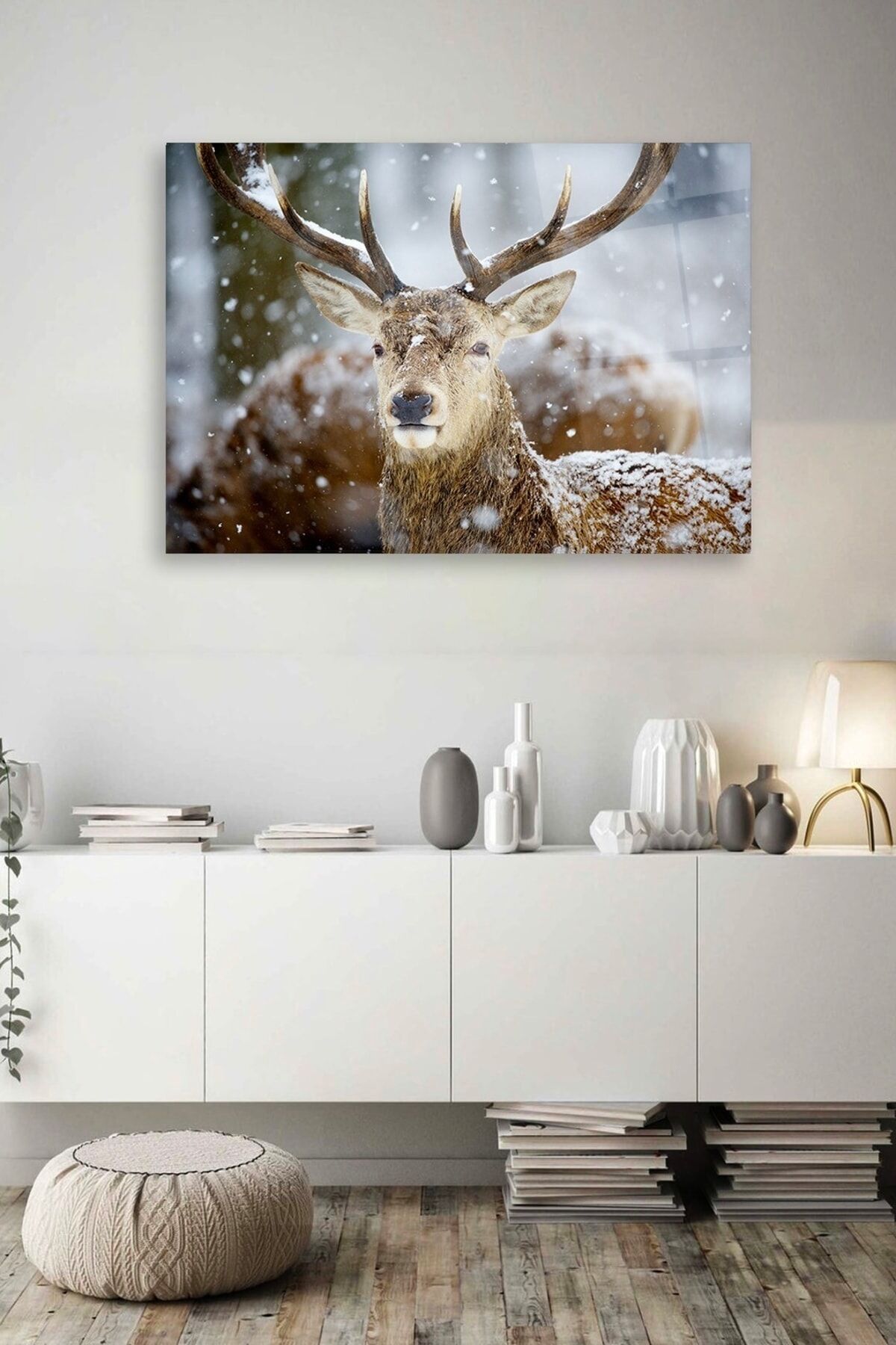 Kar Ve Geyik Cam Tablo Renkli