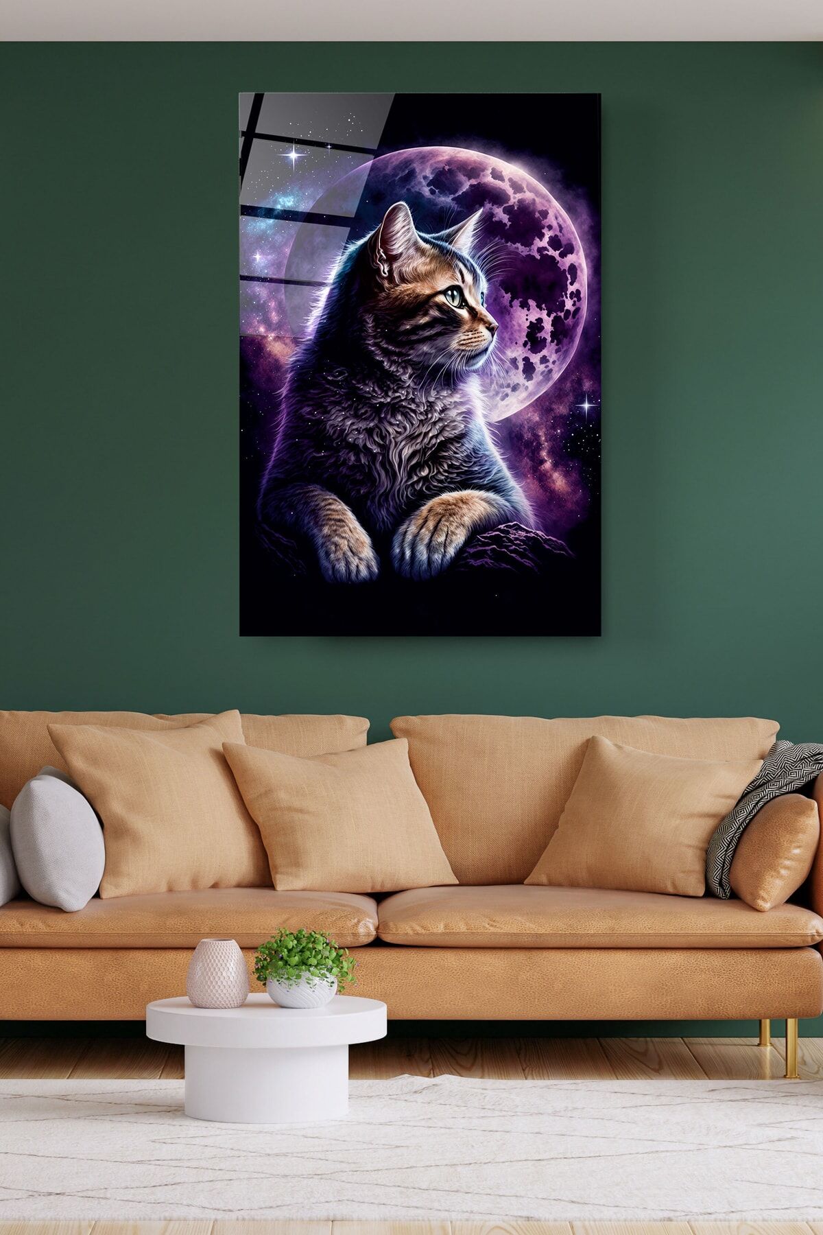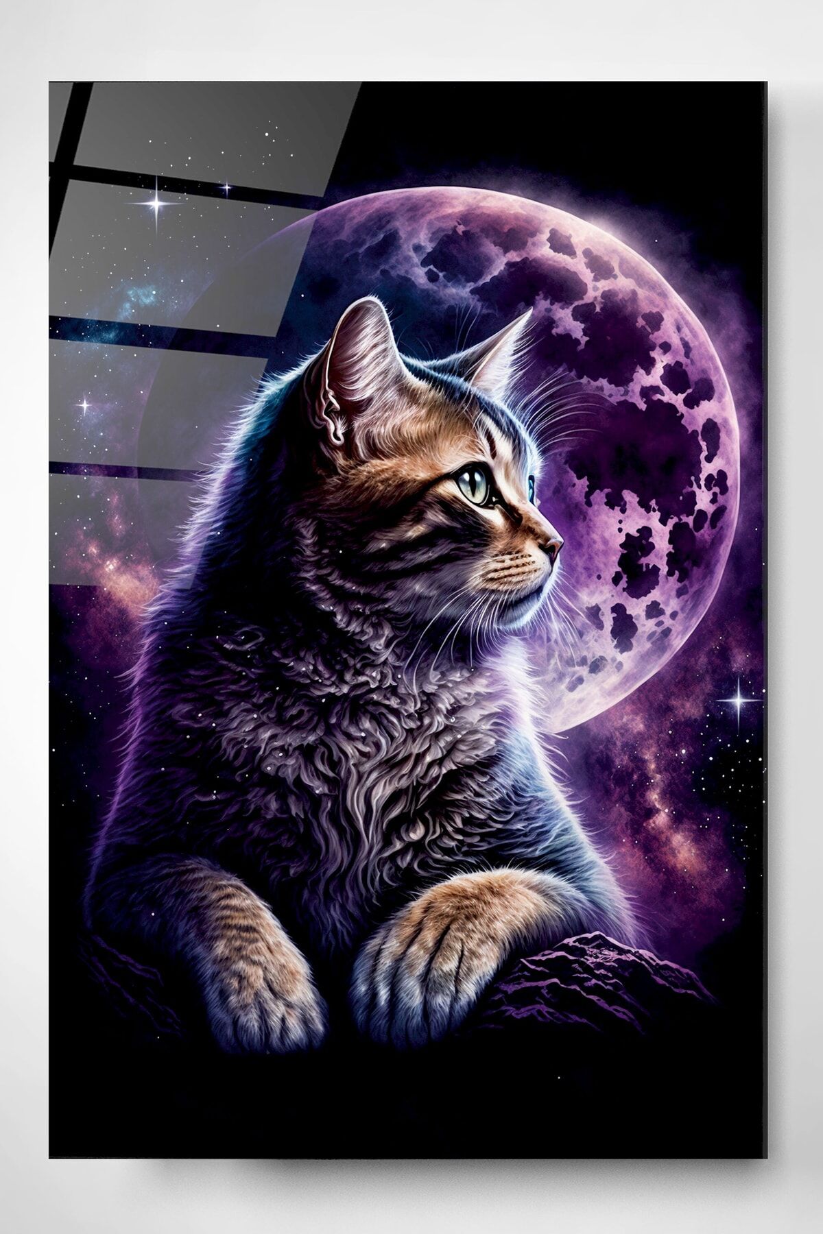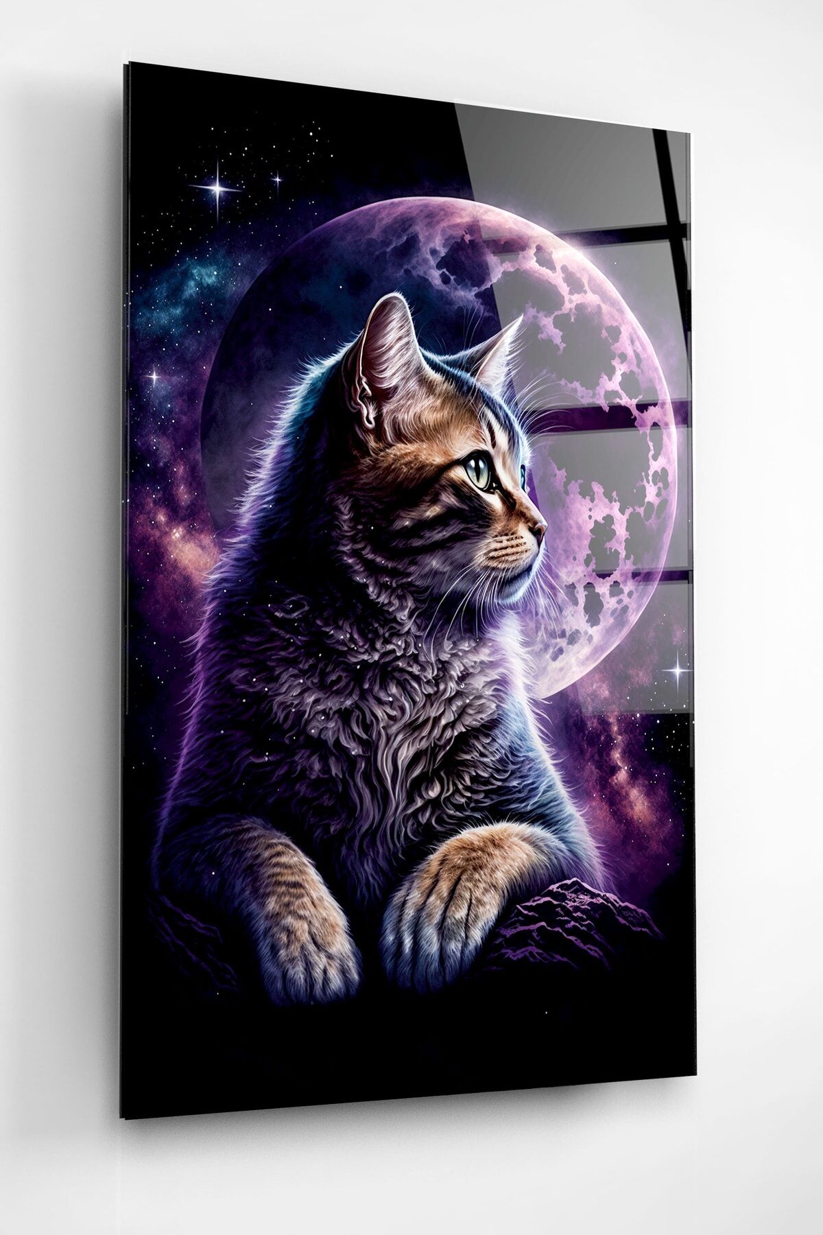Kedi Ve Dolunay Cam Tablo, Dekoratif Cam Tablo