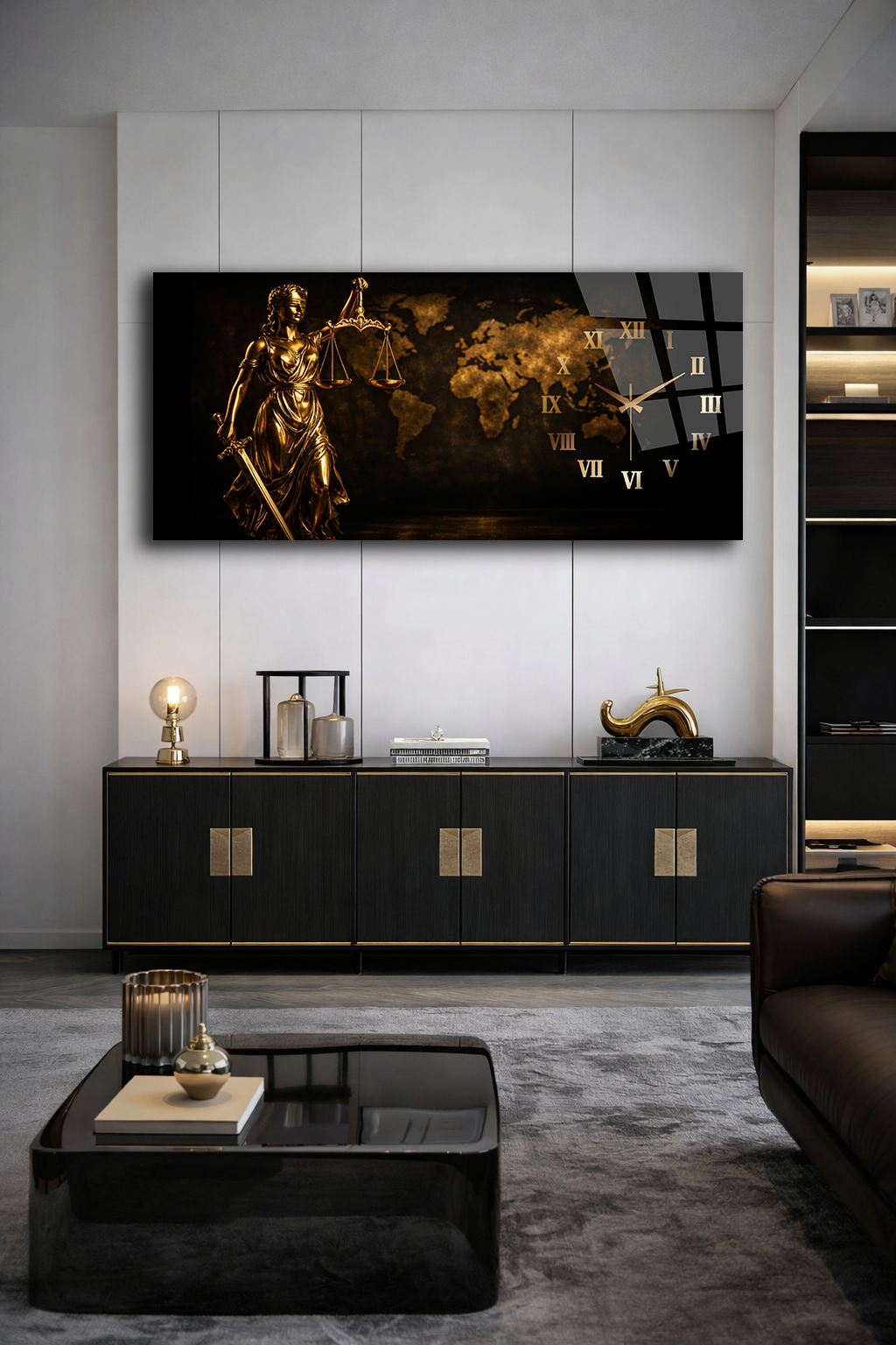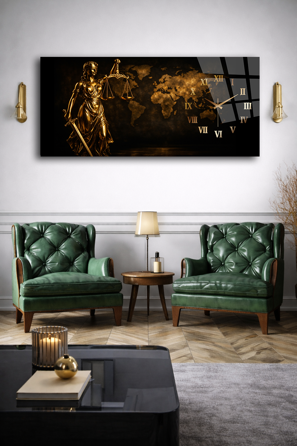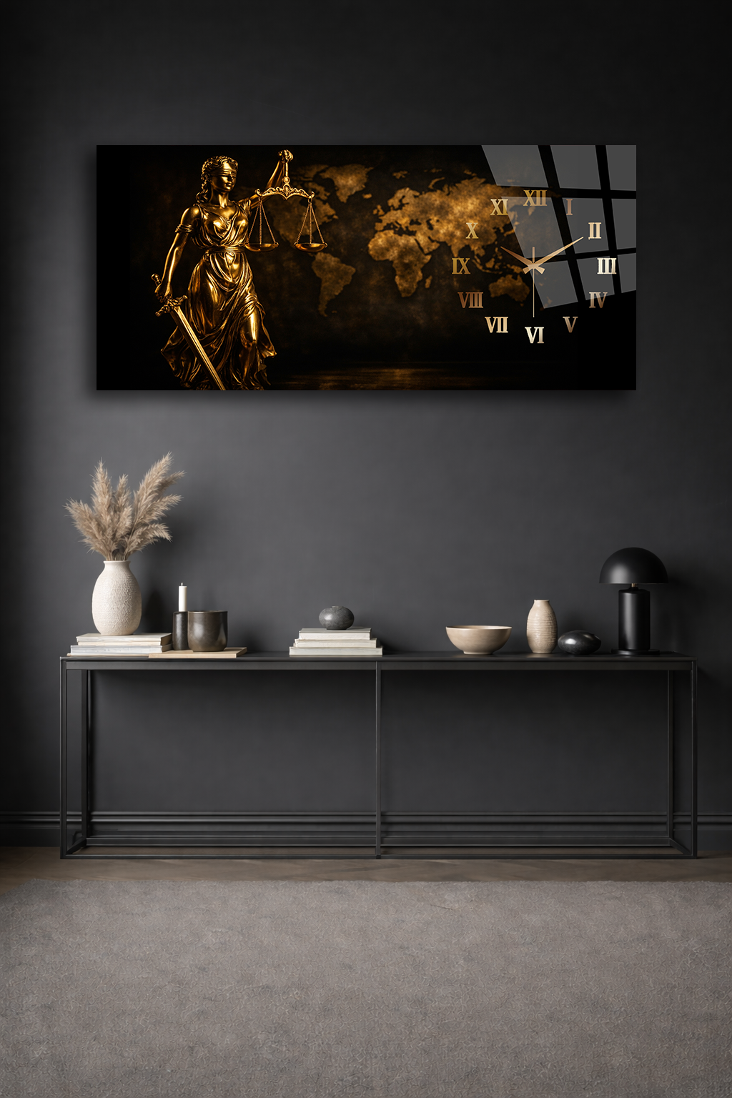 KIRILMAZ CAM DUVAR SAATİ , HEM TABLO HEM SAAT ADALET HEYKELİ ALTIN TEMALI EV OFİS HEDİYESİ
