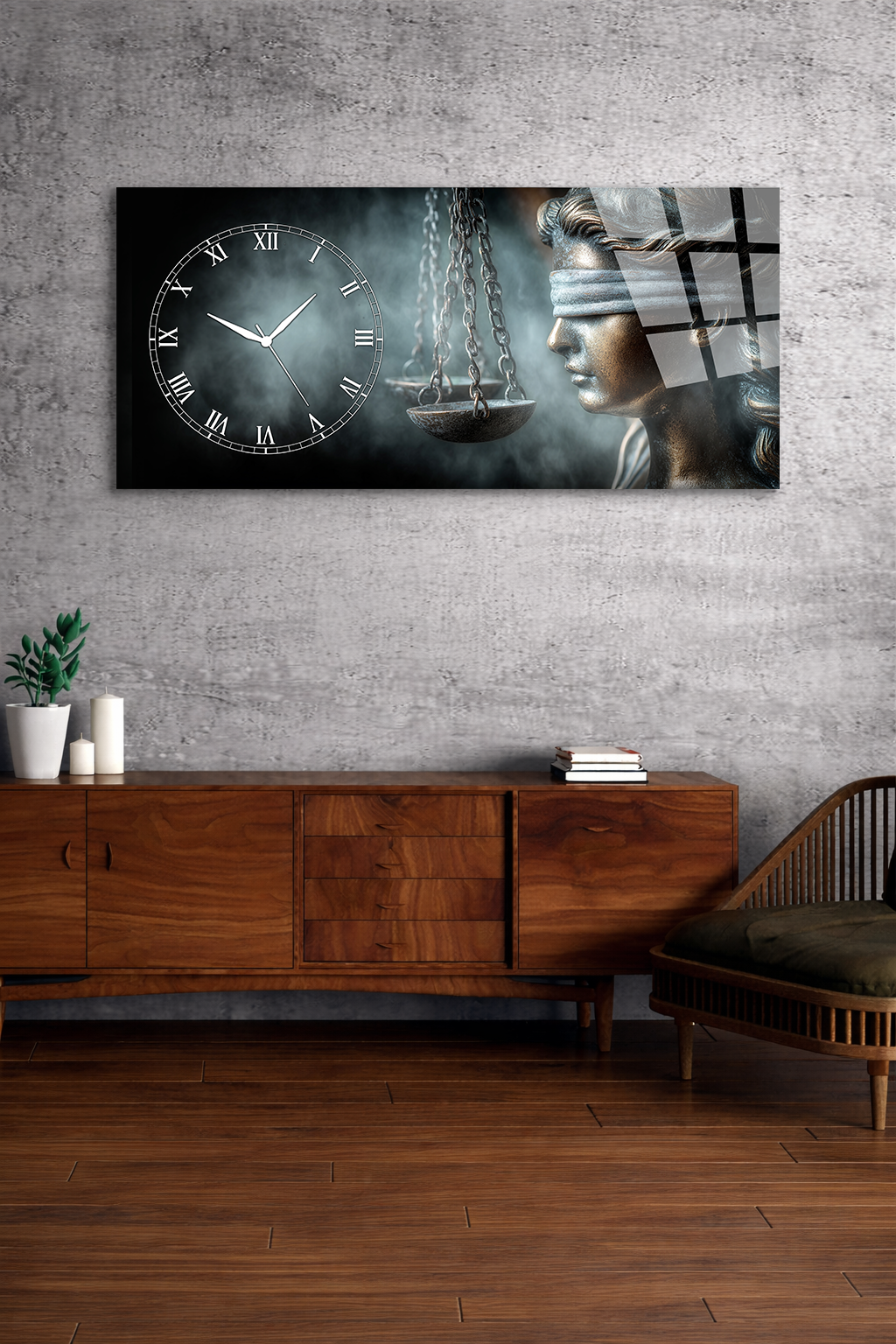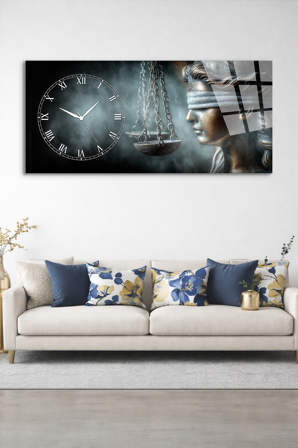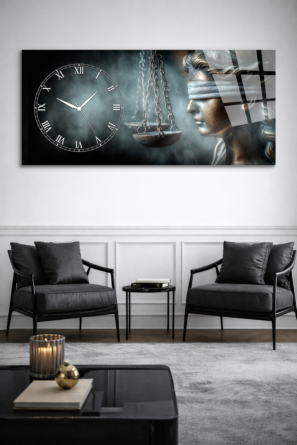KIRILMAZ CAM DUVAR SAATİ , HEM TABLO HEM SAAT ADALET HEYKELİ FİGÜRLÜ TASARIM EV OFİS HEDİYESİ
