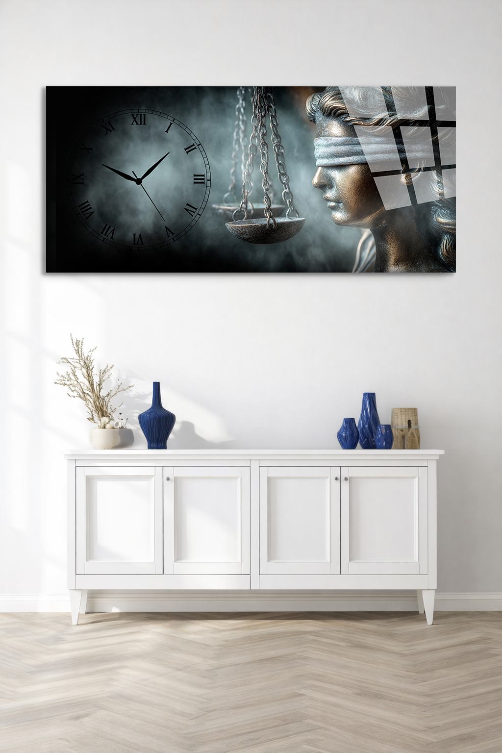 KIRILMAZ CAM DUVAR SAATİ , HEM TABLO HEM SAAT ADALET TERAZİSİ HUKUK TASARIM EV OFİS HEDİYESİ