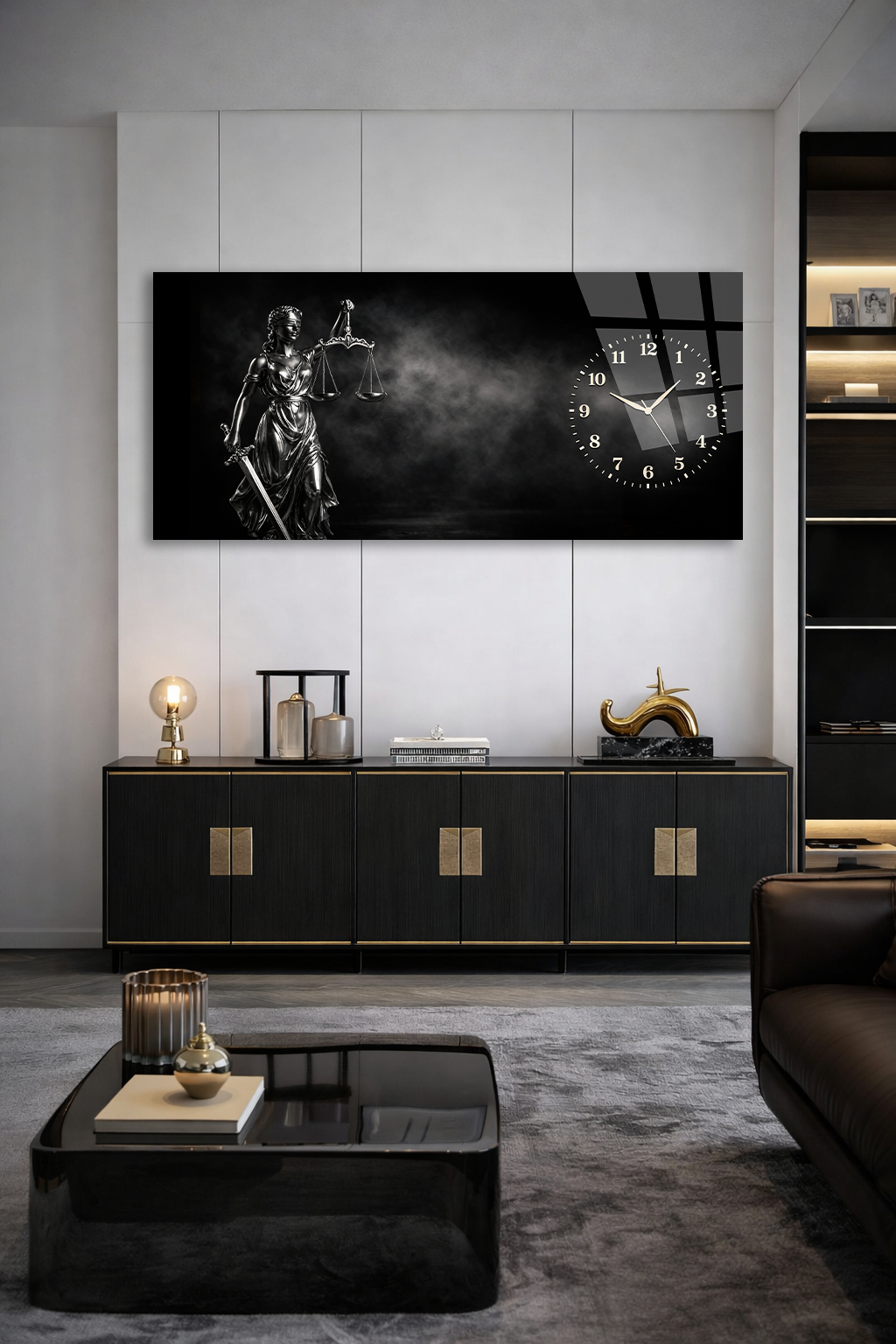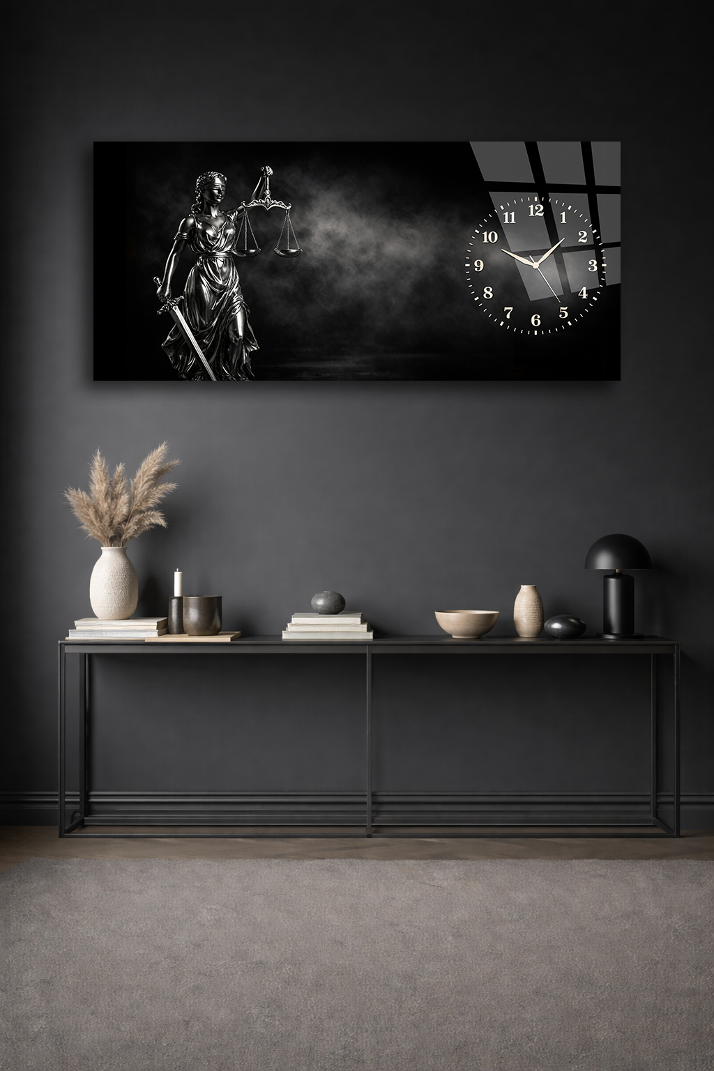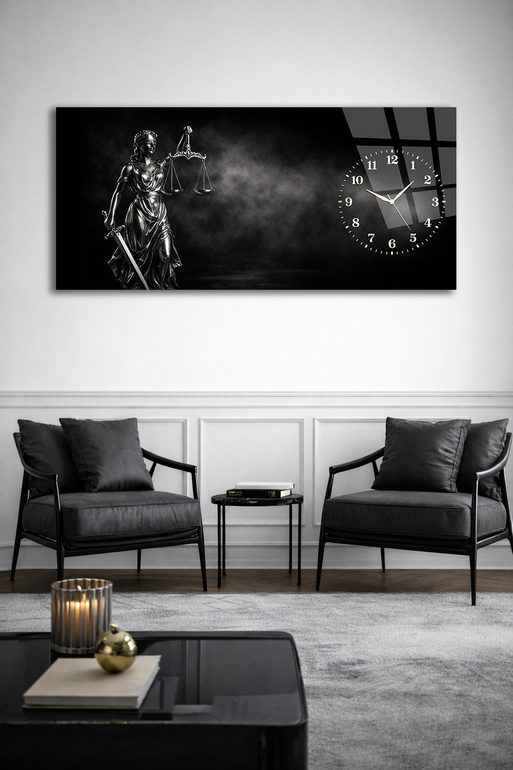 KIRILMAZ CAM DUVAR SAATİ , HEM TABLO HEM SAAT ADALET TERAZİSİ SİYAH TEMALI TASARIM EV OFİS HEDİYESİ