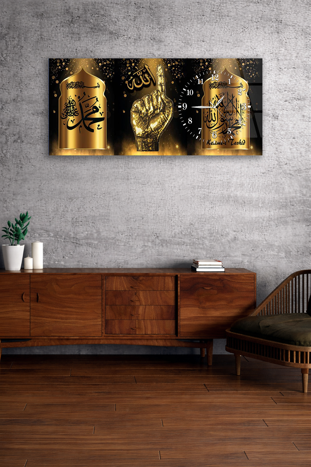KIRILMAZ CAM DUVAR SAATİ , HEM TABLO HEM SAAT ALLAH MUHAMMED TEMALI ALTIN TASARIM EV OFİS HEDİYESİ