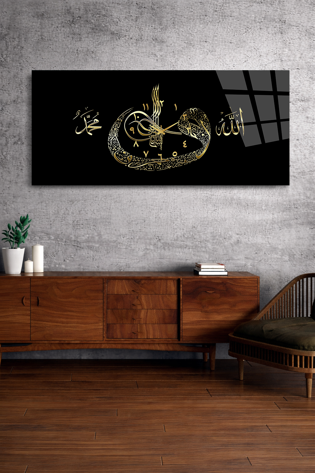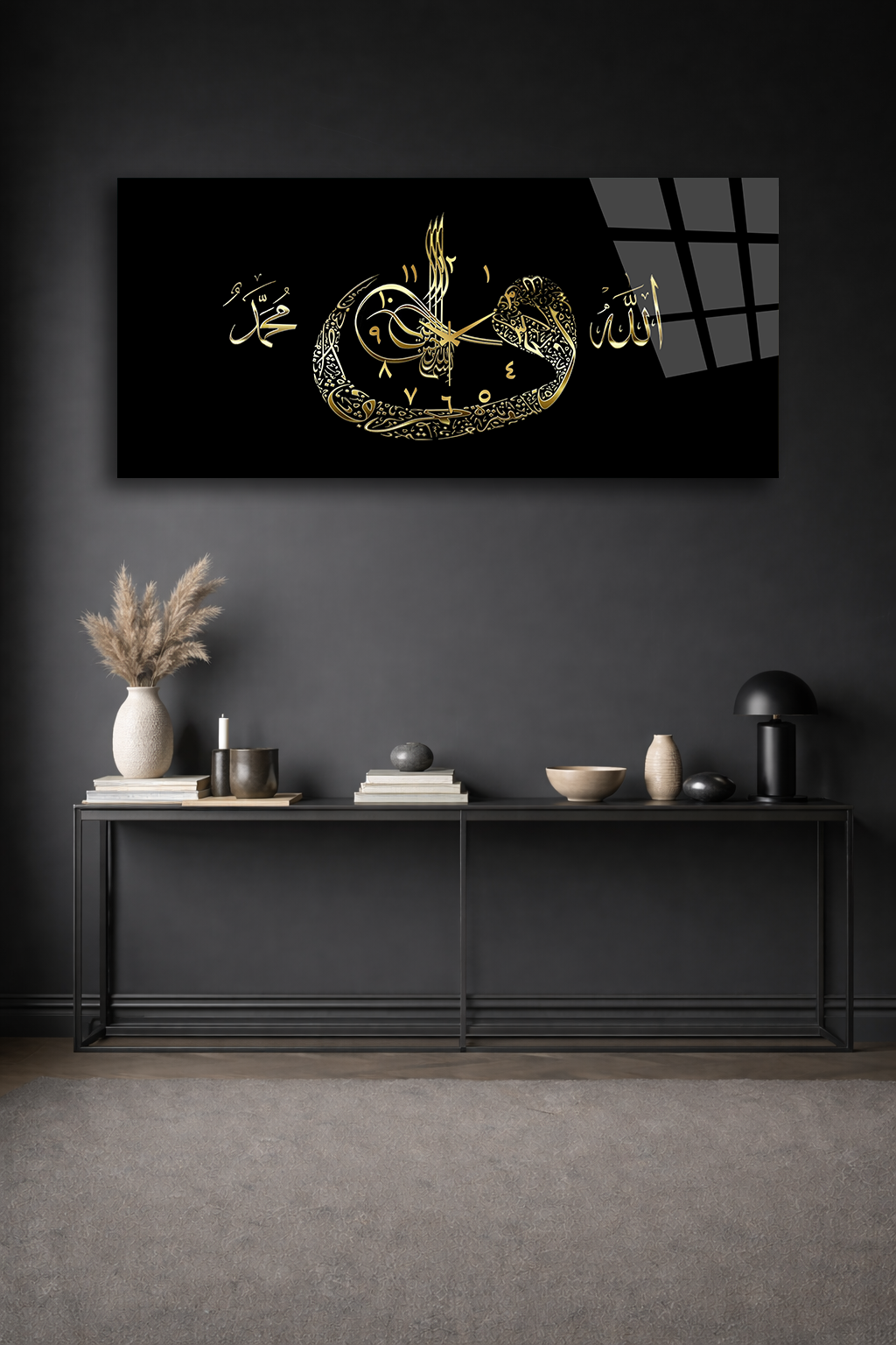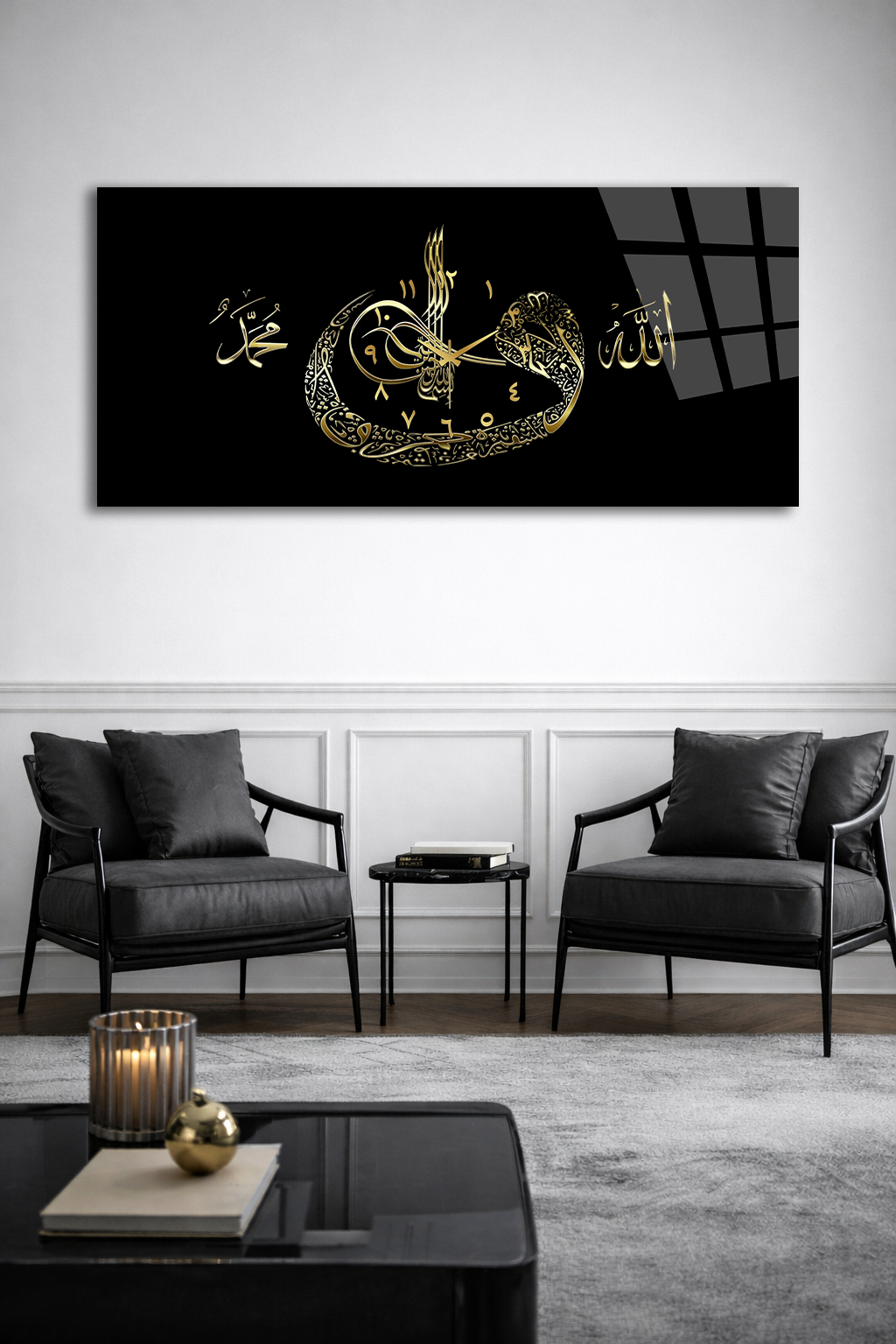 KIRILMAZ CAM DUVAR SAATİ , HEM TABLO HEM SAAT ALTIN ARAPÇA HAT SANATI ŞIK TASARIM EV OFİS HEDİYESİ
