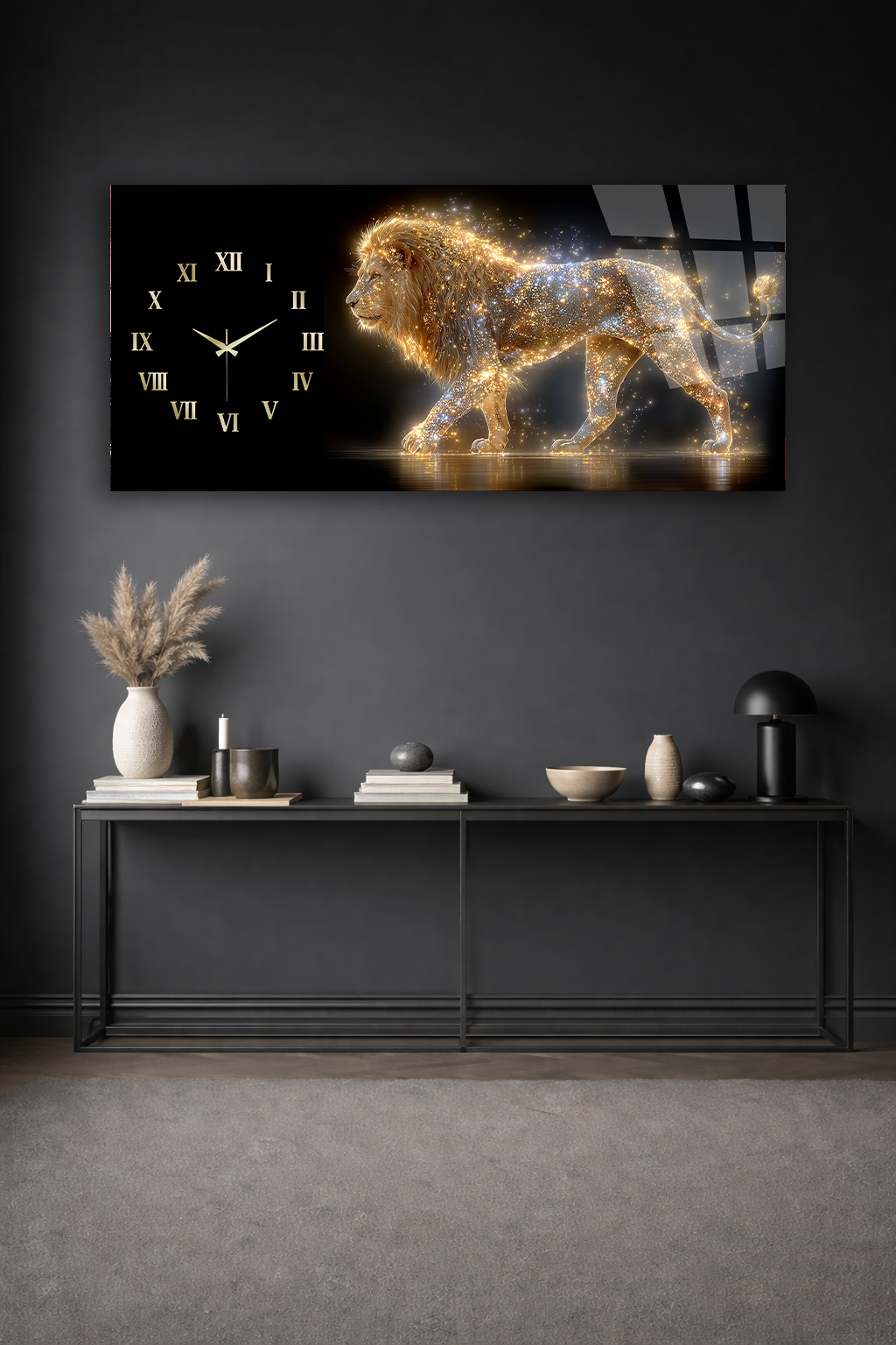 KIRILMAZ CAM DUVAR SAATİ , HEM TABLO HEM SAAT ALTIN ASLAN GÜÇ VE ASALET TEMASI EV OFİS HEDİYESİ