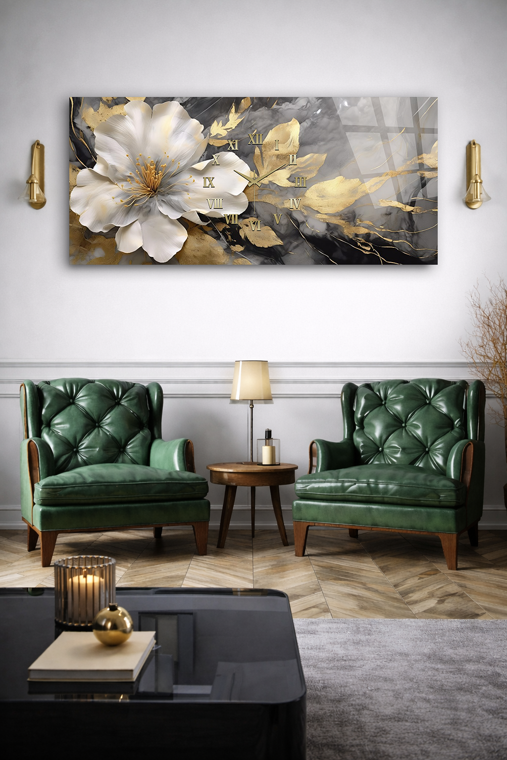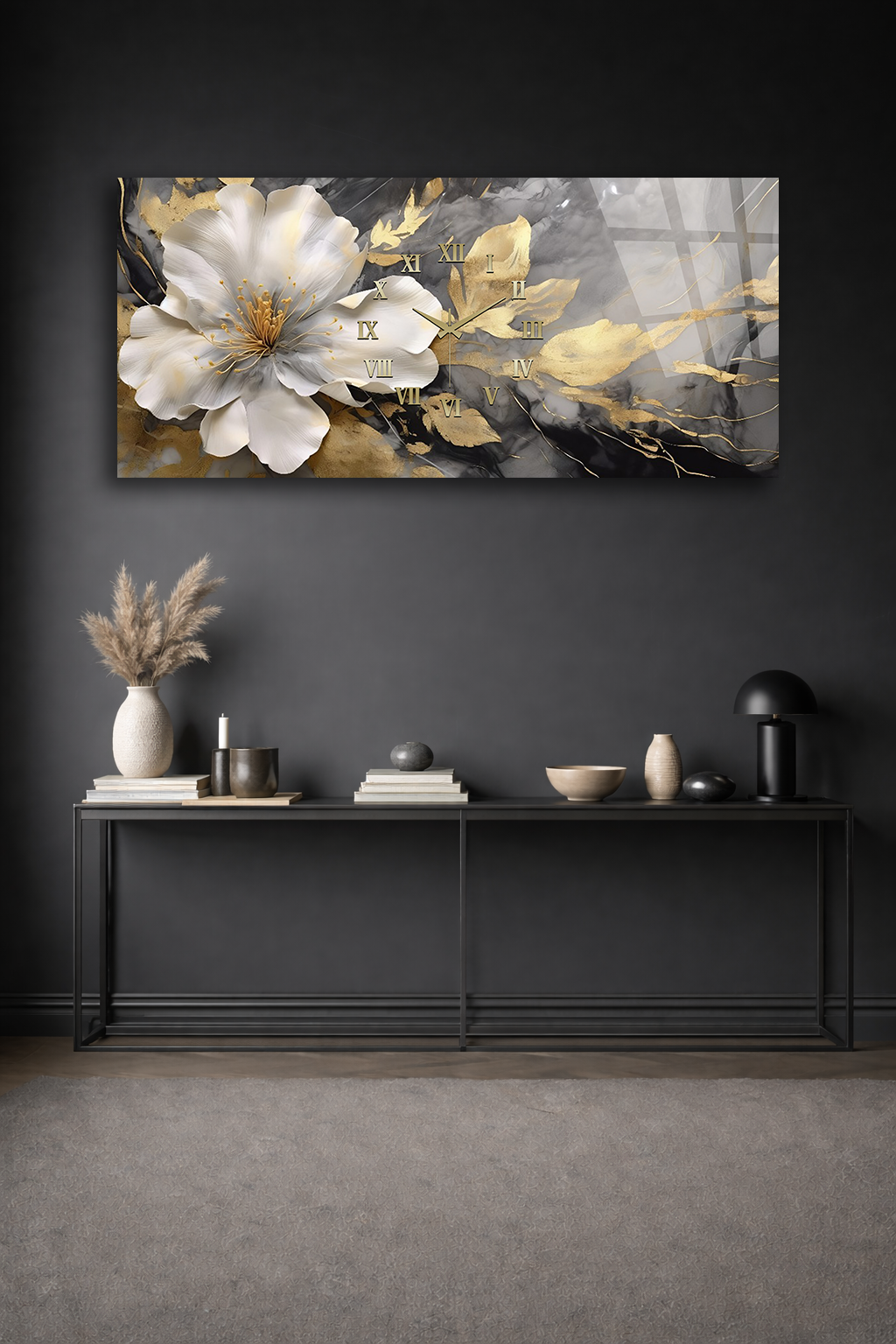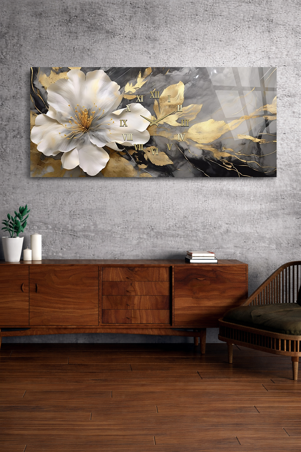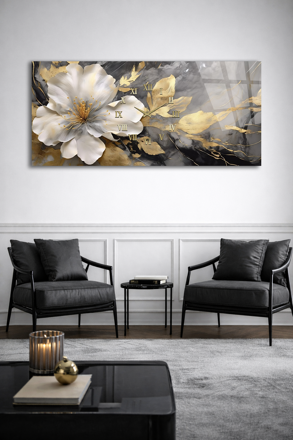 KIRILMAZ CAM DUVAR SAATİ , HEM TABLO HEM SAAT ALTIN BEYAZ ÇİÇEK MERMER DESEN EV OFİS HEDİYESİ