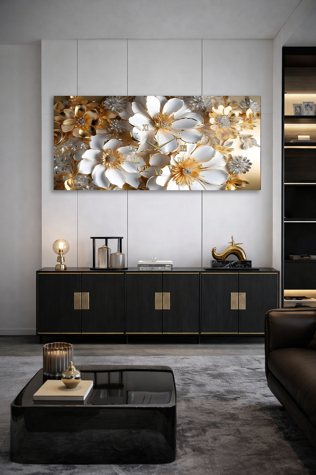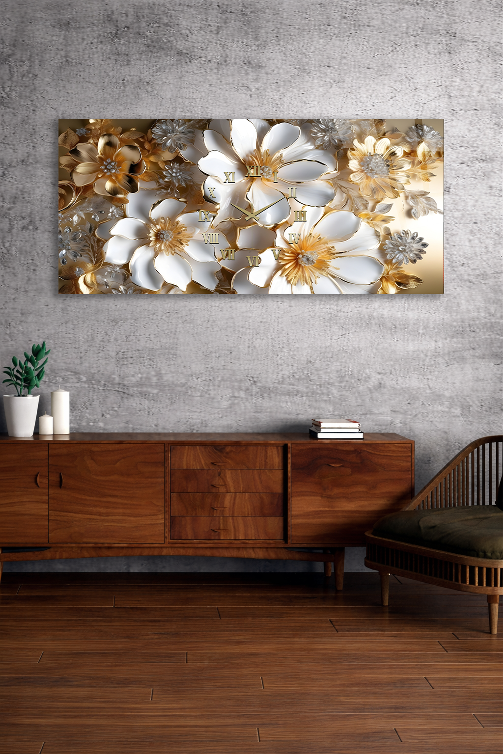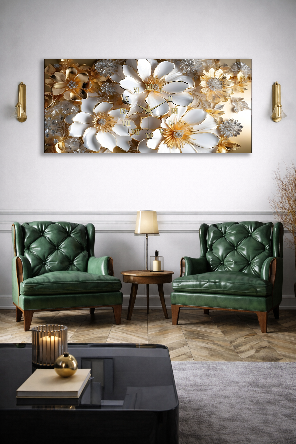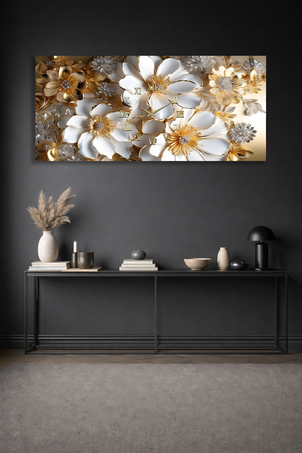 KIRILMAZ CAM DUVAR SAATİ , HEM TABLO HEM SAAT ALTIN BEYAZ ÇİÇEKLİ LÜKS TASARIM EV OFİS HEDİYESİ