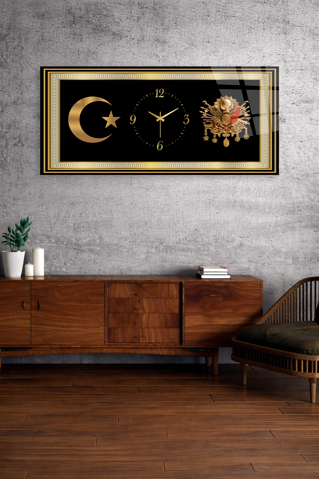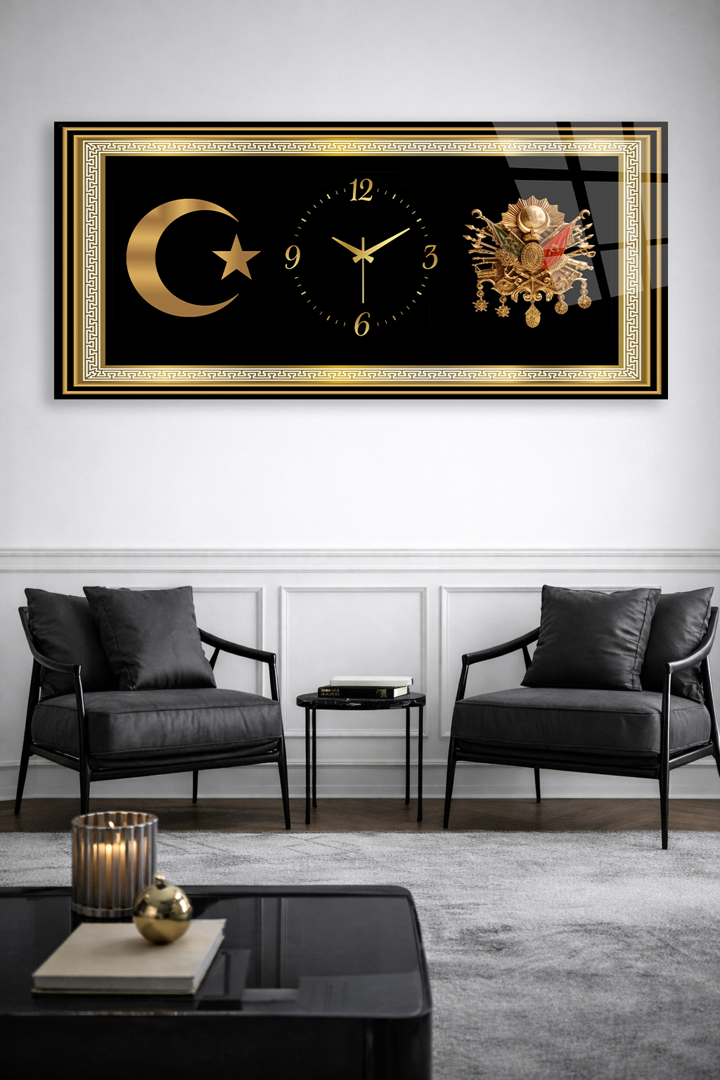 KIRILMAZ CAM DUVAR SAATİ , HEM TABLO HEM SAAT ALTIN ÇERÇEVELİ AY YILDIZ EV OFİS HEDİYESİ