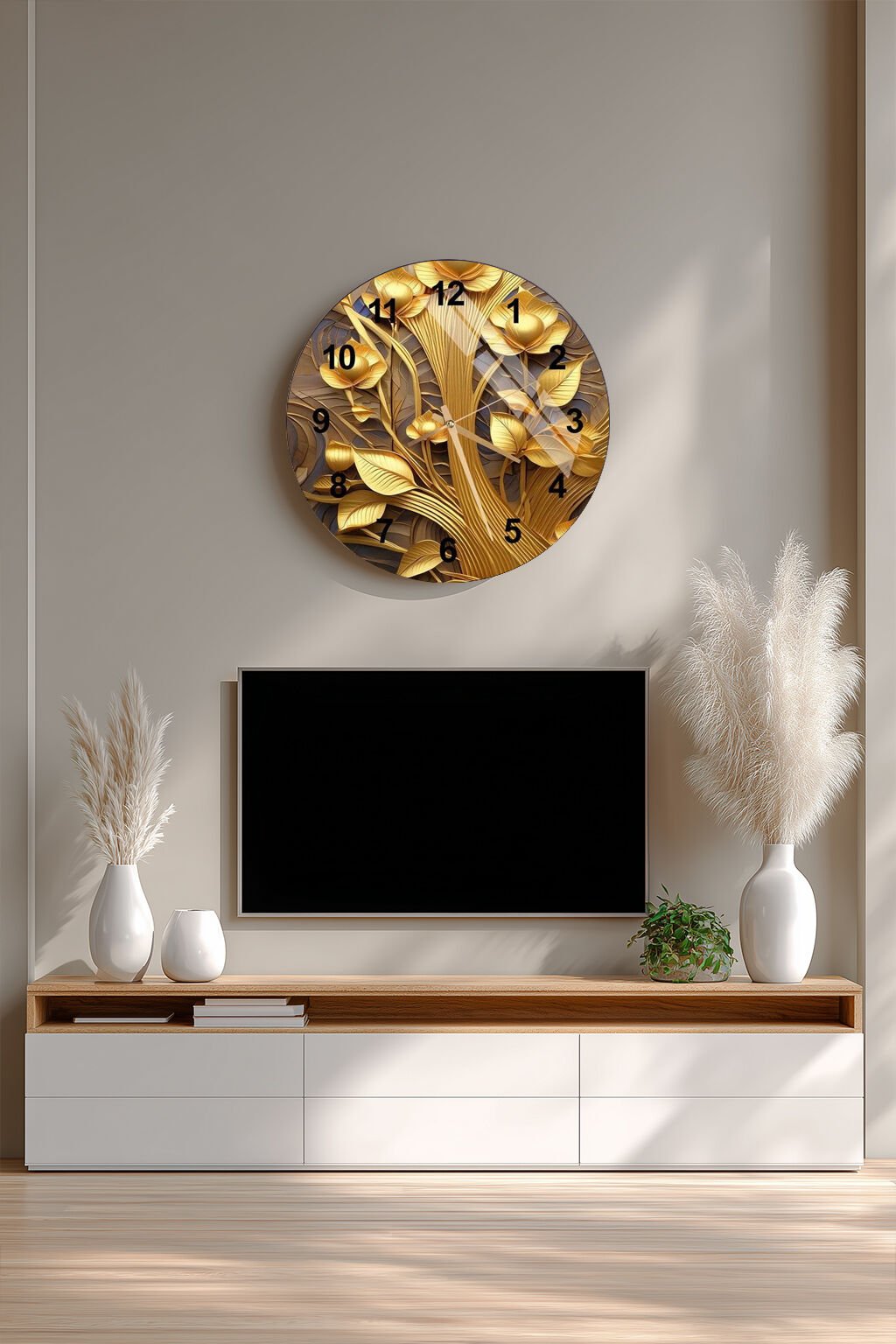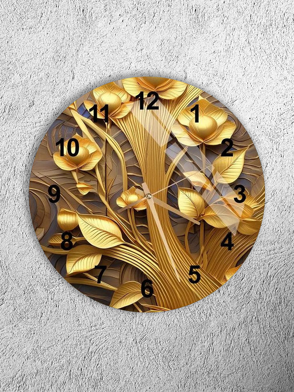 KIRILMAZ CAM DUVAR SAATİ, HEM TABLO HEM SAAT ALTIN ÇİÇEKLİ SANATSAL TASARIM EV OFİS HEDİYESİ