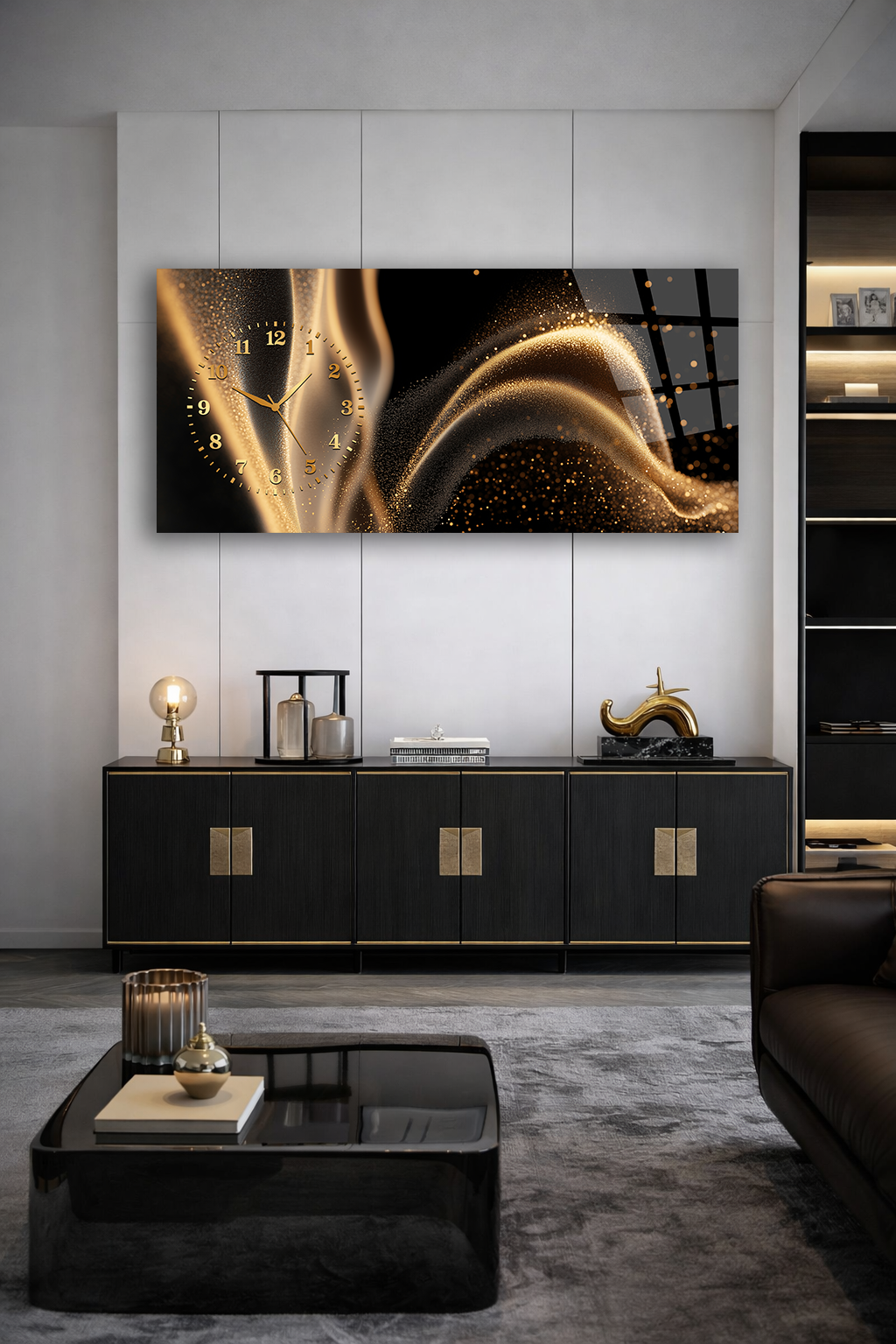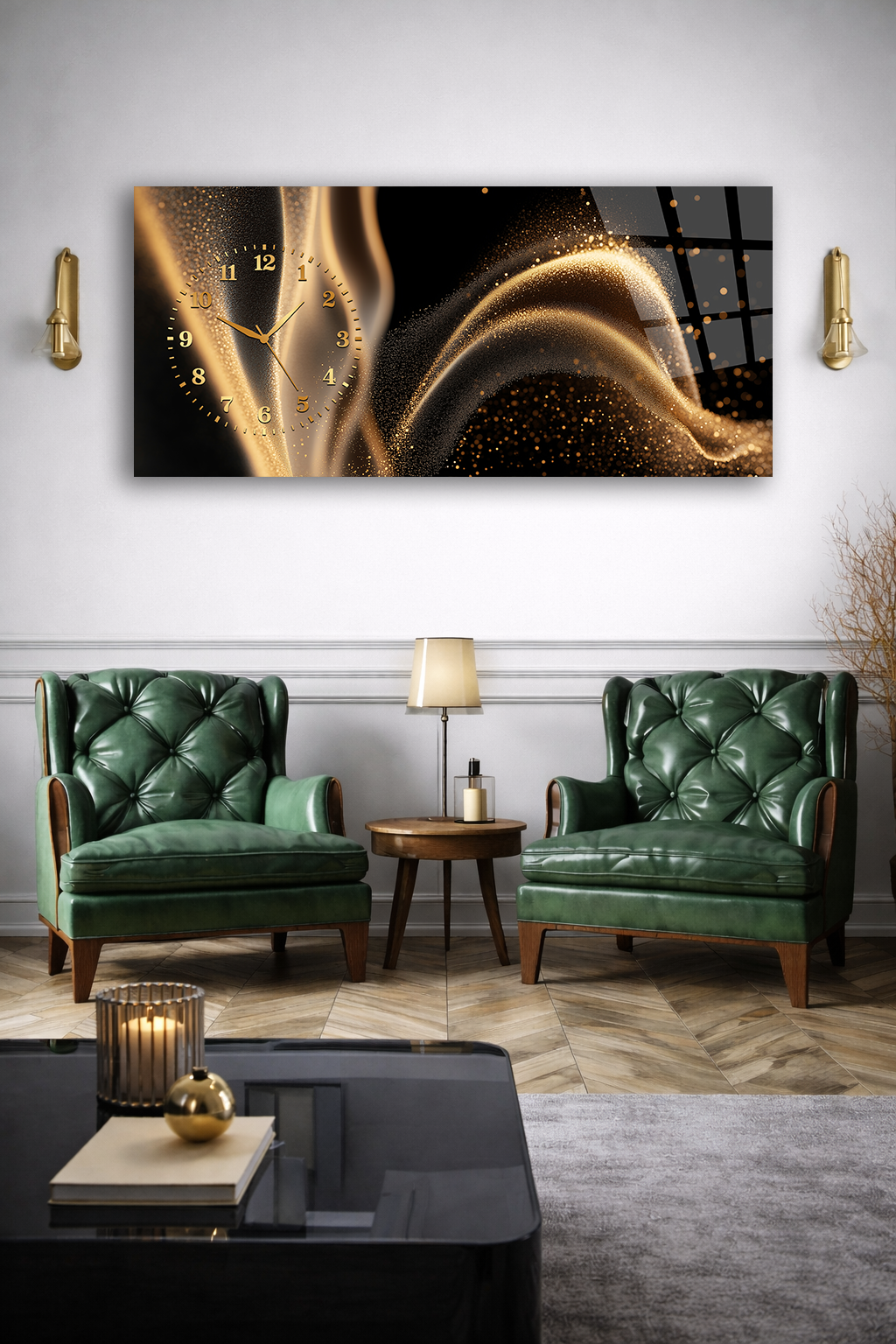 KIRILMAZ CAM DUVAR SAATİ , HEM TABLO HEM SAAT ALTIN DALGA IŞILTILI MODERN TASARIM EV OFİS HEDİYESİ