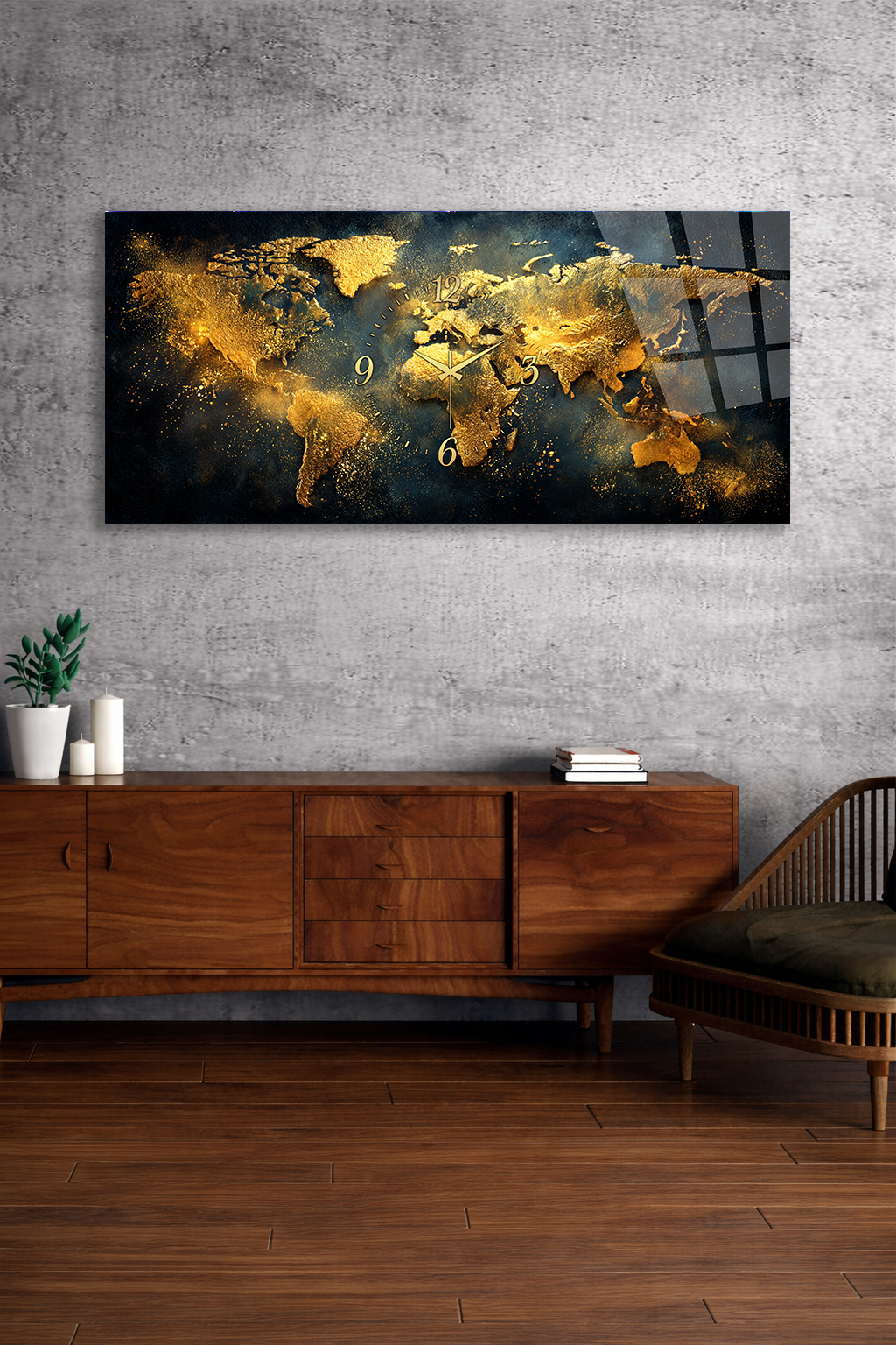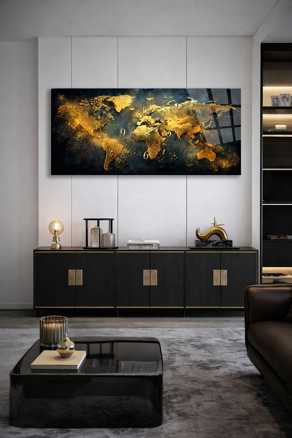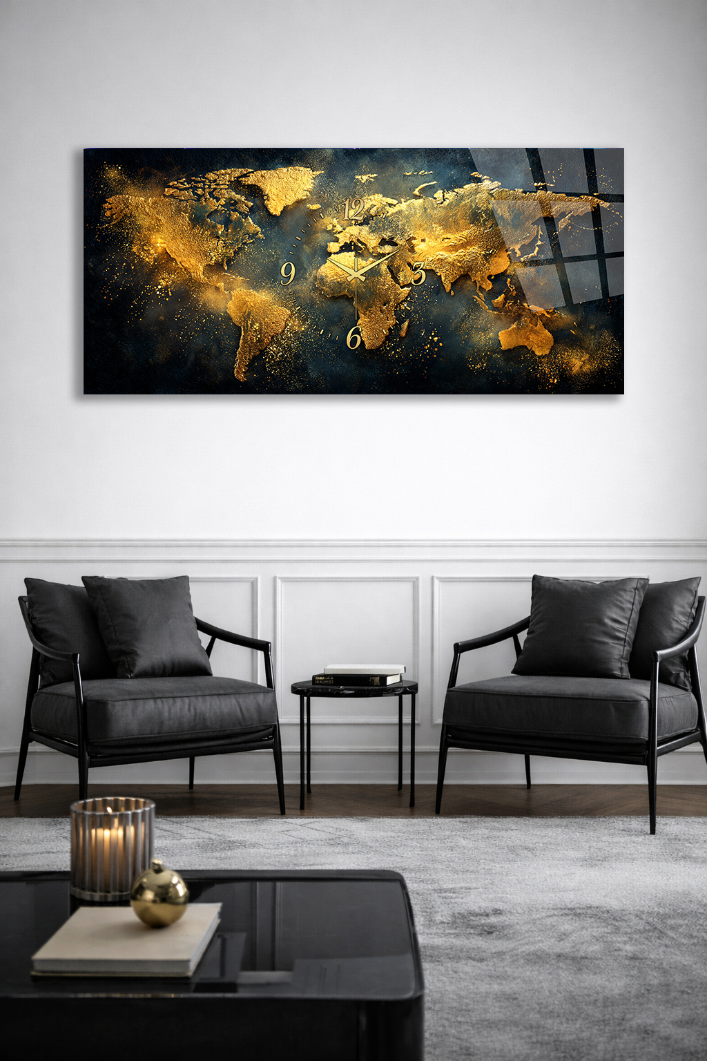 KIRILMAZ CAM DUVAR SAATİ , HEM TABLO HEM SAAT ALTIN DÜNYA HARİTASI LÜKS TASARIM EV OFİS HEDİYESİ