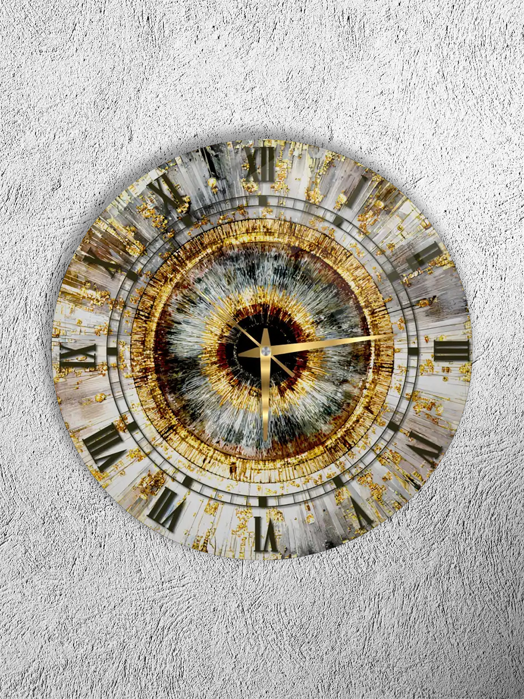 KIRILMAZ CAM DUVAR SAATİ, HEM TABLO HEM SAAT ALTIN IŞINLI SOYUT GÖZ DESEN MODERN TASARIM EV OFİS HEDİYESİ
