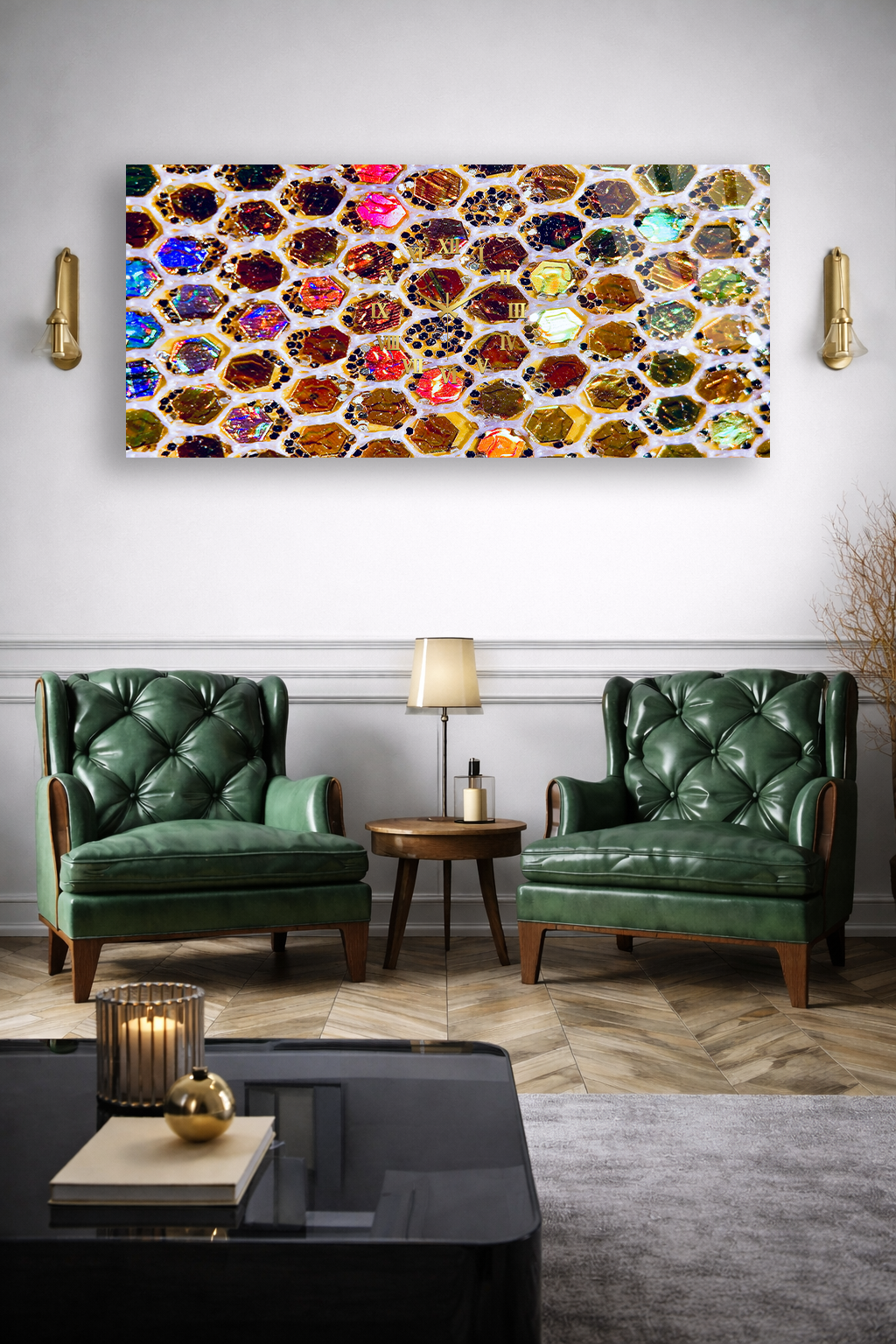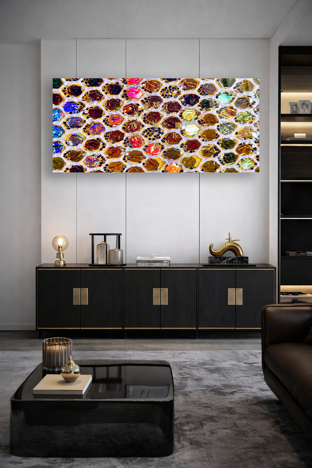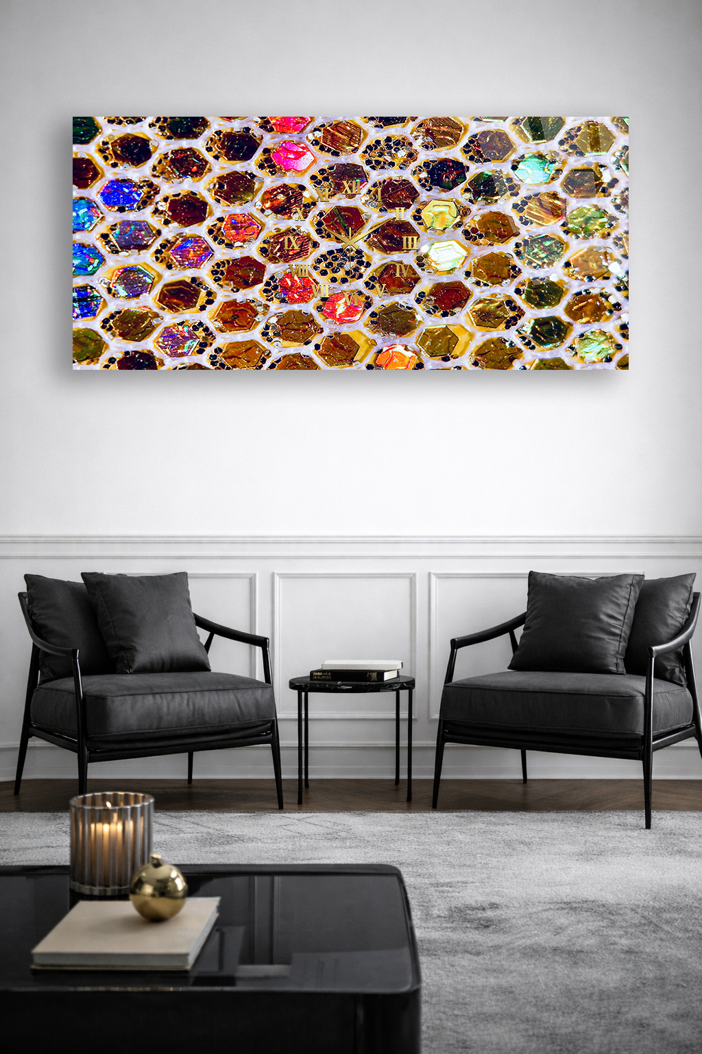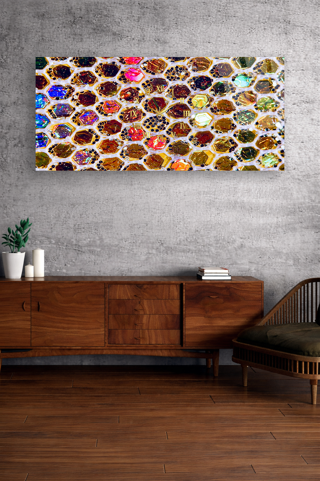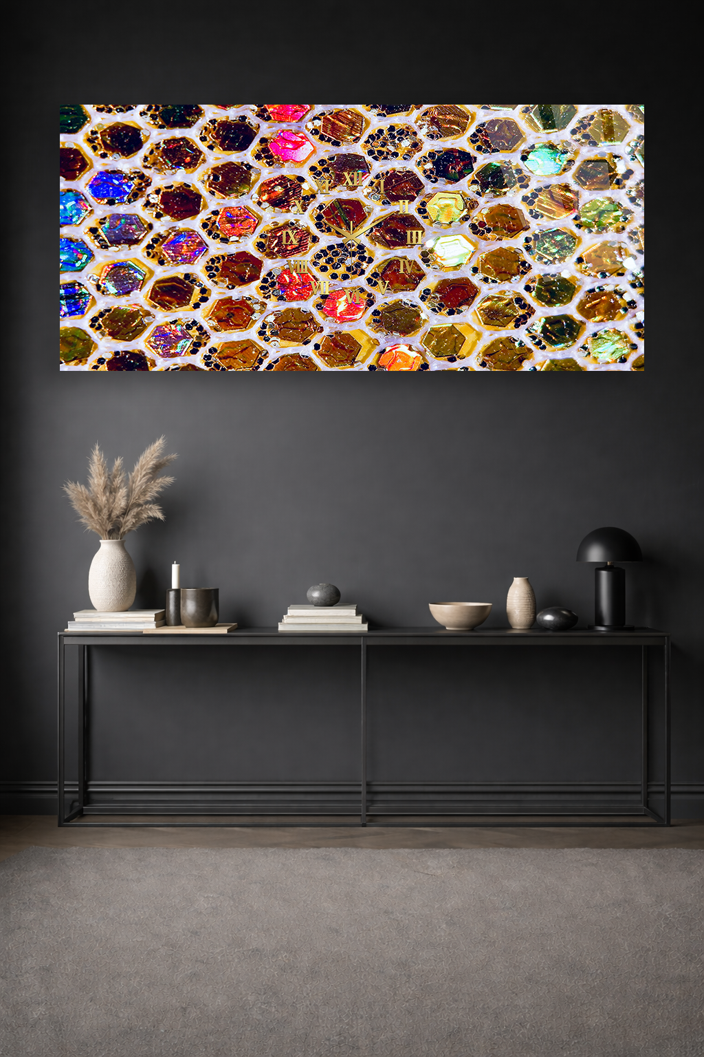 KIRILMAZ CAM DUVAR SAATİ , HEM TABLO HEM SAAT ALTIN PETEK DOKU TASARIM EV OFİS HEDİYESİ