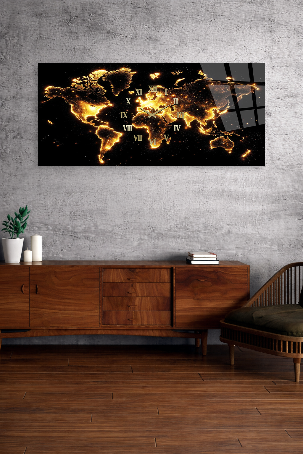 KIRILMAZ CAM DUVAR SAATİ , HEM TABLO HEM SAAT ALTIN RENK DÜNYA HARİTASI TASARIM EV OFİS HEDİYESİ