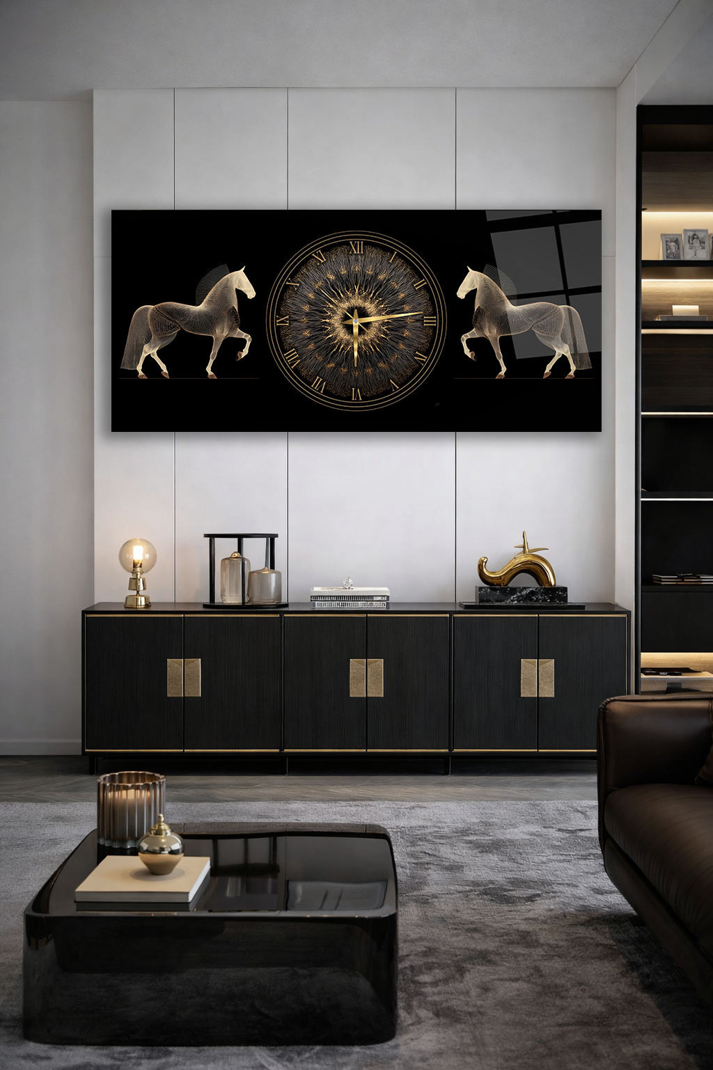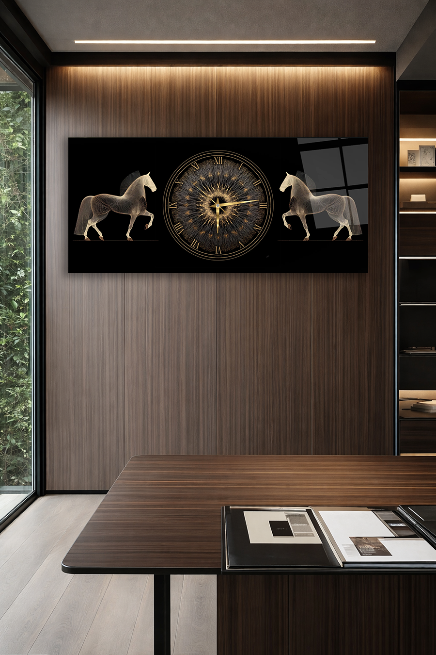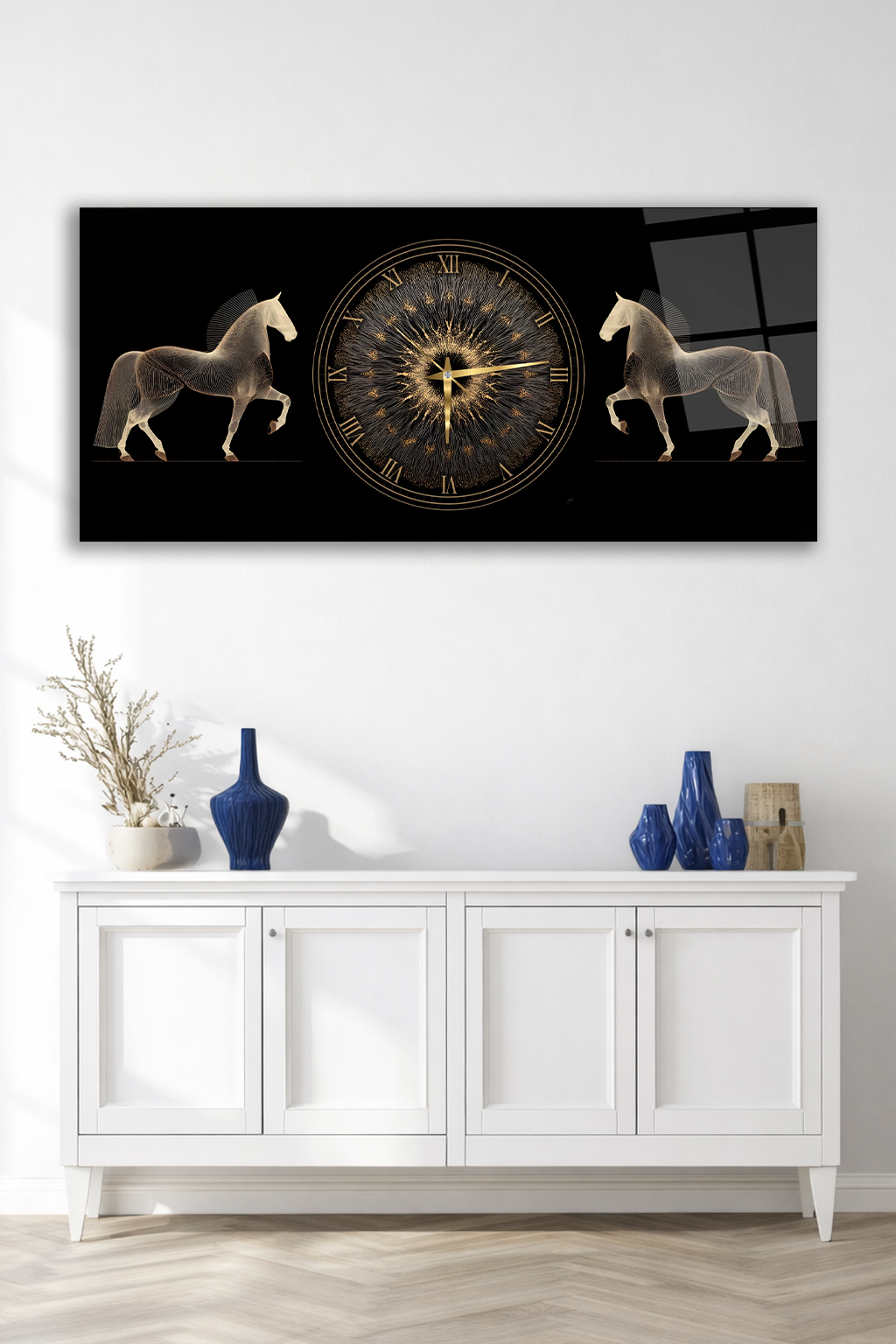 KIRILMAZ CAM DUVAR SAATİ , HEM TABLO HEM SAAT ALTIN SAAT VE AT FİGÜRLÜ LÜKS EV OFİS HEDİYESİ