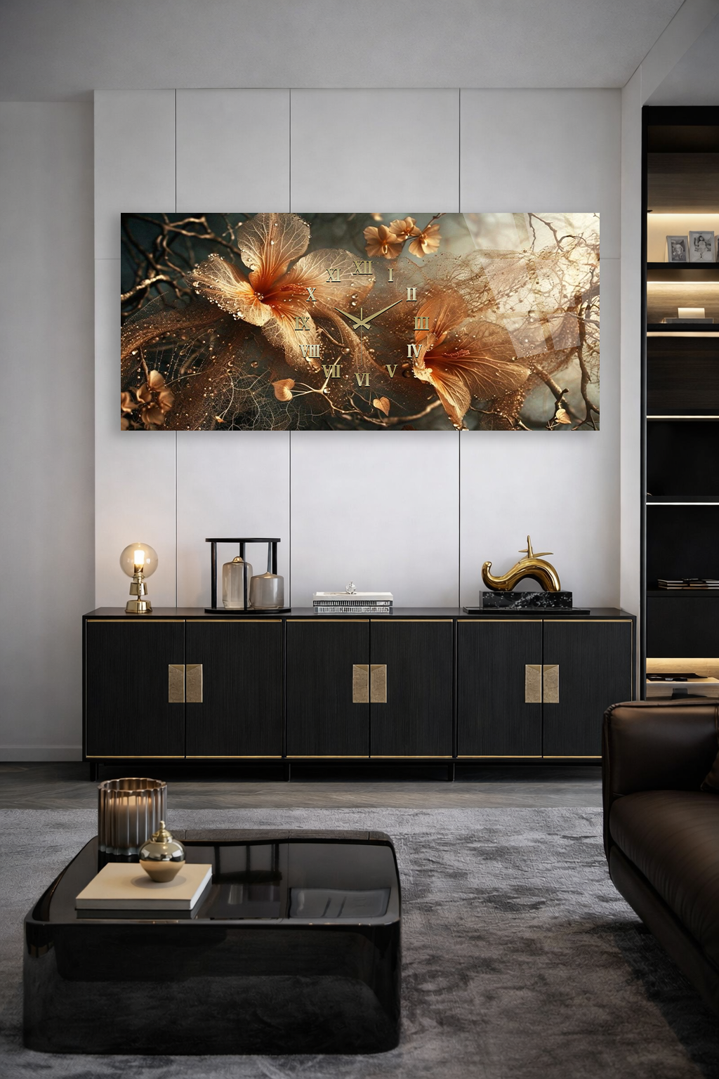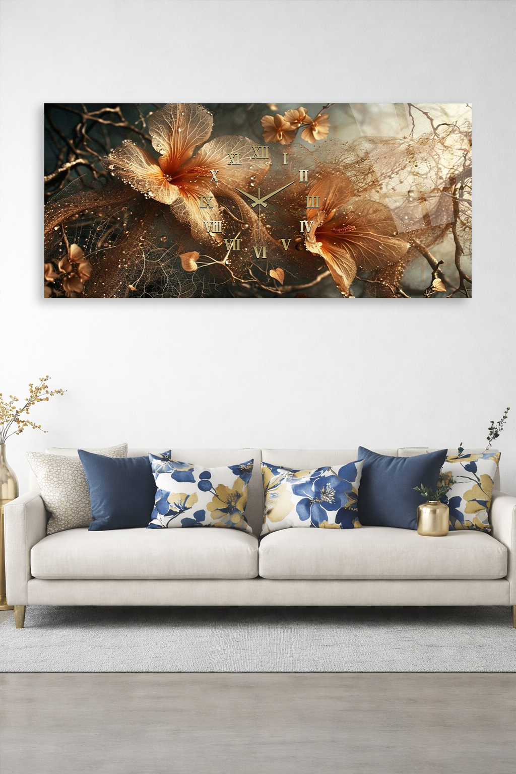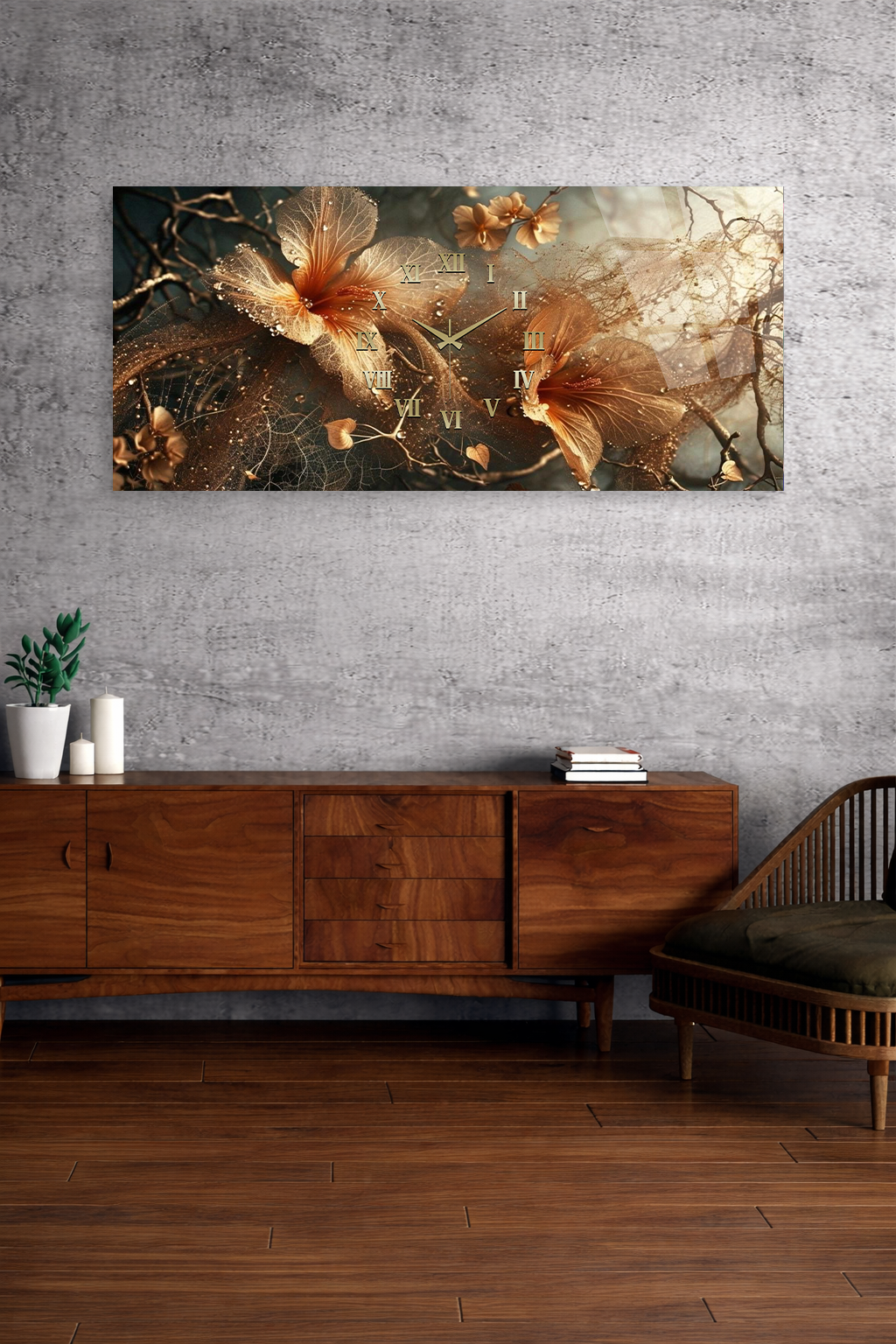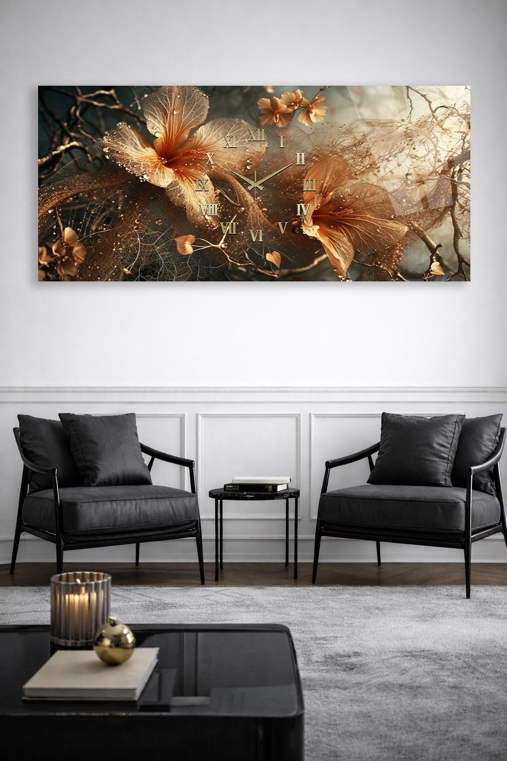 KIRILMAZ CAM DUVAR SAATİ , HEM TABLO HEM SAAT ALTIN TON ÇİÇEK DESENLİ ŞIK TASARIM EV OFİS HEDİYESİ