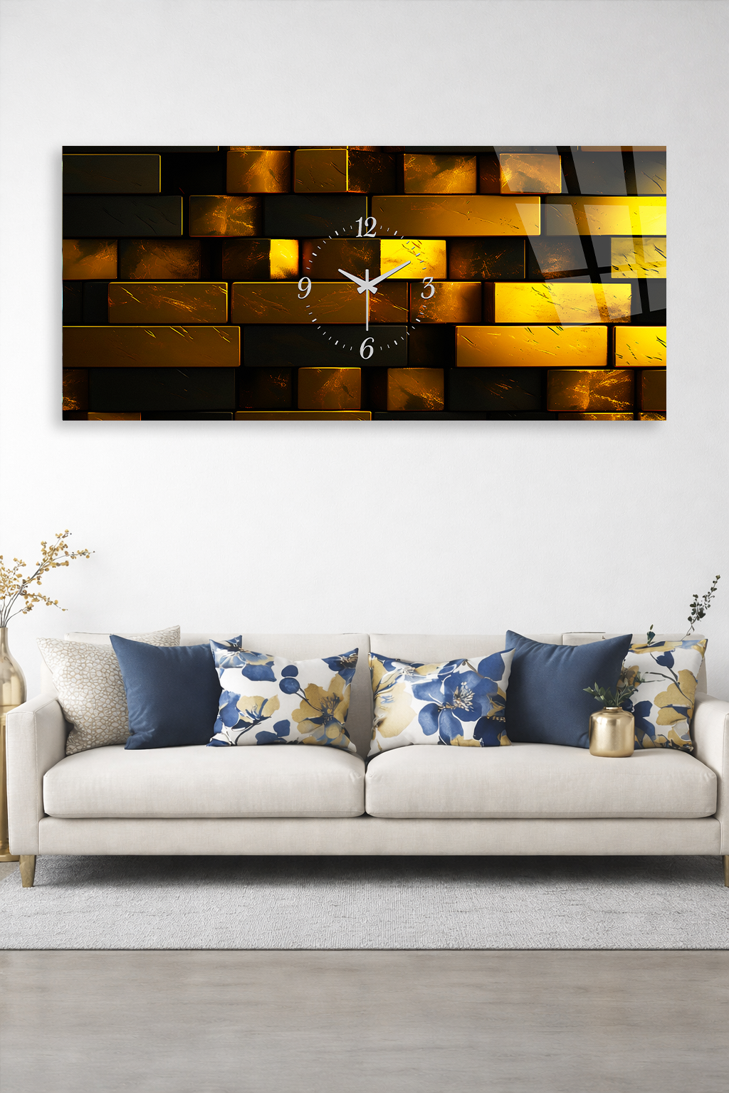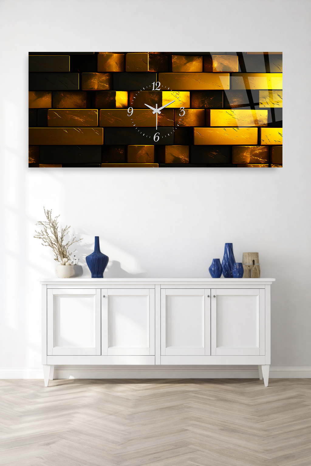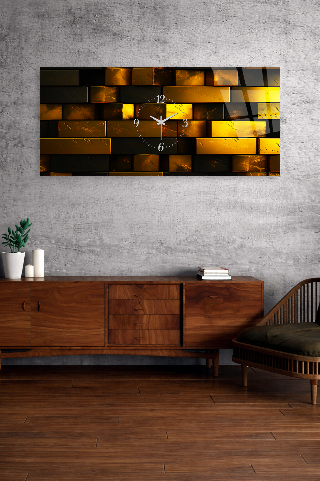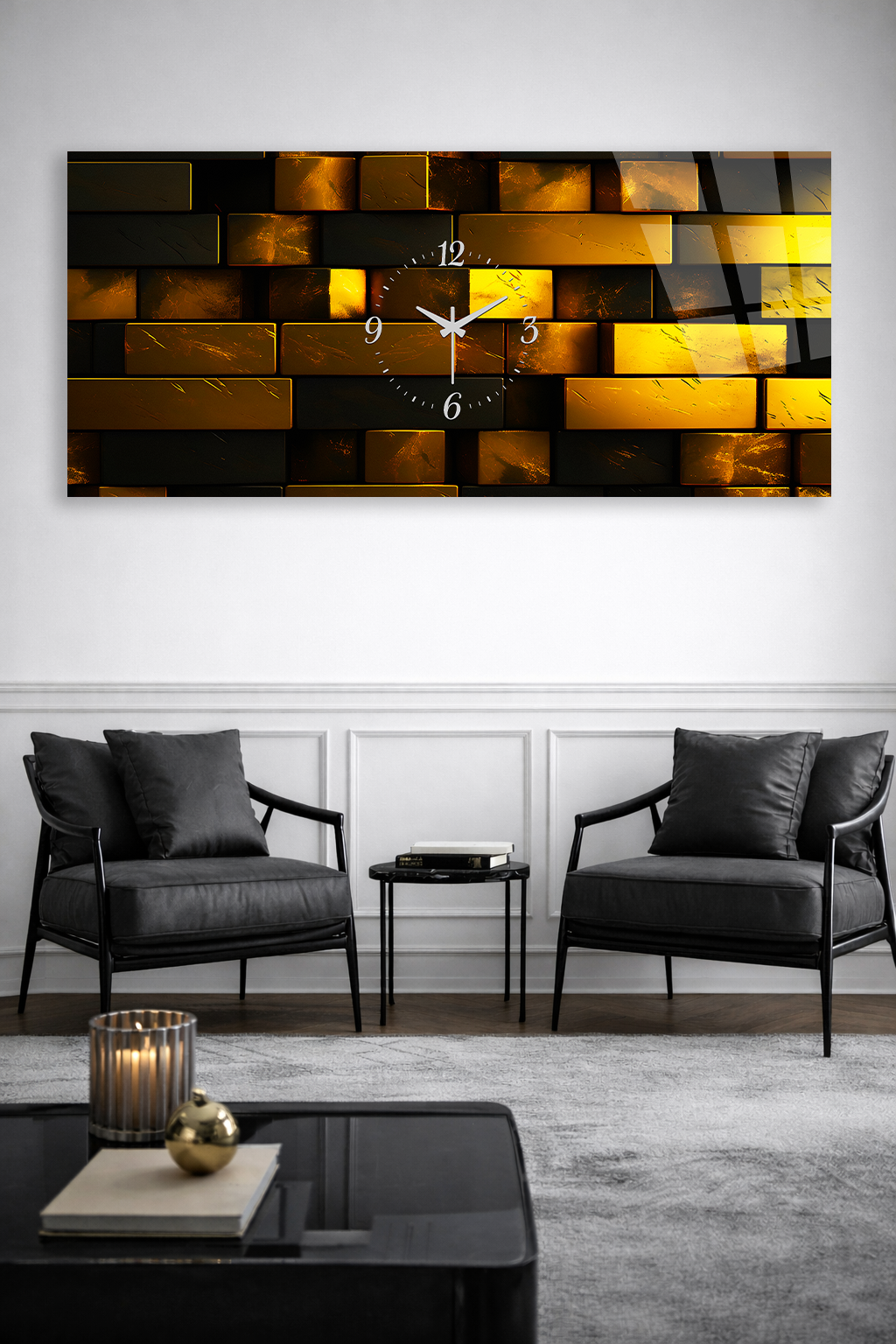 KIRILMAZ CAM DUVAR SAATİ , HEM TABLO HEM SAAT ALTIN TUĞLA DESENLİ MODERN TASARIM EV OFİS HEDİYESİ