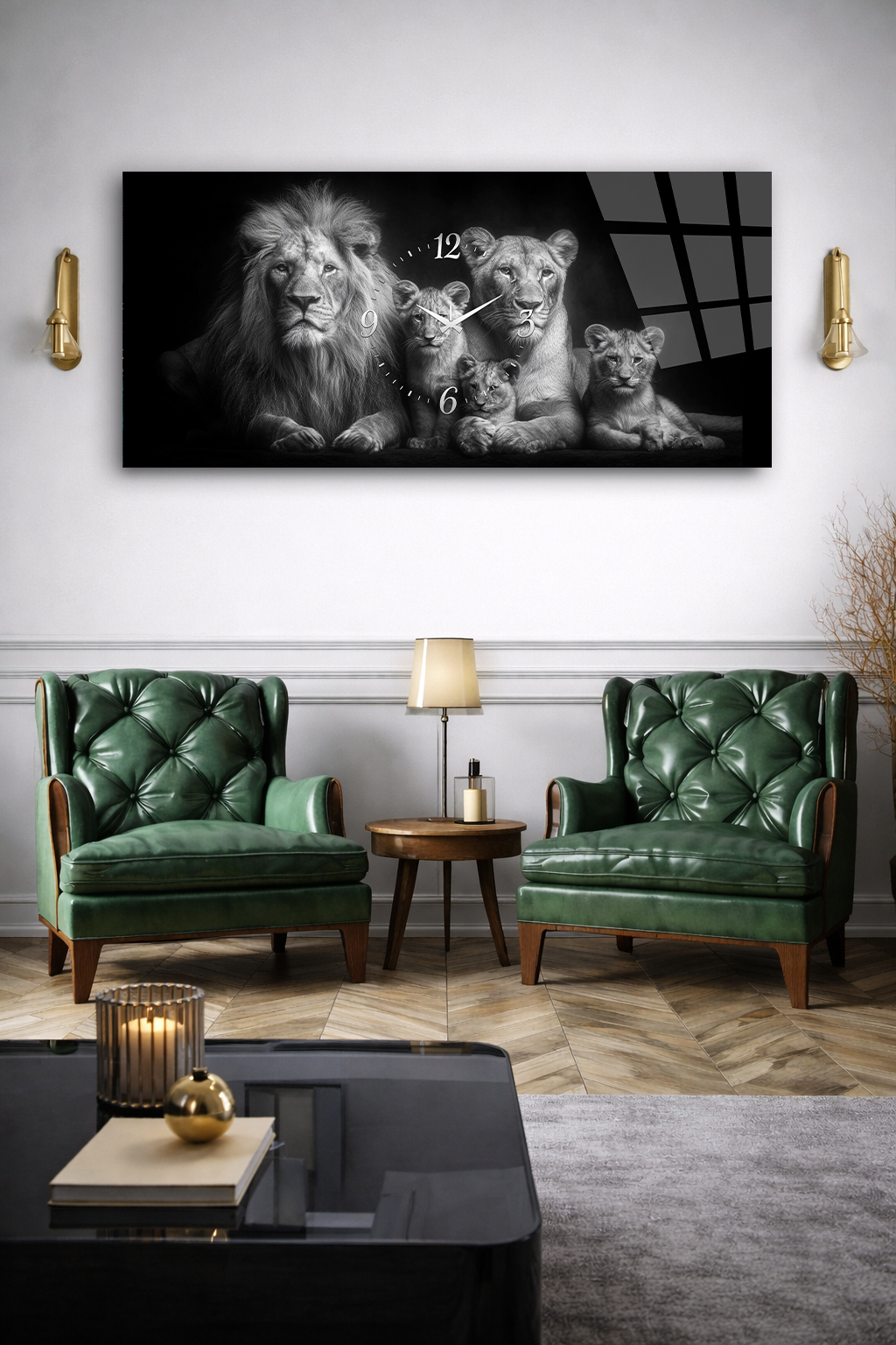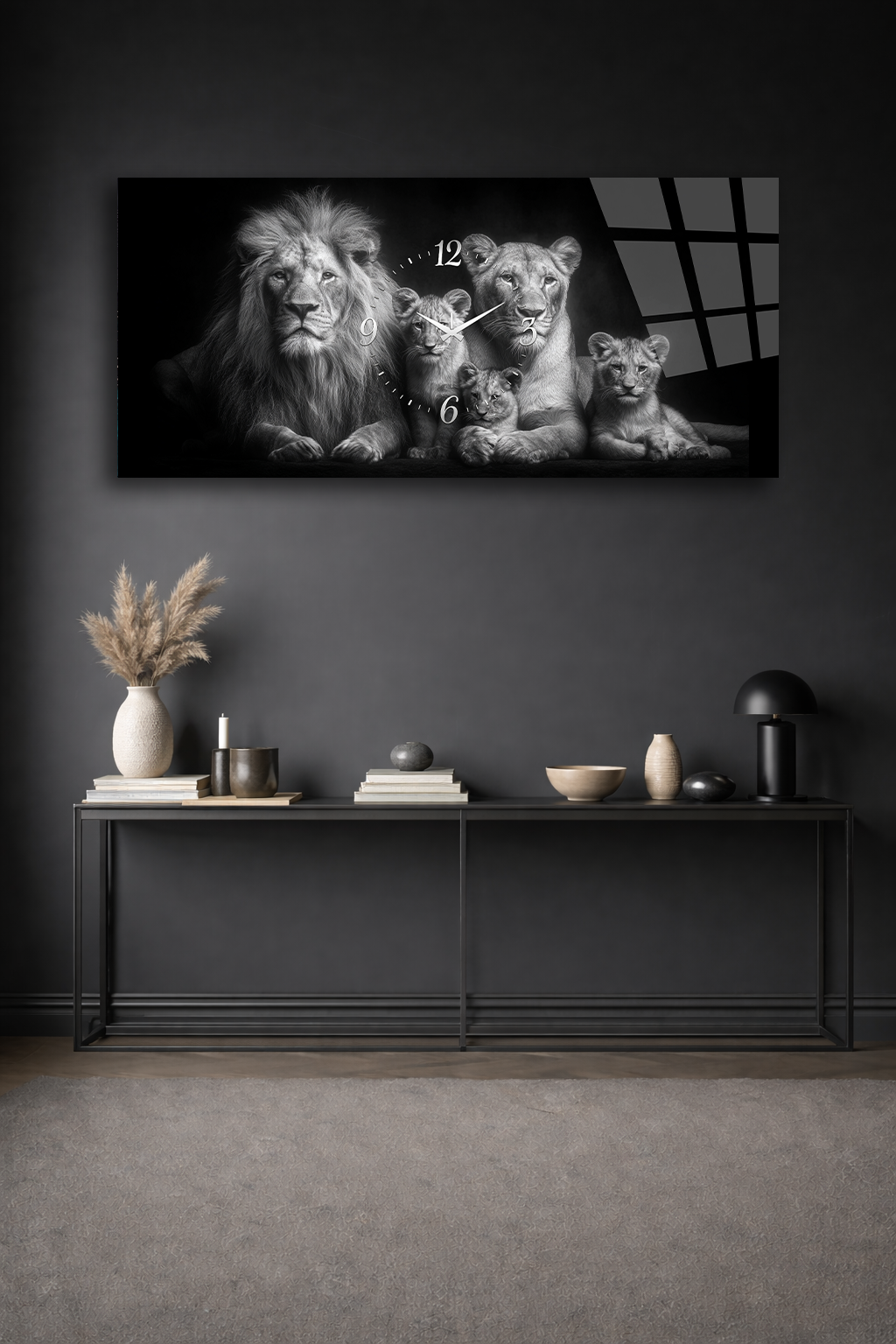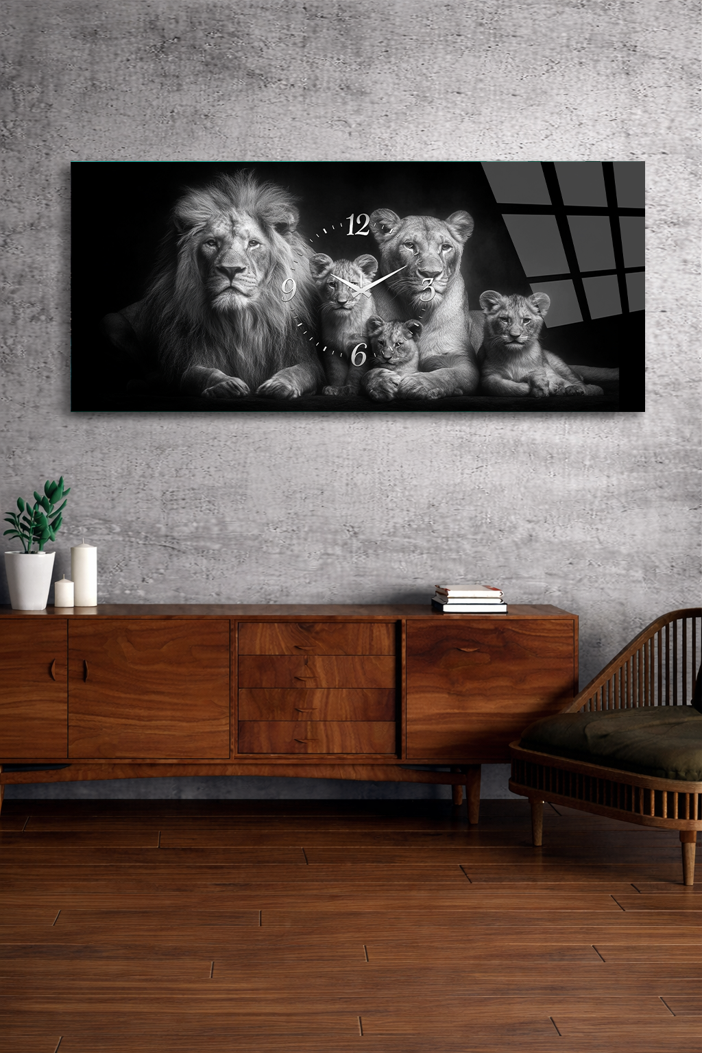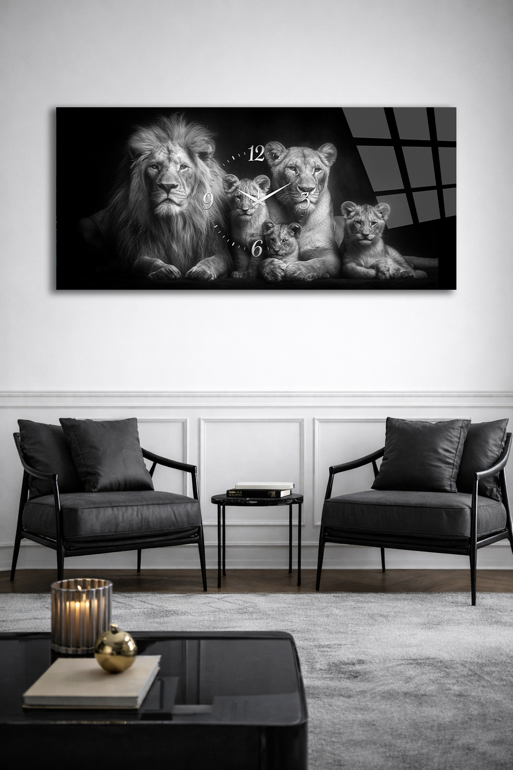 KIRILMAZ CAM DUVAR SAATİ , HEM TABLO HEM SAAT ASLAN AİLESİ SİYAH BEYAZ TASARIM EV OFİS HEDİYESİ
