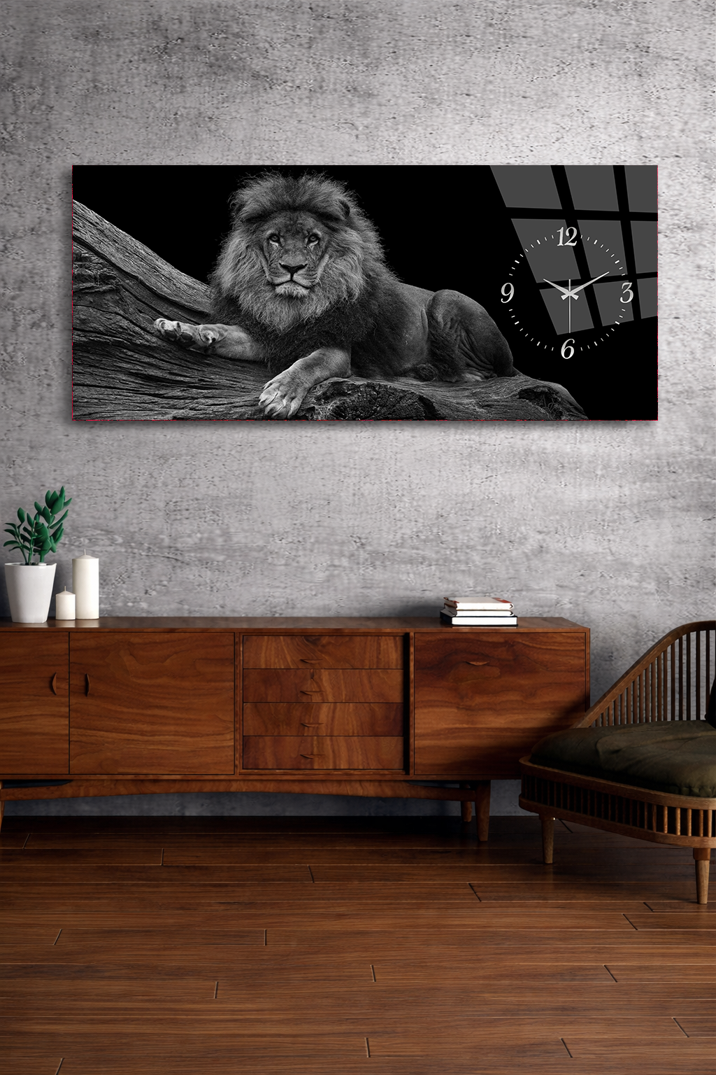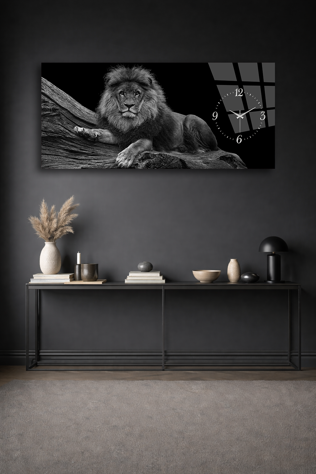KIRILMAZ CAM DUVAR SAATİ , HEM TABLO HEM SAAT ASLAN FİGÜRLÜ SİYAH BEYAZ EV OFİS HEDİYESİ
