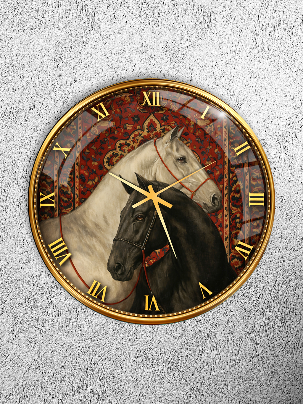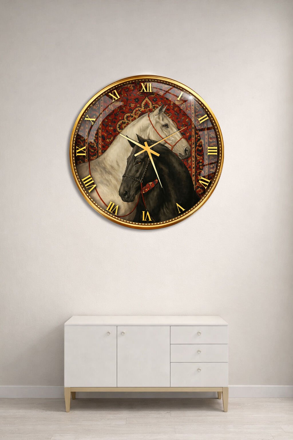KIRILMAZ CAM DUVAR SAATİ, HEM TABLO HEM SAAT AT DESENLİ OSMANLI HALI ZEMİN TASARIM EV OFİS HEDİYESİ