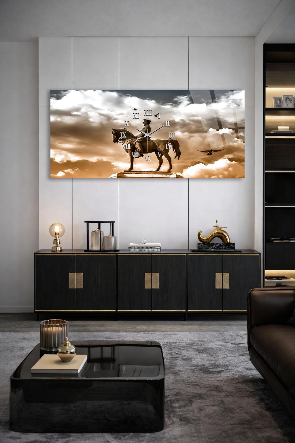 KIRILMAZ CAM DUVAR SAATİ , HEM TABLO HEM SAAT ATATÜRK HEYKELİ TEMALI EV OFİS HEDİYESİ