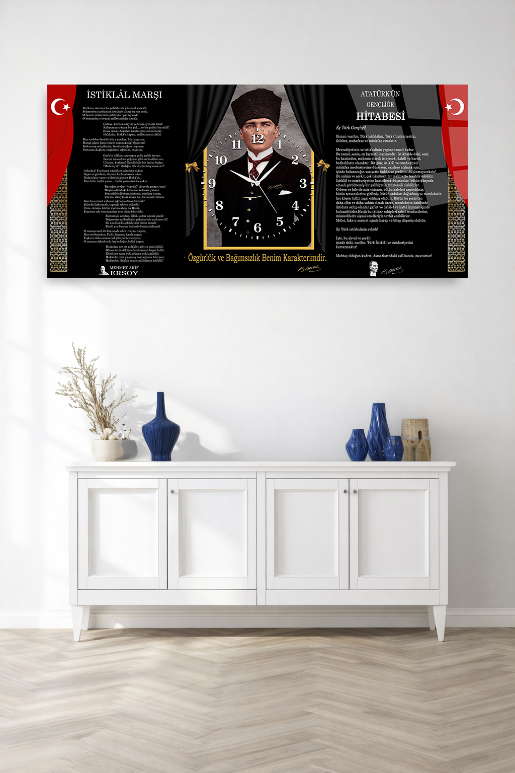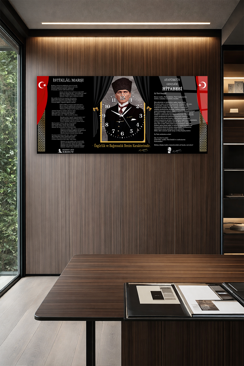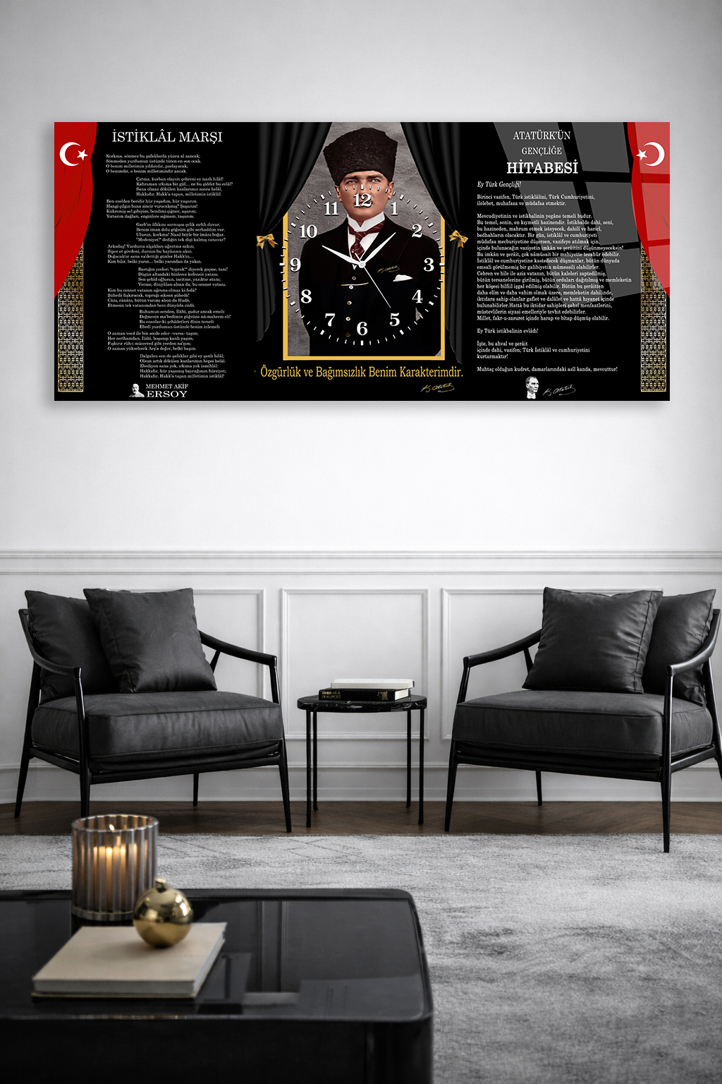 KIRILMAZ CAM DUVAR SAATİ , HEM TABLO HEM SAAT ATATÜRK İMZALI İSTİKLAL MARŞI EV OFİS HEDİYESİ