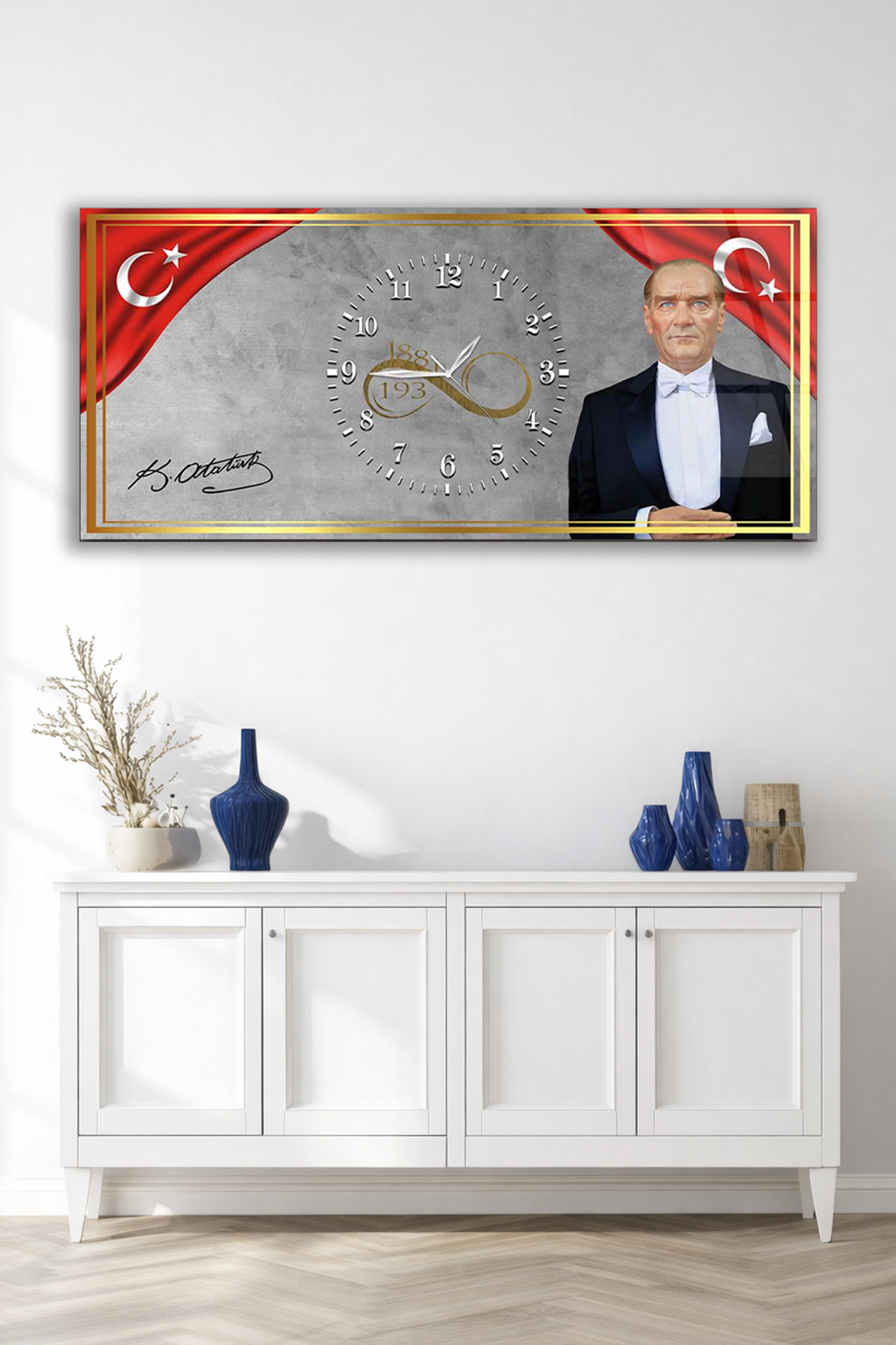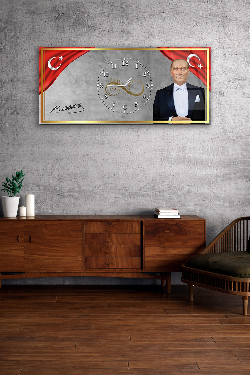KIRILMAZ CAM DUVAR SAATİ , HEM TABLO HEM SAAT ATATÜRK İMZALI ŞIK TASARIM EV OFİS HEDİYESİ
