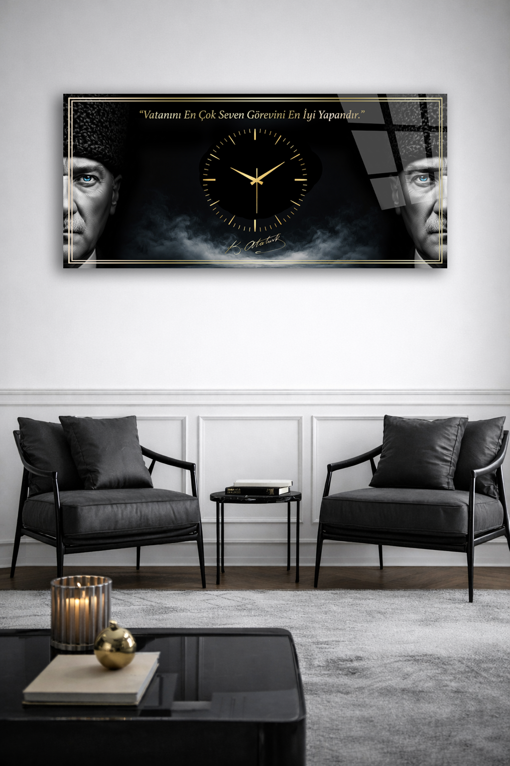 KIRILMAZ CAM DUVAR SAATİ , HEM TABLO HEM SAAT ATATÜRK İMZALI SİYAH GOLD EV OFİS HEDİYESİ