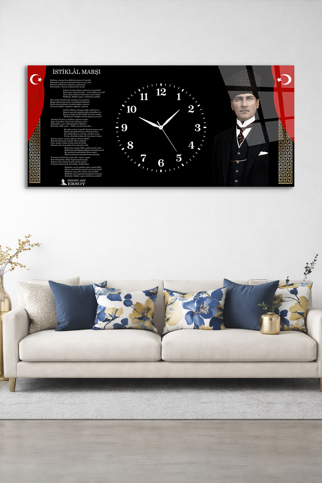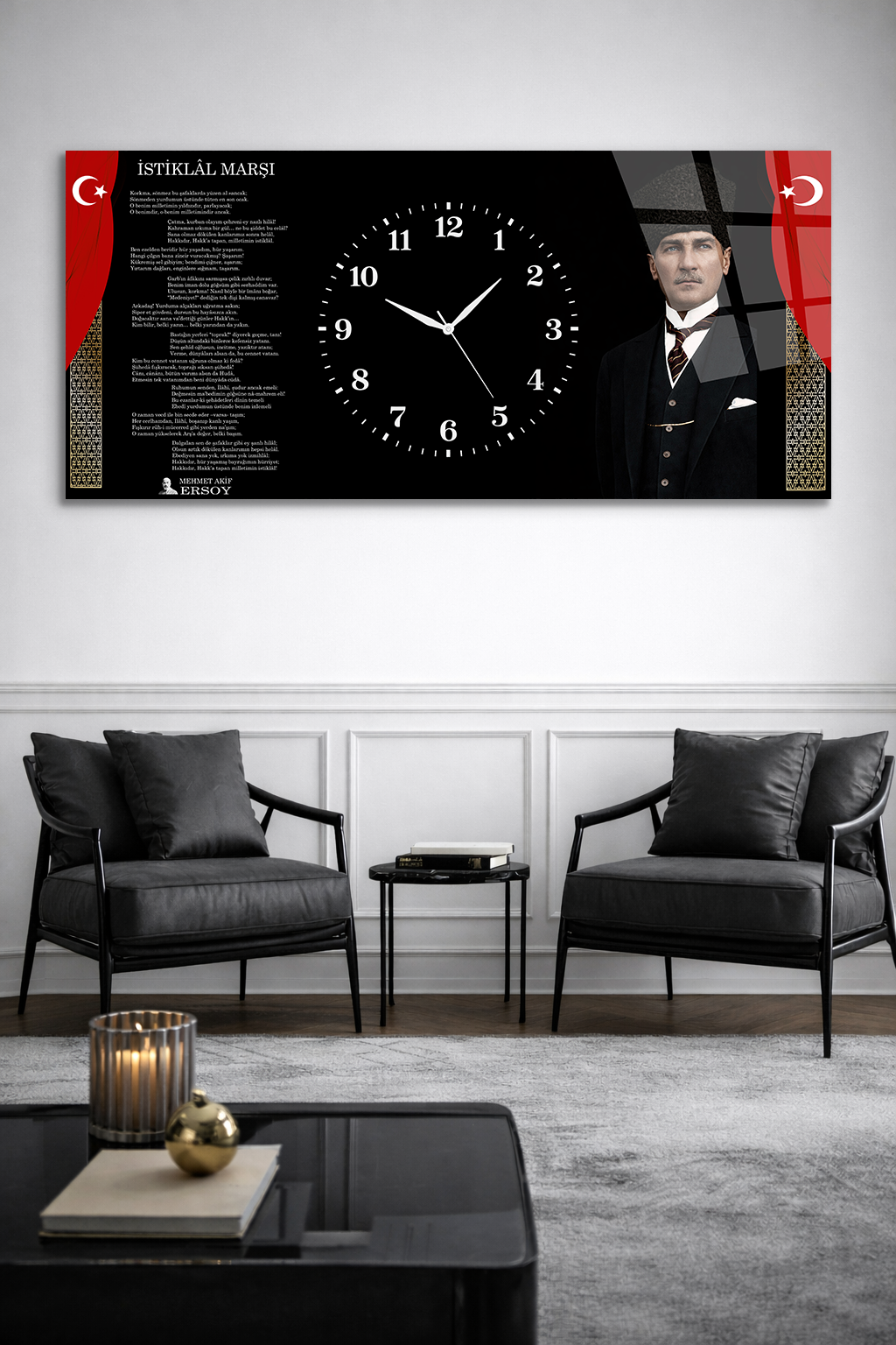 KIRILMAZ CAM DUVAR SAATİ , HEM TABLO HEM SAAT ATATÜRK İSTİKLAL MARŞI EV OFİS HEDİYESİ