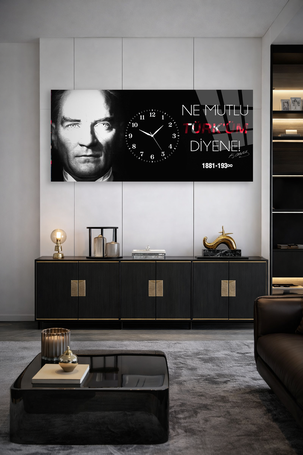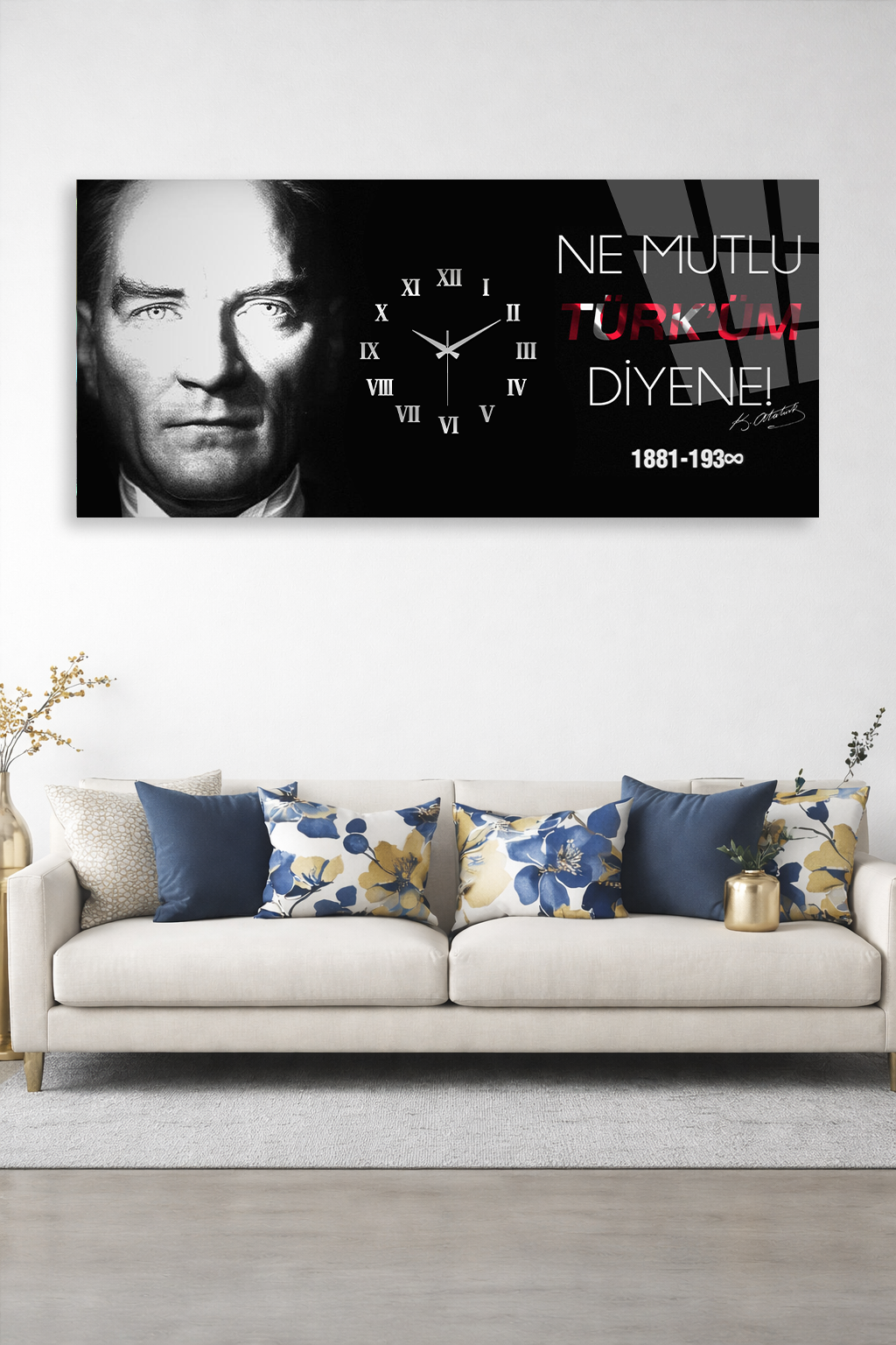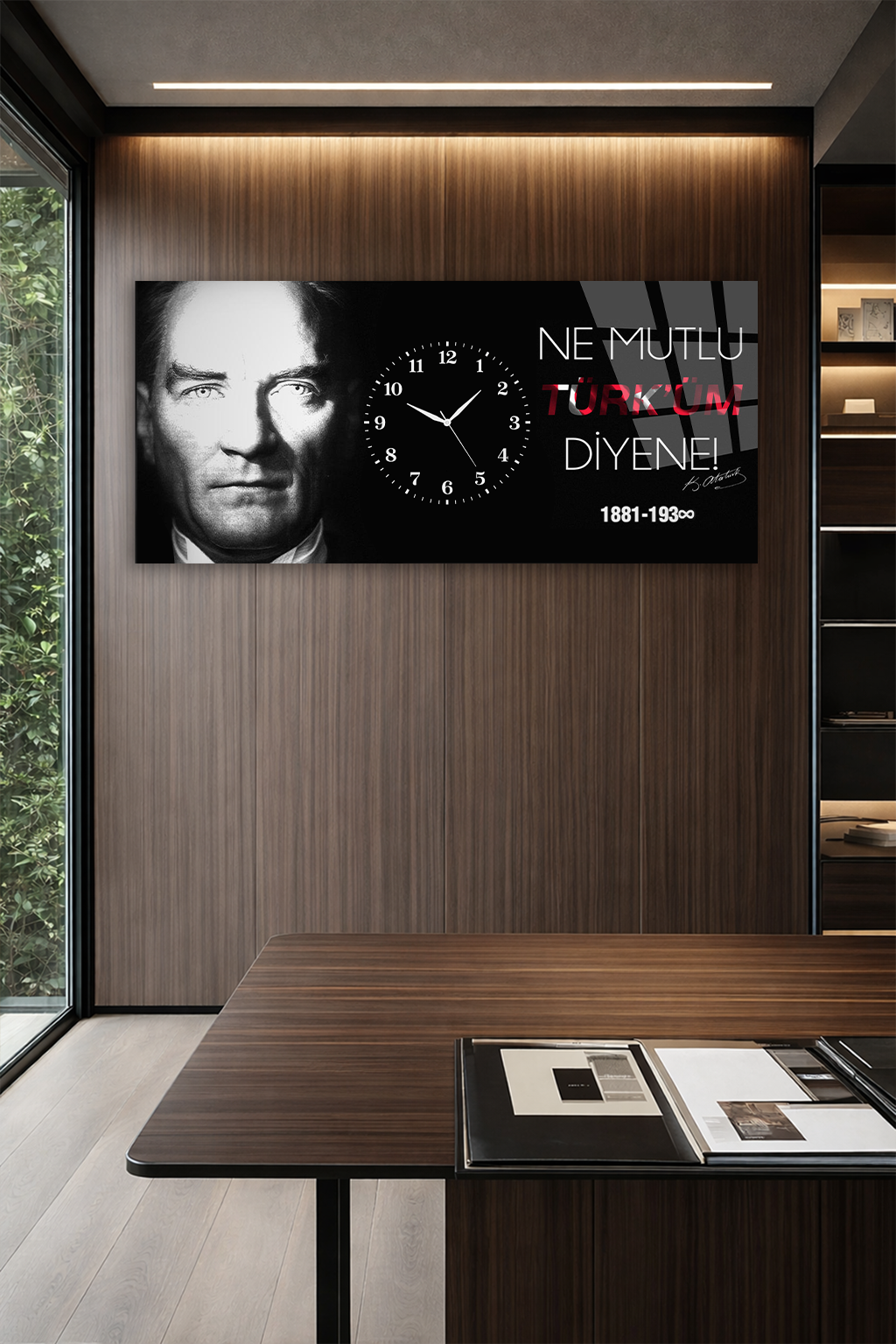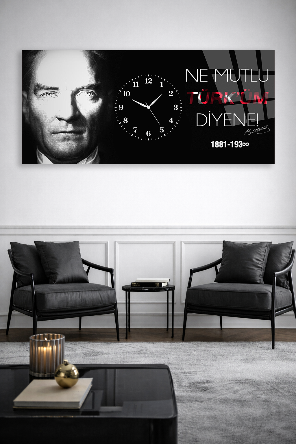 KIRILMAZ CAM DUVAR SAATİ , HEM TABLO HEM SAAT ATATÜRK NE MUTLU TÜRKÜM DİYENE EV OFİS HEDİYESİ