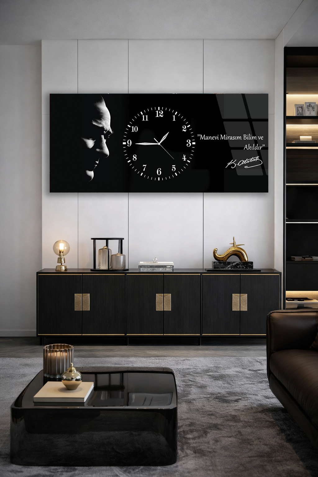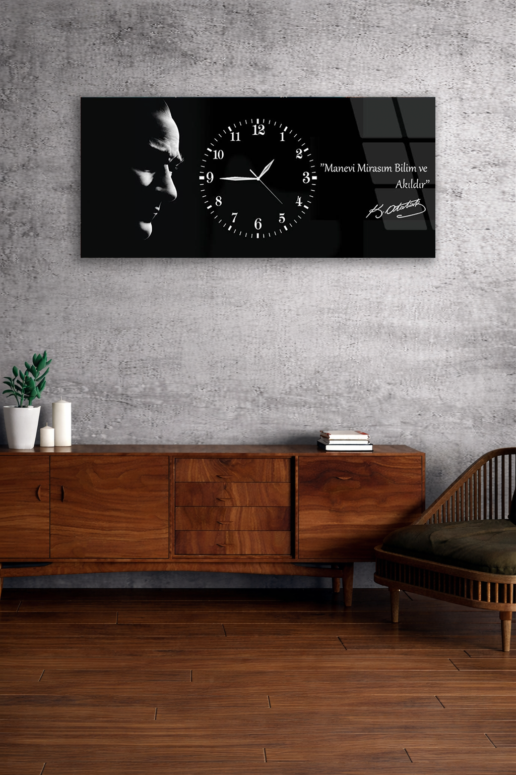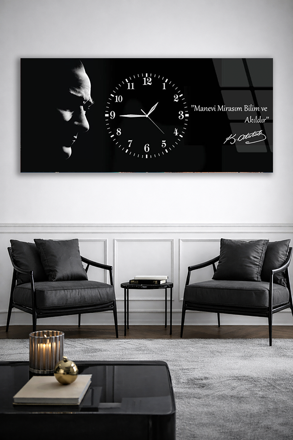 KIRILMAZ CAM DUVAR SAATİ , HEM TABLO HEM SAAT ATATÜRK SİYAH BEYAZ PORTRE EV OFİS HEDİYESİ