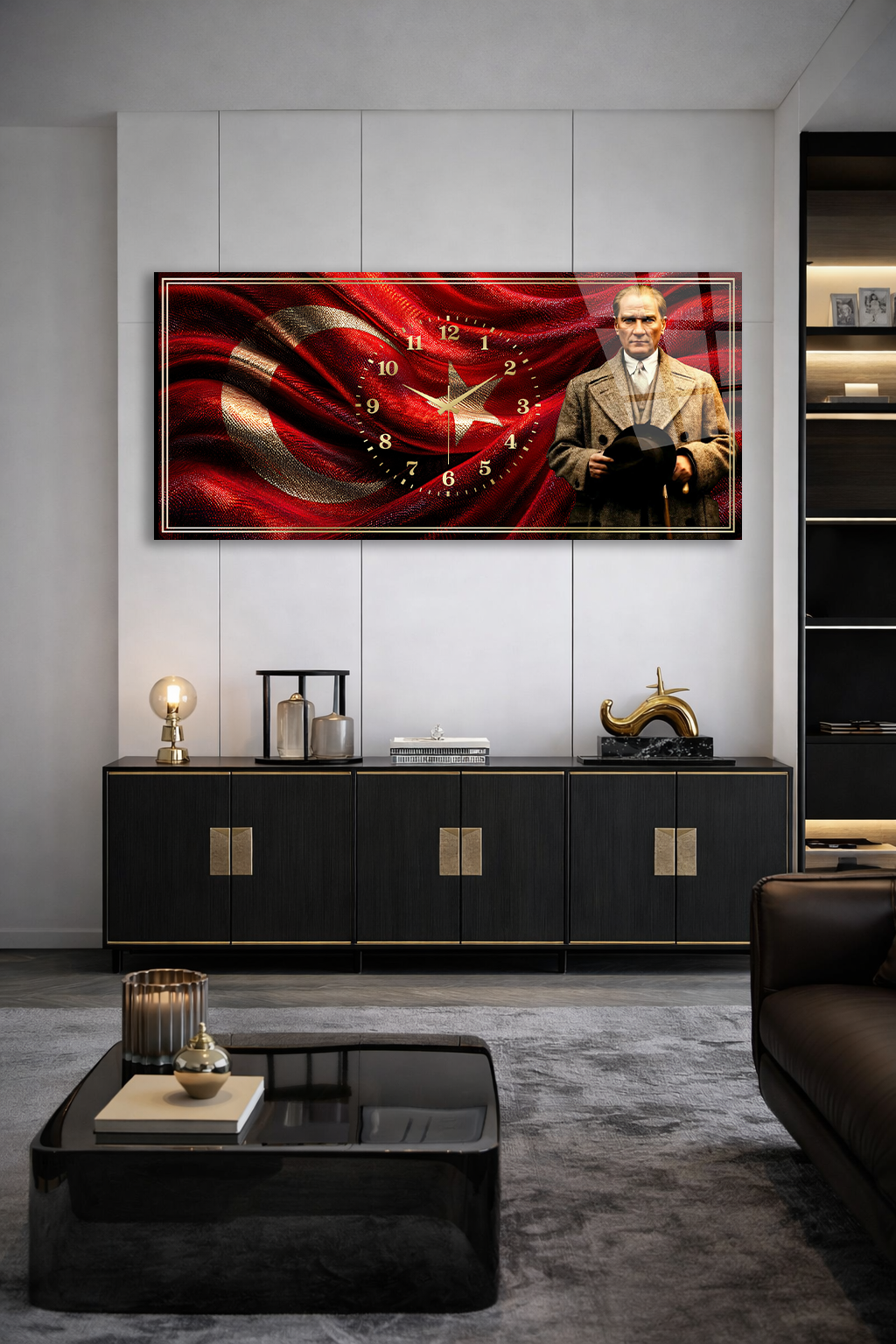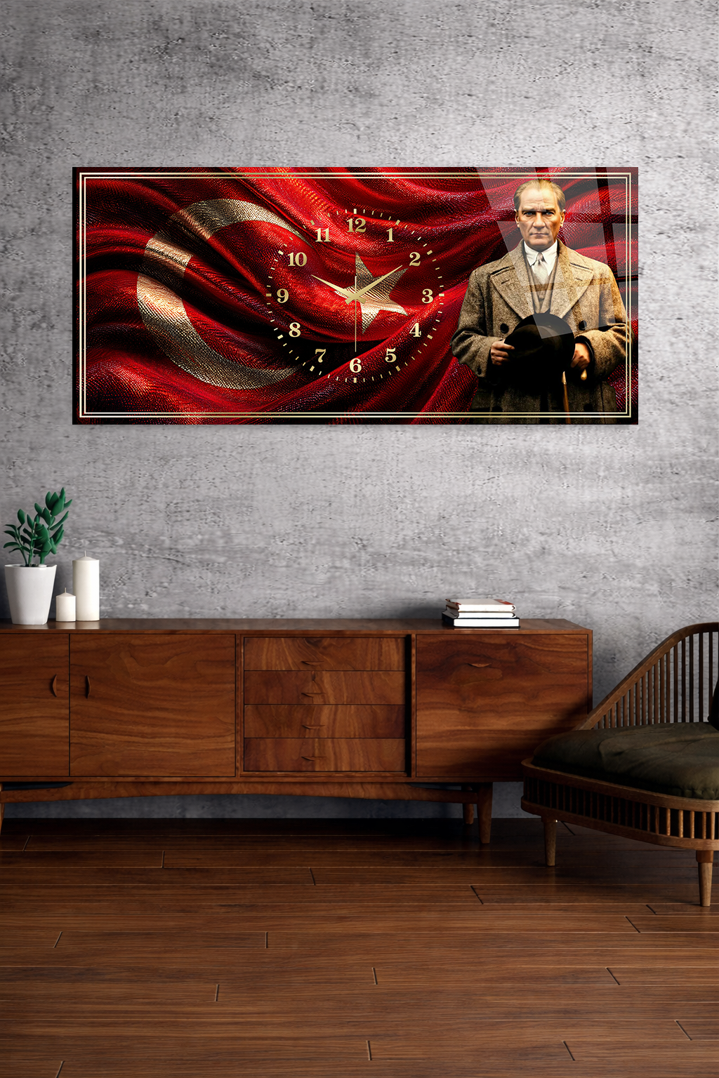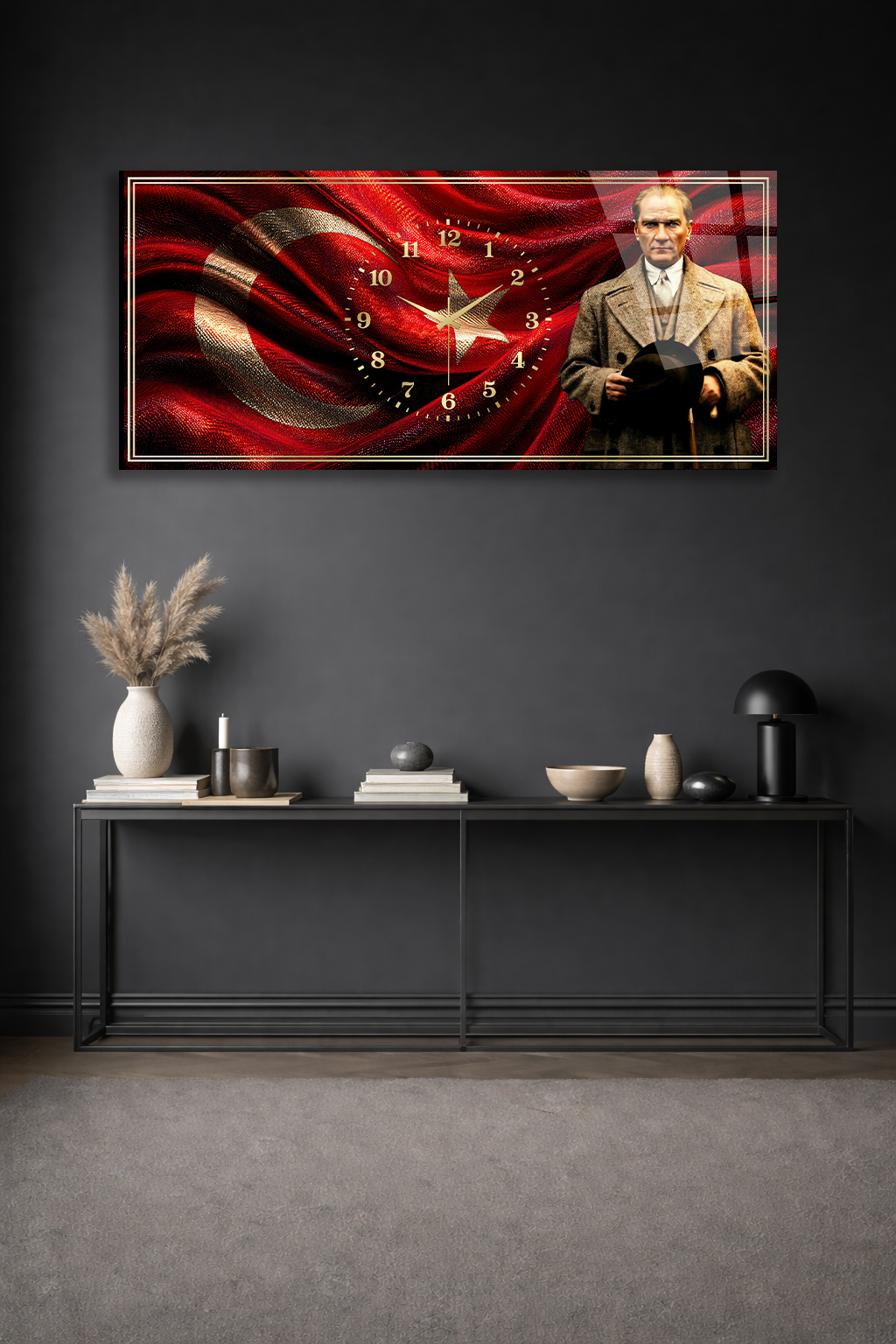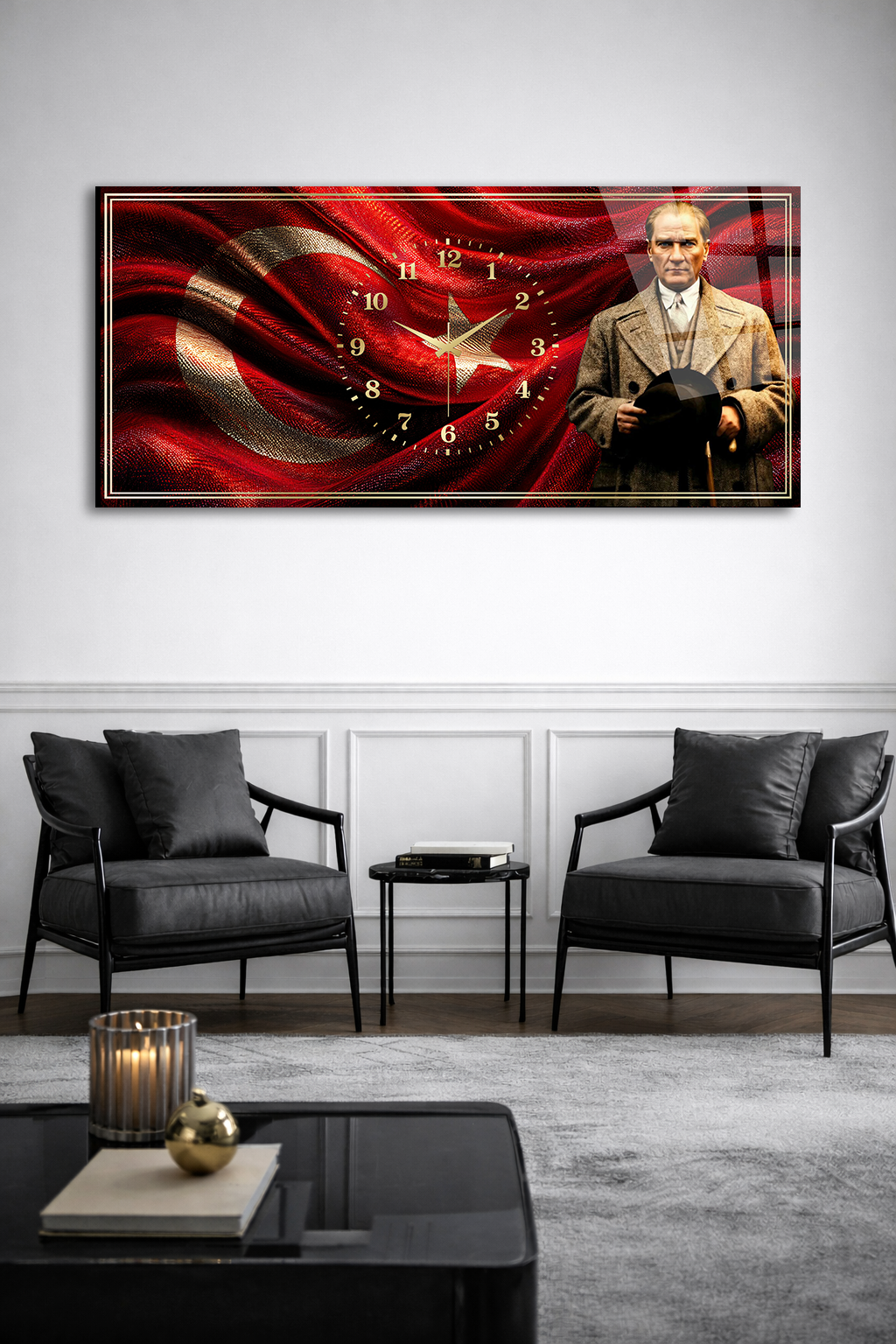 KIRILMAZ CAM DUVAR SAATİ , HEM TABLO HEM SAAT ATATÜRK VE TÜRK BAYRAĞI TASARIM EV OFİS HEDİYESİ