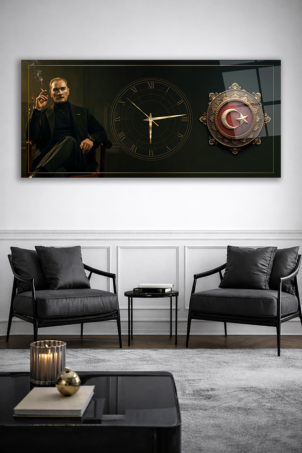KIRILMAZ CAM DUVAR SAATİ , HEM TABLO HEM SAAT ATATÜRK VE TÜRK BAYRAĞI TASARIMI ŞIK EV OFİS HEDİYESİ
