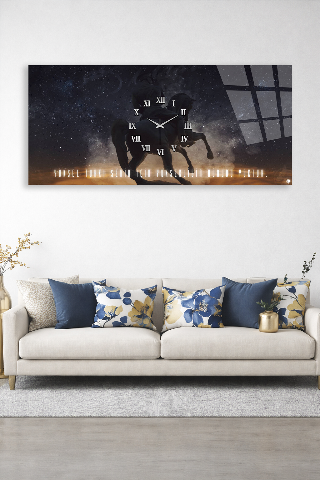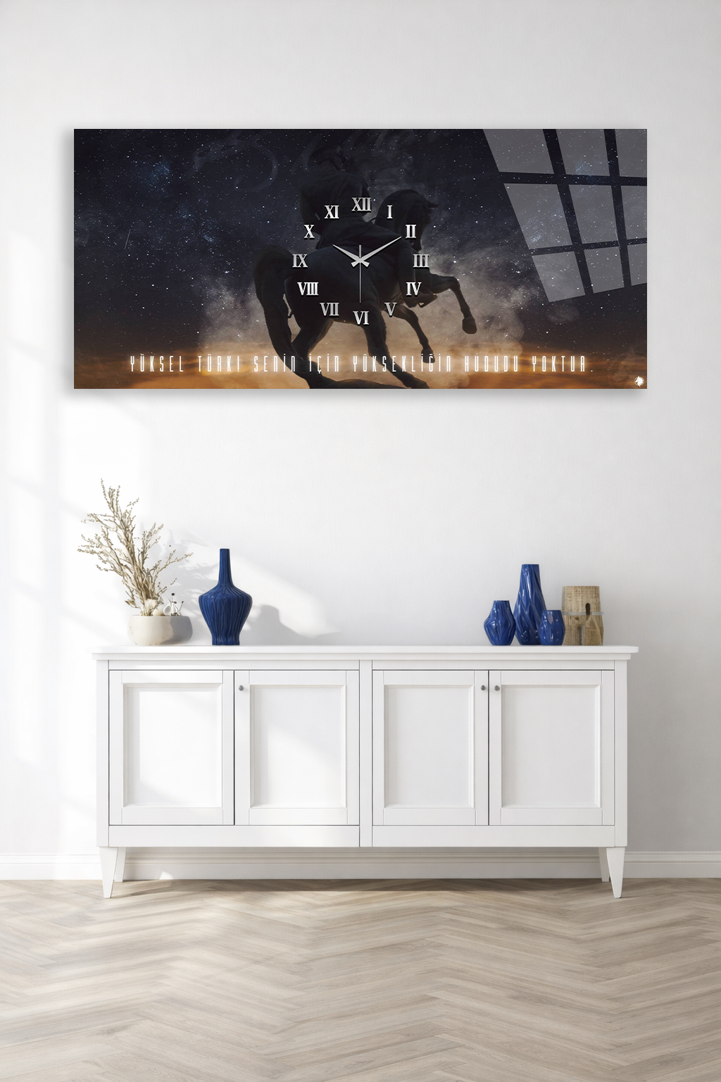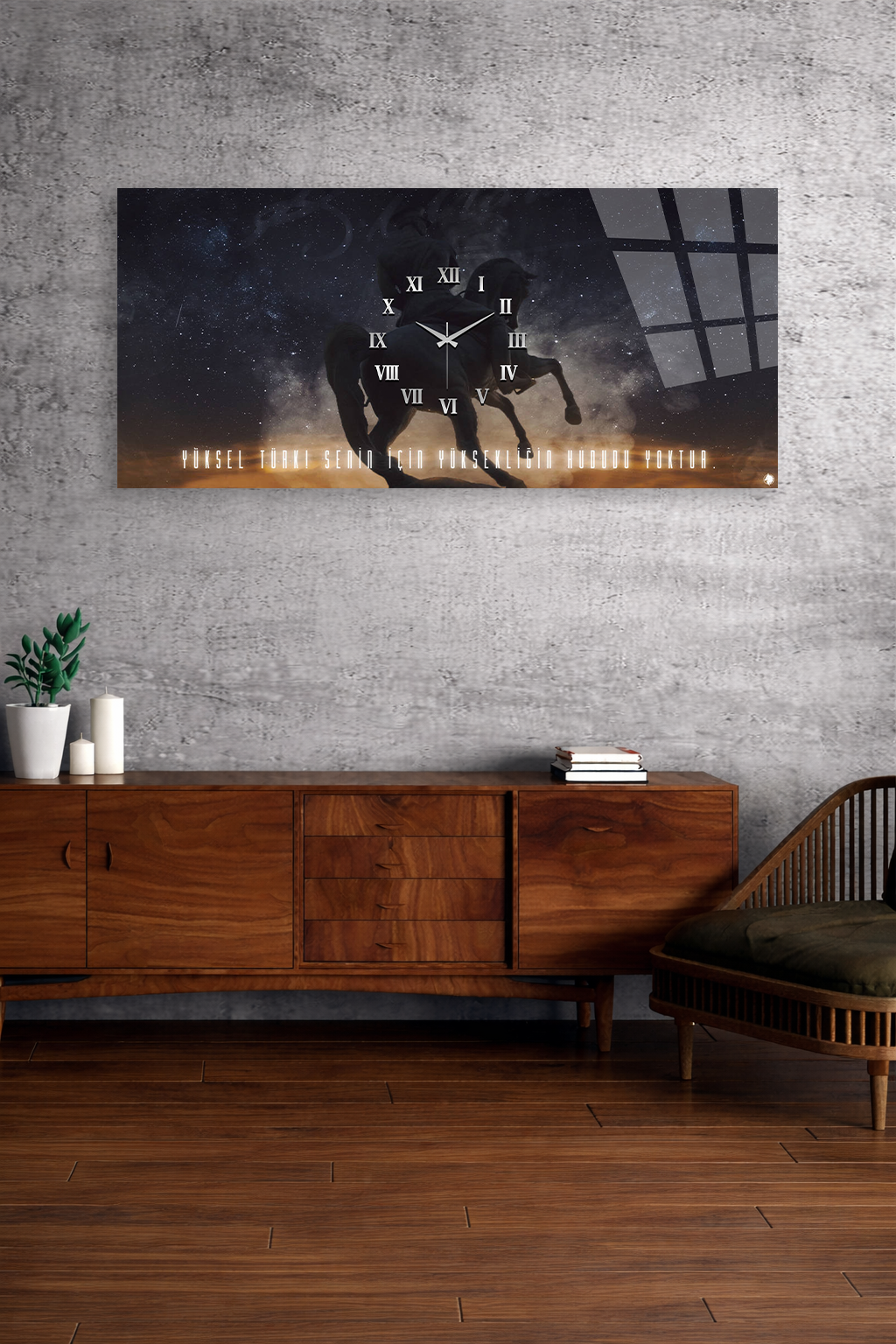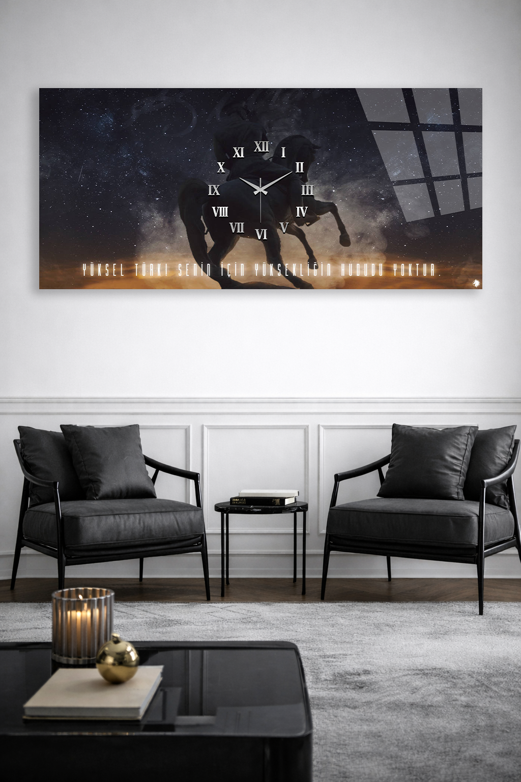 KIRILMAZ CAM DUVAR SAATİ , HEM TABLO HEM SAAT ATLI MOTİVASYON TASARIM EV OFİS HEDİYESİ