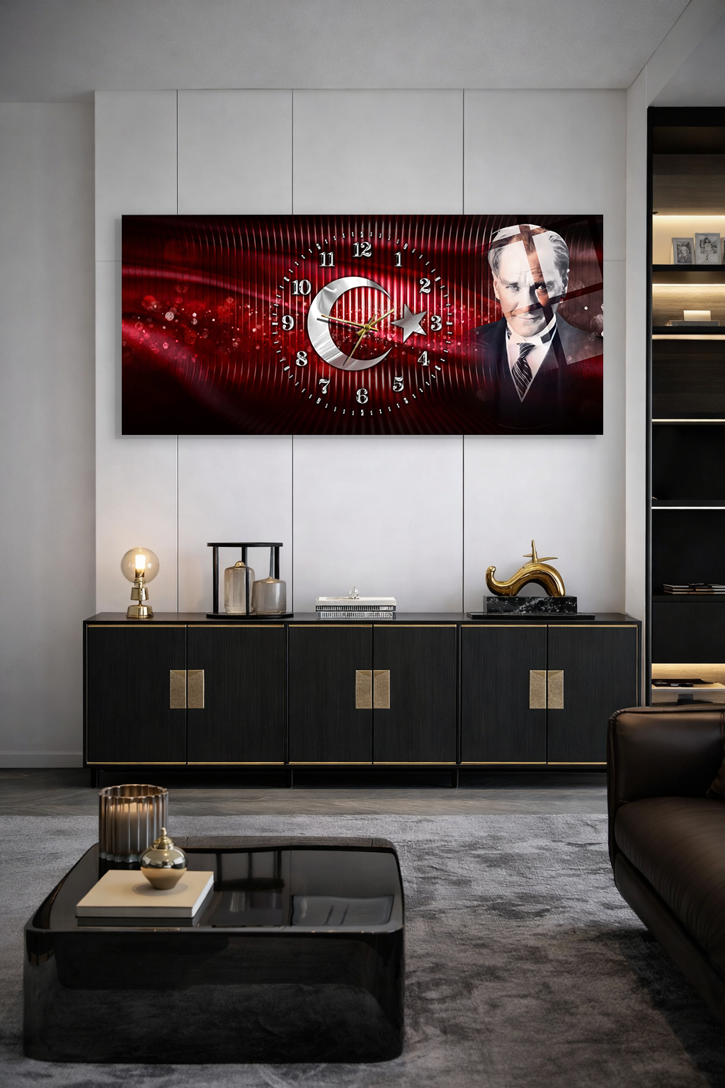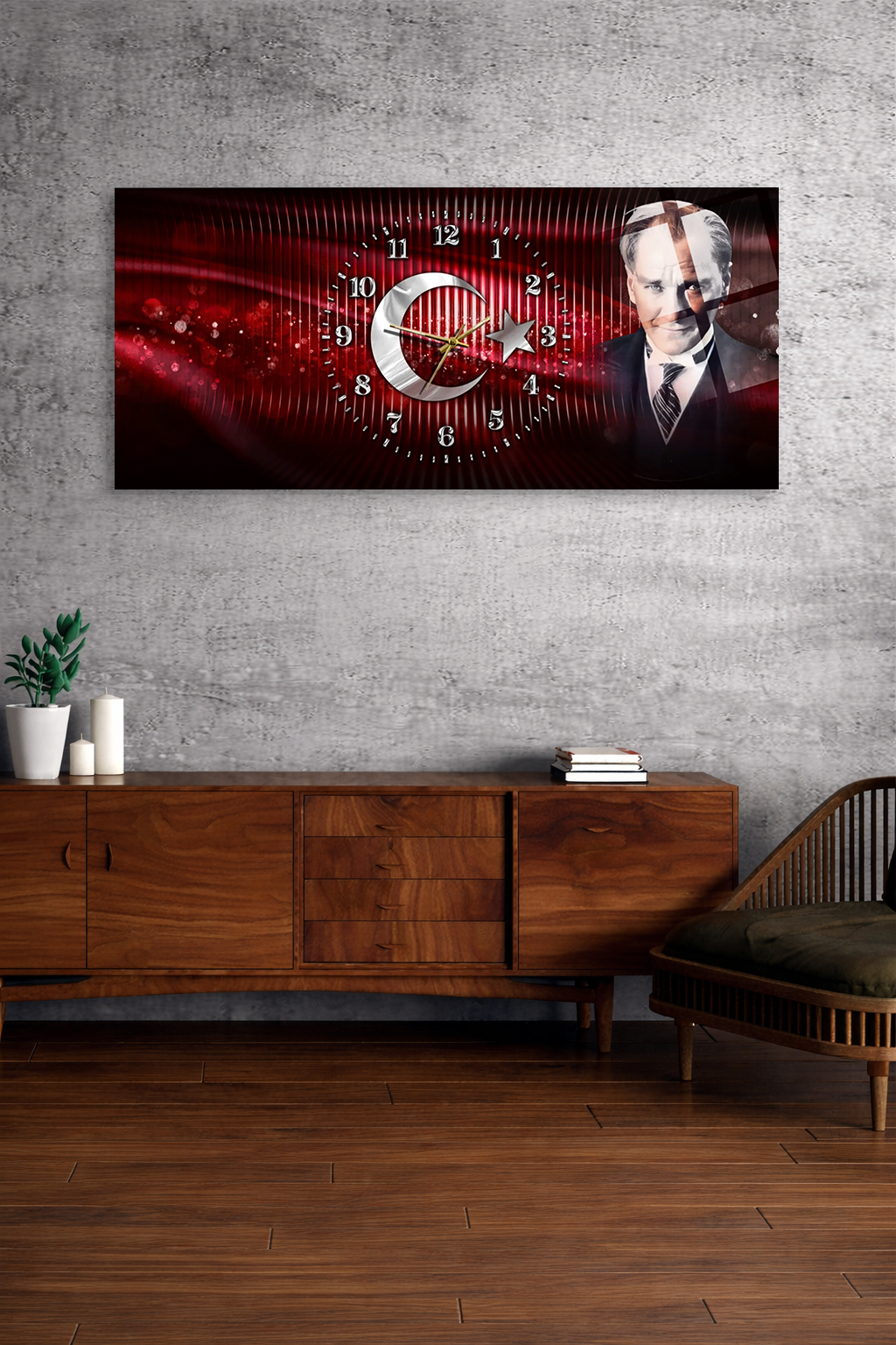 KIRILMAZ CAM DUVAR SAATİ , HEM TABLO HEM SAAT AY YILDIZ VE ATATÜRK TEMALI EV OFİS HEDİYESİ
