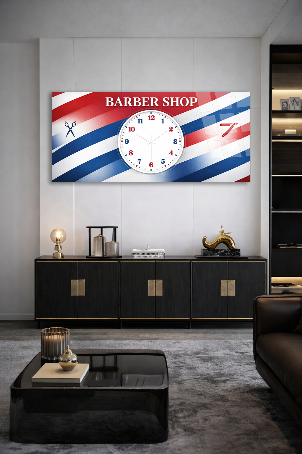 KIRILMAZ CAM DUVAR SAATİ , HEM TABLO HEM SAAT BARBER SHOP KLASİK TASARIM EV OFİS HEDİYESİ
