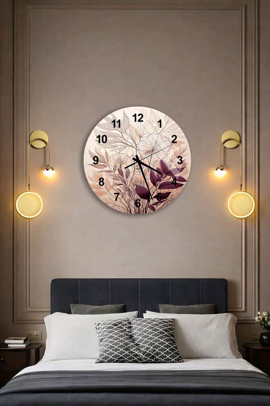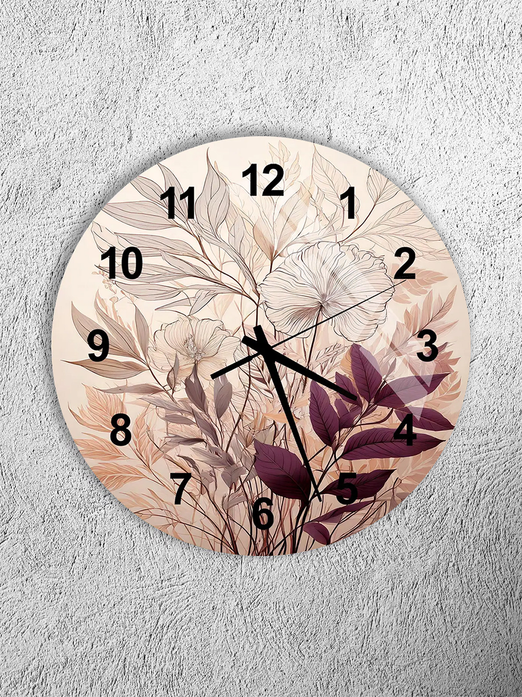 KIRILMAZ CAM DUVAR SAATİ, HEM TABLO HEM SAAT BEJ TONLARDA ÇİÇEK DESENLİ ZARİF TASARIM EV OFİS HEDİYESİ
