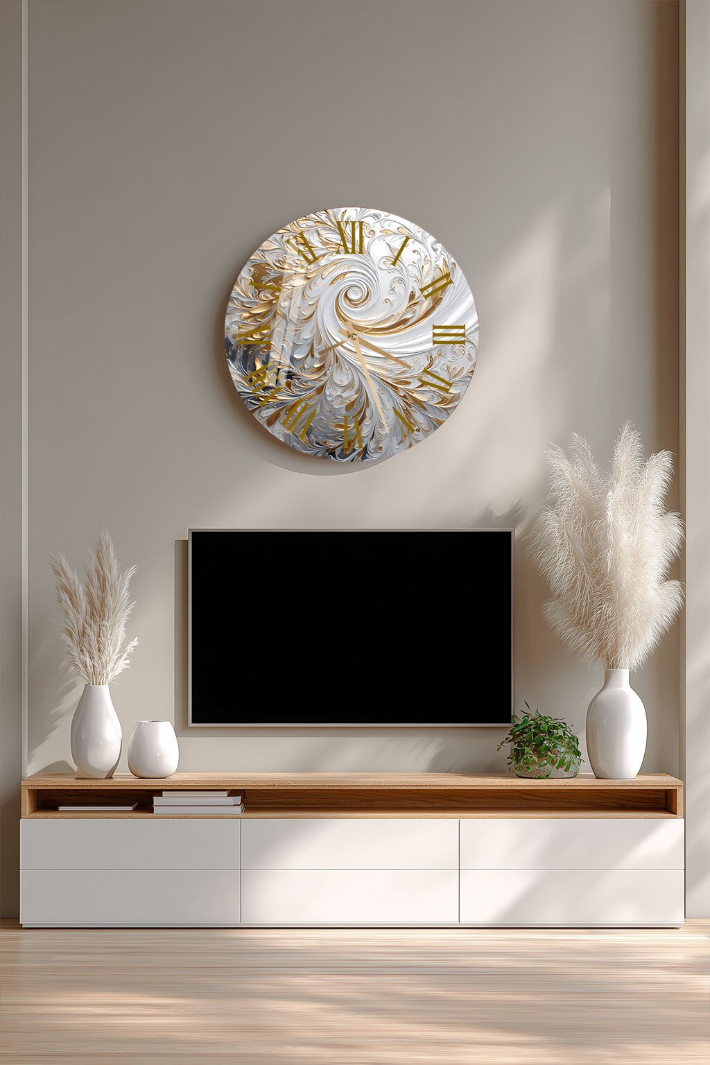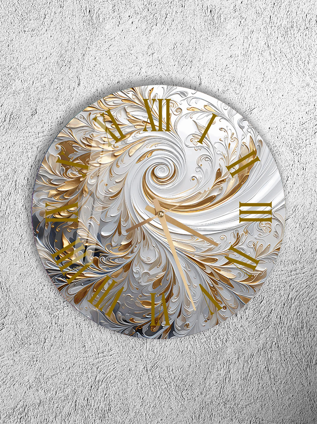 KIRILMAZ CAM DUVAR SAATİ, HEM TABLO HEM SAAT BEYAZ ALTIN SPİRAL LÜKS SANATSAL TASARIM EV OFİS HEDİYESİ