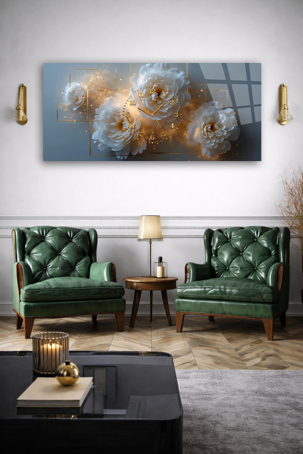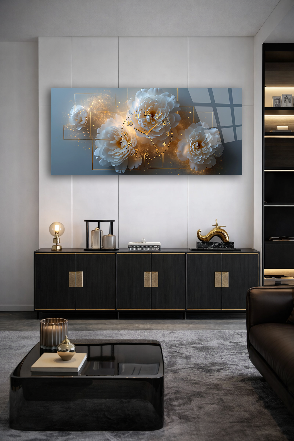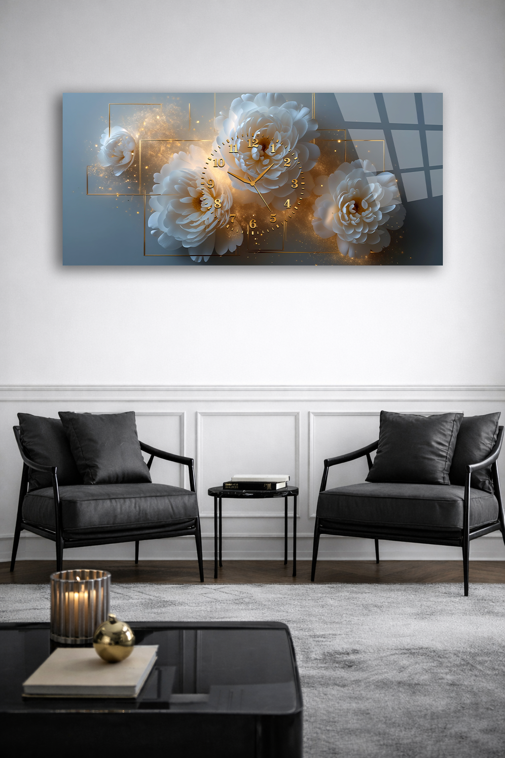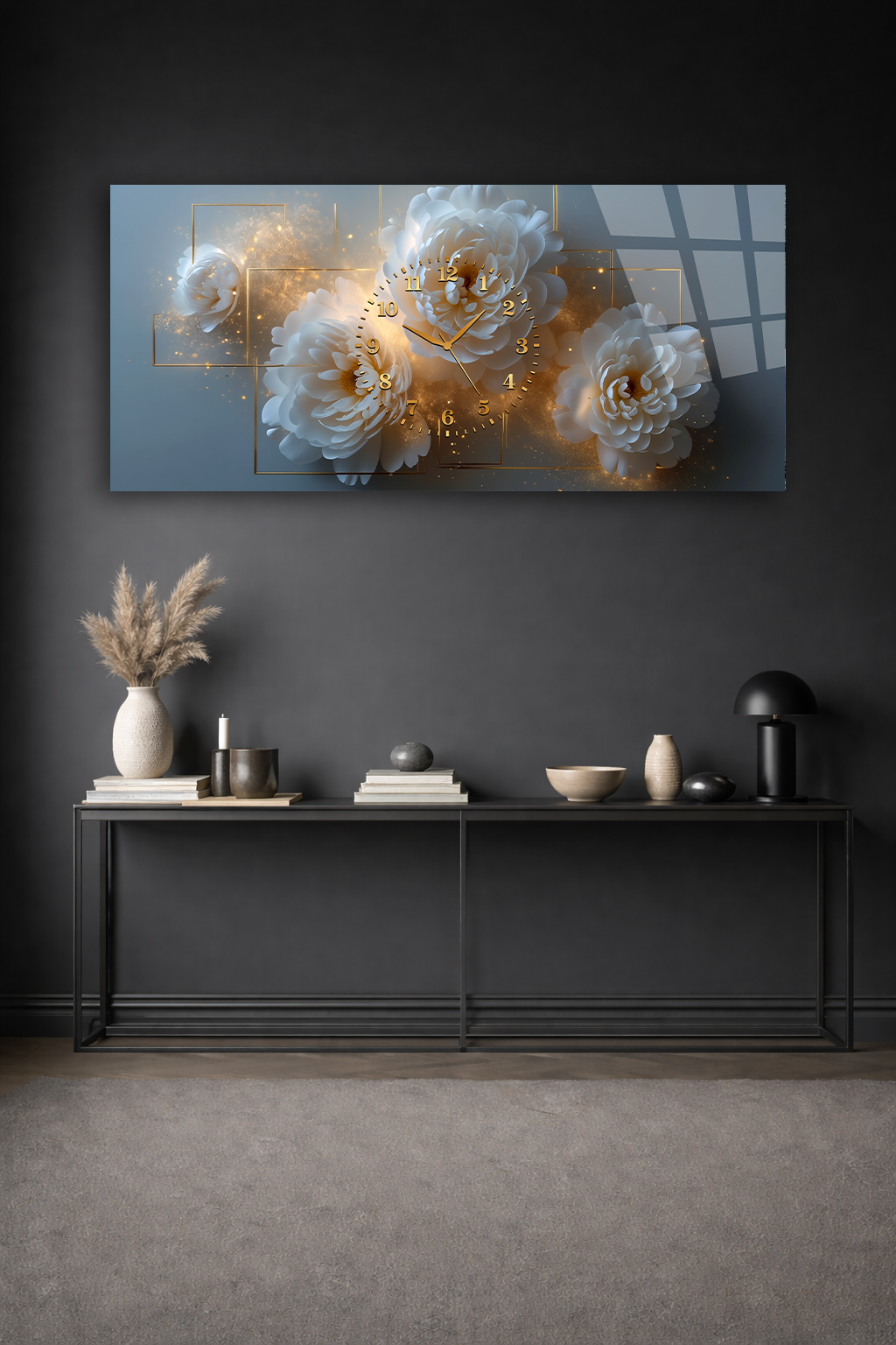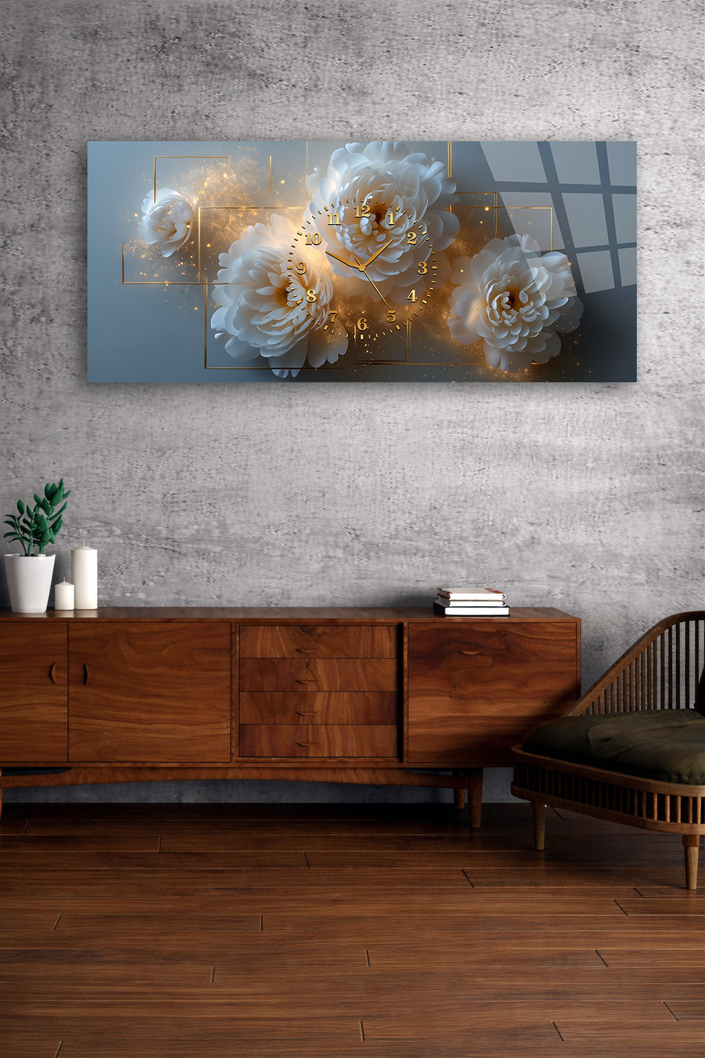 KIRILMAZ CAM DUVAR SAATİ , HEM TABLO HEM SAAT BEYAZ ÇİÇEK ALTIN DETAY EV OFİS HEDİYESİ