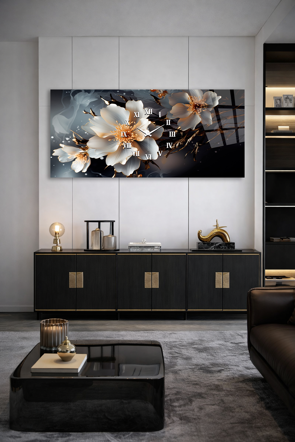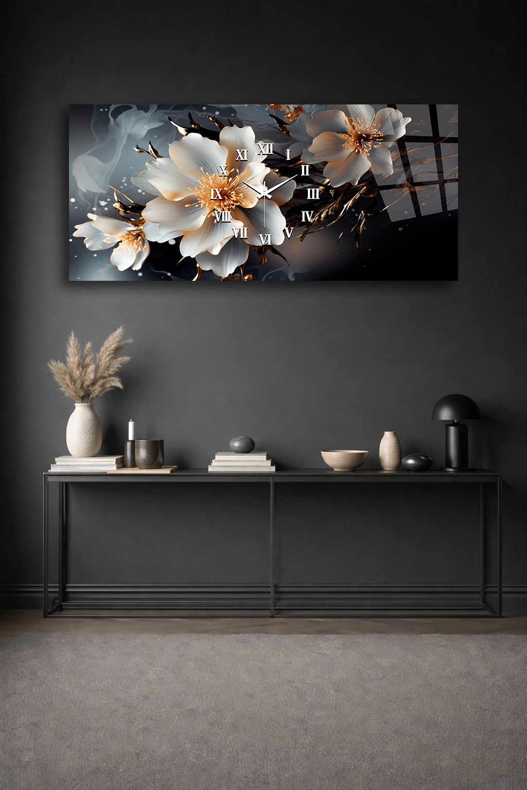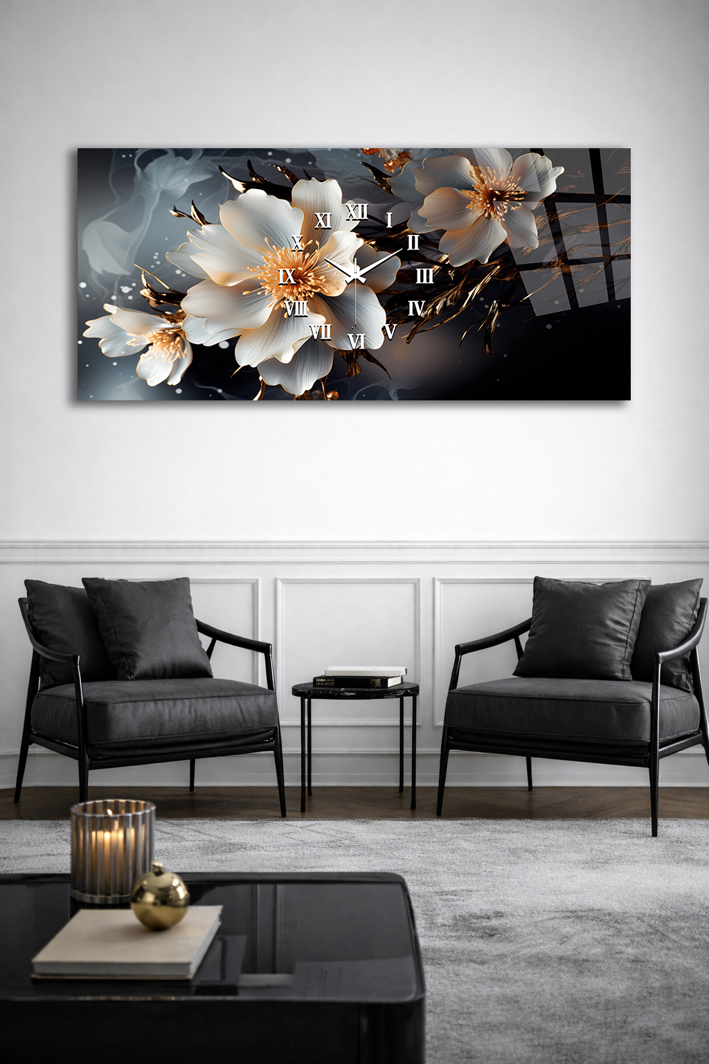 KIRILMAZ CAM DUVAR SAATİ , HEM TABLO HEM SAAT BEYAZ ÇİÇEK ALTIN DETAYLI TASARIM EV OFİS HEDİYESİ