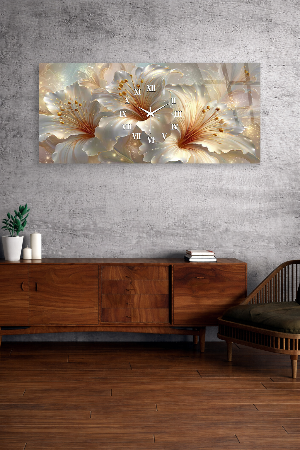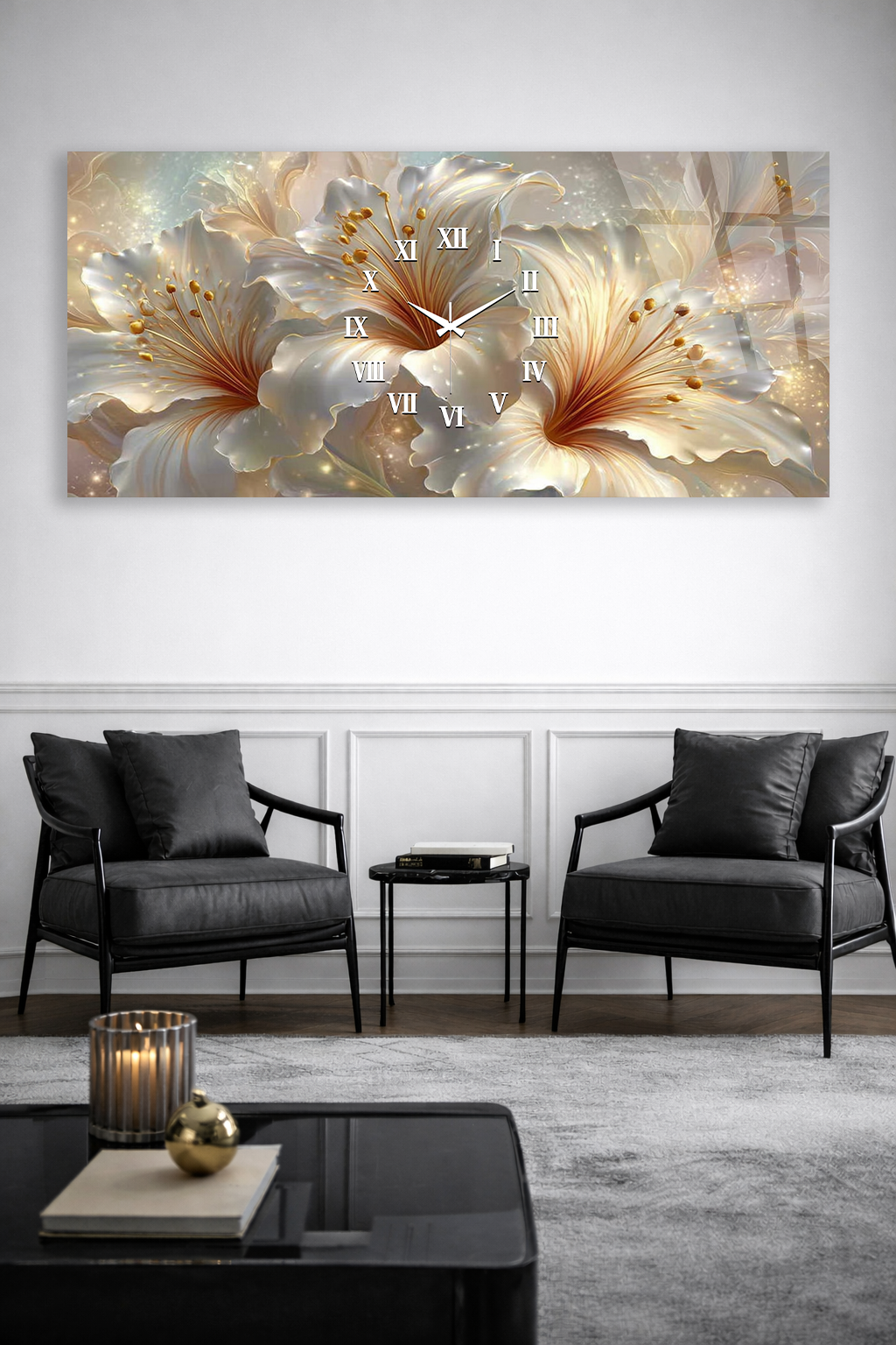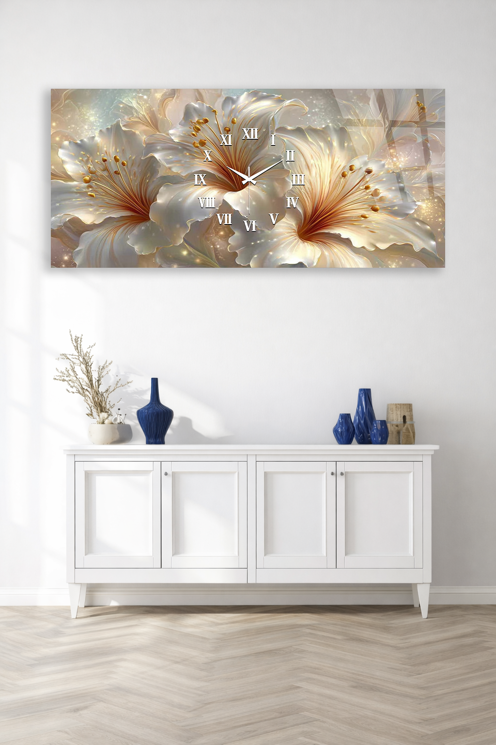 KIRILMAZ CAM DUVAR SAATİ , HEM TABLO HEM SAAT BEYAZ ÇİÇEKLİ ZARİF DUVAR DEKORU EV OFİS HEDİYESİ